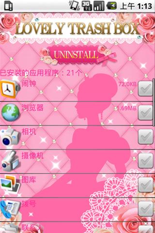 Are you getting bored no those simple delete apps? No matter how useful, the outlook is very important ......... The glittering accessories, pink roses ♥ ♥ This LOVELY TRASH BOX have all the elements girls like (* '∀ `*) Uninstall unwanted apps all at once! Cute and convenient shortcuts on your home screen! To install and show it to your friends ♥ [Instructions] Launch the app ▼ Check unwanted apps ▼ Touch the Uninstall button. ▼ Done! ■ Support Much as we'd like to it's almost impossible to build an app that supports all android phones. But with your help, we'll try. Please help us make this app better by sending bug reports to "[email protected]". We might ask you additional question for your help. Don't forget to include your phone model and your Android OS. Thank you so much!