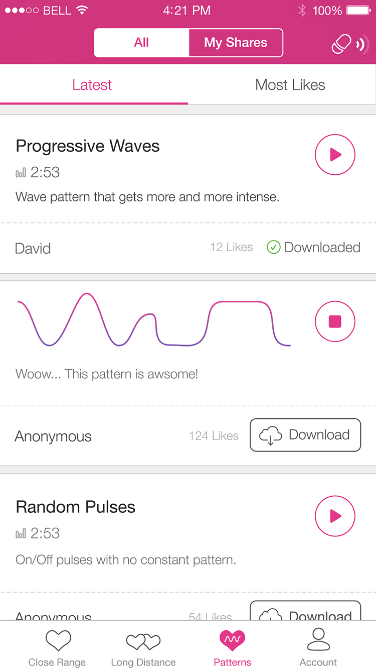 Features include: local remote control, long distance control, music based vibrations, creating and sharing patterns, sending patterns syncing two toys together, sound activated vibrations.