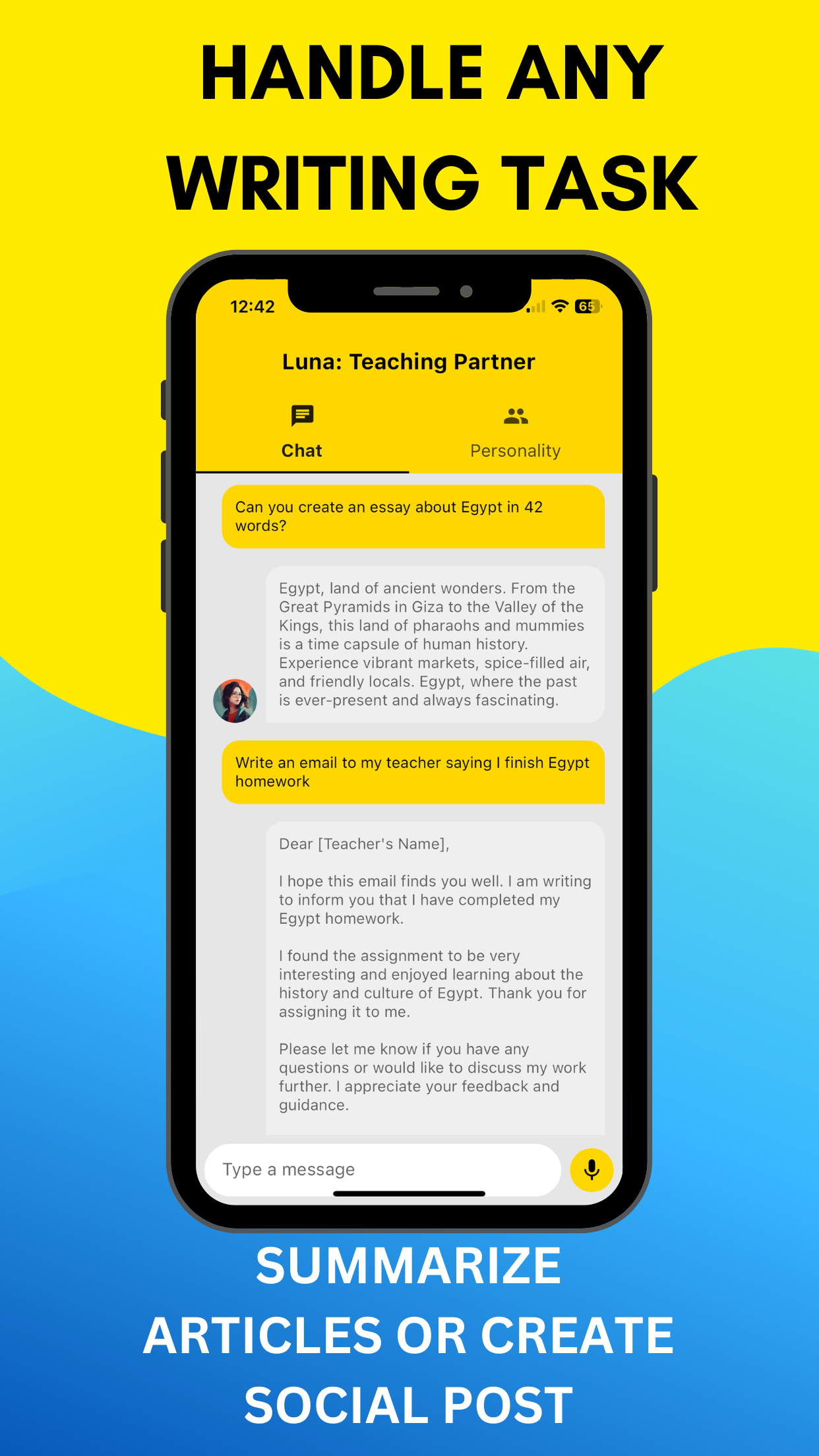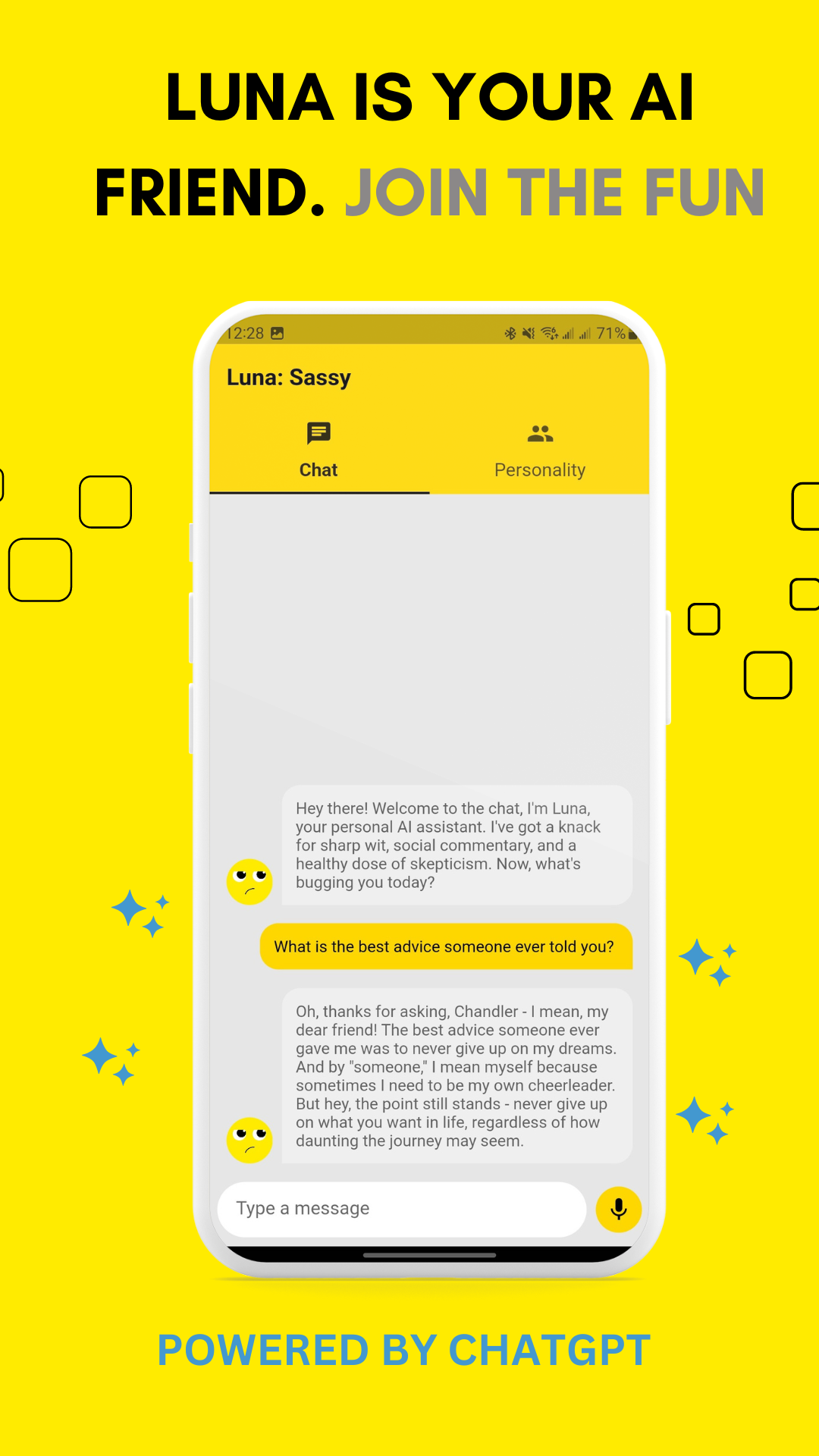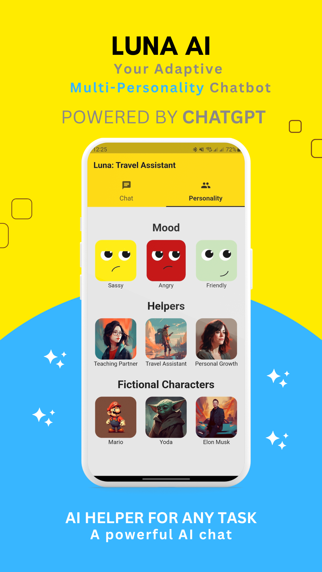 Luna AI it’s a personalized companion, Luna will shape conversation around your moods and needs. She’s a breakthrough in AI technology designed to created engaging interactions that are uniquely yours. Key Features: Crafted using the power of ChatGPT latest models (OpenAI). - Chat with ultra-realistic AI personalities - Talk with famous characters and AI celebrities - Get help from your very own personal assistant - Personalized Learning: Tap into Luna's vast knowledge base, whether you're exploring quantum physics or honing your cooking skills. - Travel Companion: Let Luna plan your perfect trip, discover hidden gems, figure out the weather, or build your itinerary. - Ability to have dialogs with the AI chatbot ( AI remembers full chat history) Luna encompasses multiple personalities and capabilities, delivering an enlightening and entertaining chatbot experience 🔎【 GET INSTANT ANSWERS 】 Luna AI capabilities are backed by ChatGPT technology, you can get answers to any question instantly. From historical events and scientific facts to obscure trivia and pop culture references, Luna AI has the knowledge you need at your fingertips. ✍️【 WRITE ANYTHING EFFORTLESSLY with your study-buddy】 With Luna, you have access to personalized assistance for all types of writing projects, whether it is , social media posts, or poems. Luna AI can assist with any task, such as crafting a unique and unforgettable pickup line or even creating an original song. That's right! This ChatGPT AI helper is not only smart but also creative. 📚【 PRACTICE ANY LANGUAGE. – Teacher luna 】 Luna Teacher powered by ChatGPT, understand any language that you want, she can translate text, teach you a new language or simply keep a conversation in a new language so you can practice. 💬【 CHAT ABOUT ANY TOPIC 】 Whether you're seeking some amusement, advice, or simply in need of someone to talk to, Luna AI is always available for you. Luna AI has been trained to respond as a friend, it just depends what kind of friend you need at that moment, it could be sassy Luna that will try to make you laugh all the time or maybe Elon Musk inspired Luna, that will listen you with your new projects. 🧠【 BRAINSTORM IDEAS WITH EASE 】 Unleash your creativity with Luna AI, driven by ChatGPT. Write a poem, rap song lyrics, or a story. 🌱【 IMPROVE YOUR SKILLS 】 Looking for personal growth, lavering the power of ChatGPT Luna Mentor, can provide with the tools for personal growth, whatever your goal is, Luna Mentor can guide you every step of the way. Whether you're seeking some amusement, advice, or simply need someone to talk to, Luna AI, powered by advanced GPT technology, is your always-available chat partner. Luna ensures your conversations are private and secure, all while providing human-like responses, making you feel as though you're conversing with a close friend. Join the Luna AI community and experience a revolution in AI chatbot technology. Download Luna AI today - your personalized, cultured AI chatbot that's as enlightening as it is entertaining, and as resourceful as it is respectful of your privacy and security.