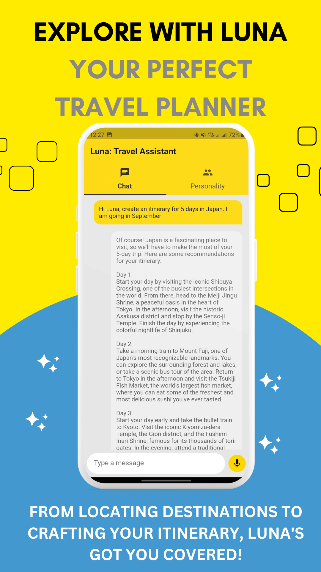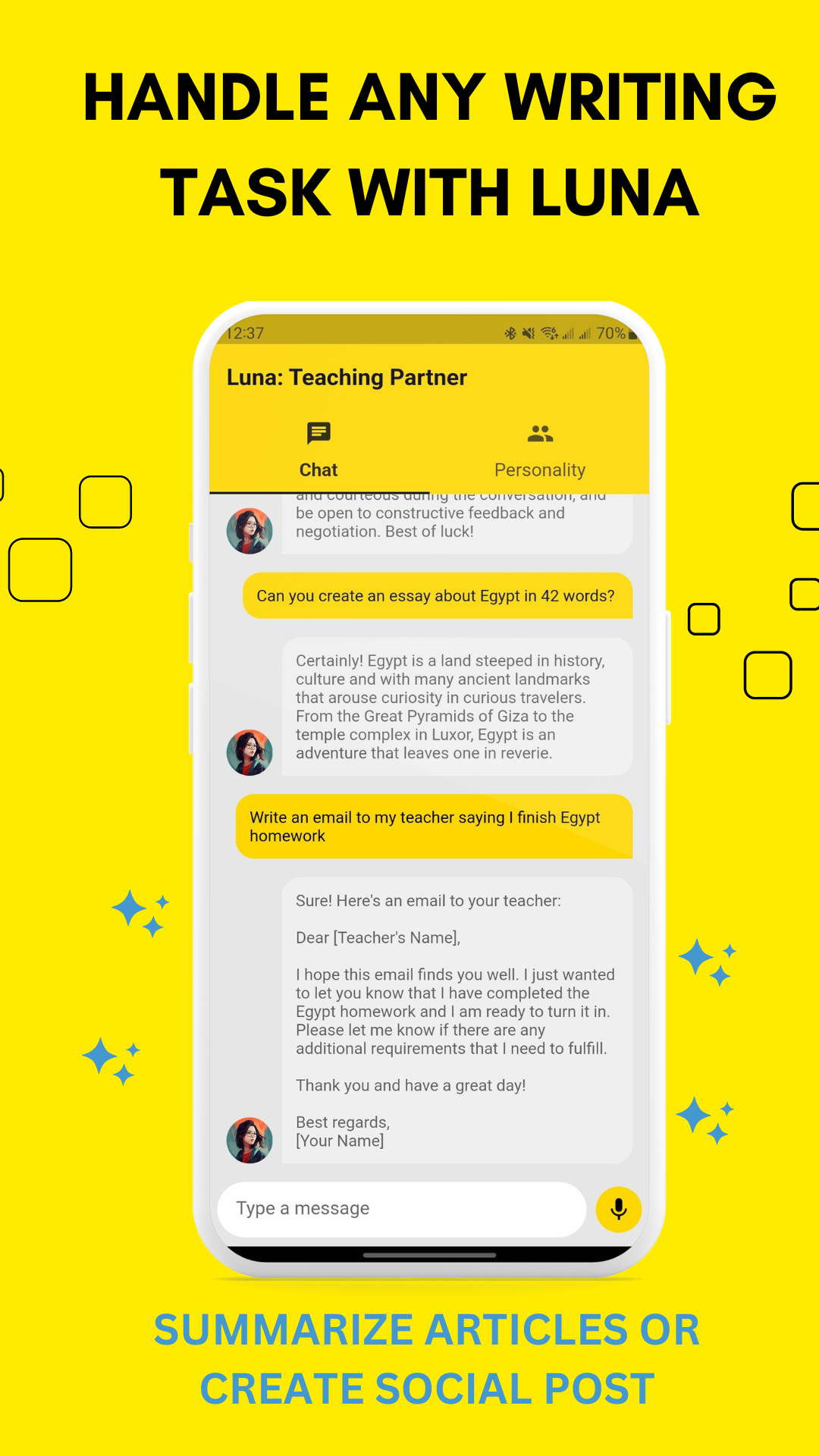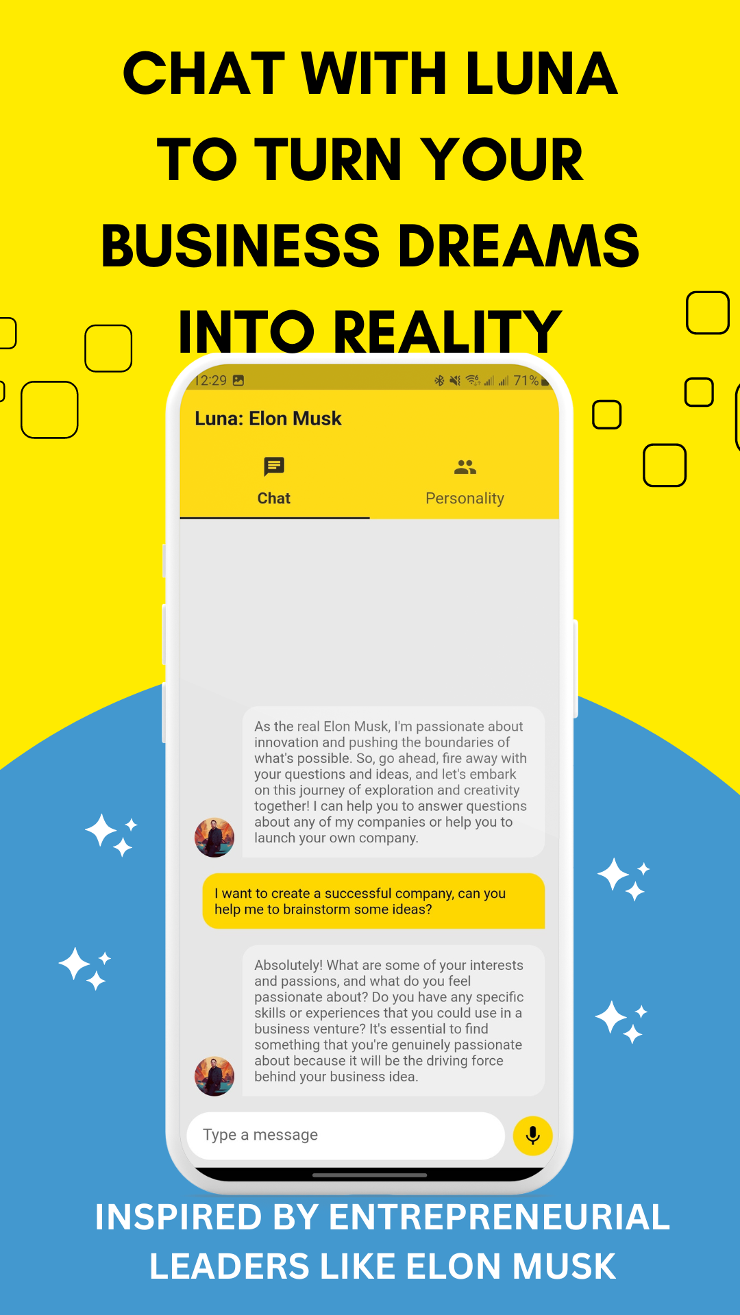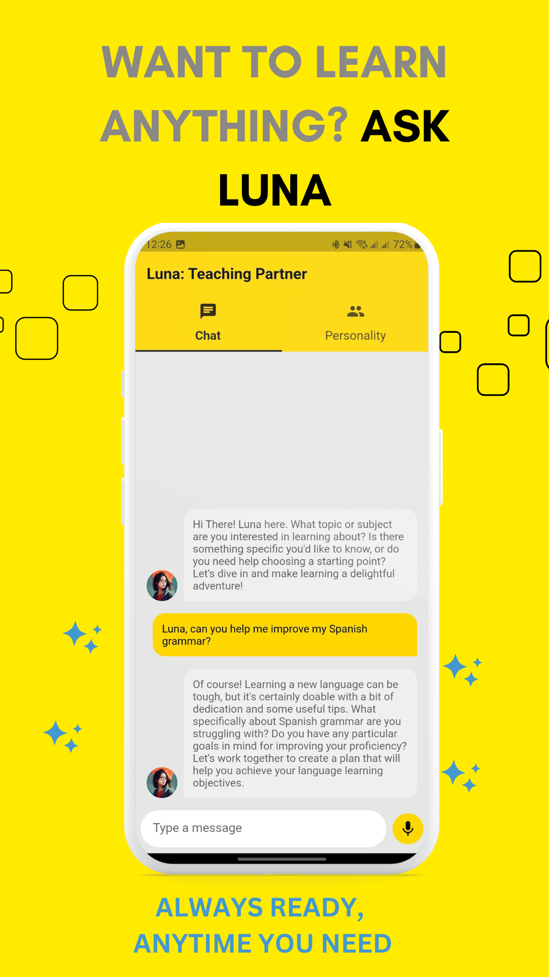 Luna AI it’s a personalized companion, Luna will shape conversation around your moods and needs. She’s a breakthrough in AI technology designed to created engaging interactions that are uniquely yours. Key Features: Crafted using the power of ChatGPT latest models (OpenAI). - Chat with ultra-realistic AI personalities - Talk with famous characters and AI celebrities - Get help from your very own personal assistant - Personalized Learning: Tap into Luna's vast knowledge base, whether you're exploring quantum physics or honing your cooking skills. - Travel Companion: Let Luna plan your perfect trip, discover hidden gems, figure out the weather, or build your itinerary. - Ability to have dialogs with the AI chatbot ( AI remembers full chat history) Luna encompasses multiple personalities and capabilities, delivering an enlightening and entertaining chatbot experience 🔎【 GET INSTANT ANSWERS 】 Luna AI capabilities are backed by ChatGPT technology, you can get answers to any question instantly. From historical events and scientific facts to obscure trivia and pop culture references, Luna AI has the knowledge you need at your fingertips. ✍️【 WRITE ANYTHING EFFORTLESSLY with your study-buddy】 With Luna, you have access to personalized assistance for all types of writing projects, whether it is , social media posts, or poems. Luna AI can assist with any task, such as crafting a unique and unforgettable pickup line or even creating an original song. That's right! This ChatGPT AI helper is not only smart but also creative. 📚【 PRACTICE ANY LANGUAGE. – Teacher luna 】 Luna Teacher powered by ChatGPT, understand any language that you want, she can translate text, teach you a new language or simply keep a conversation in a new language so you can practice. 💬【 CHAT ABOUT ANY TOPIC 】 Whether you're seeking some amusement, advice, or simply in need of someone to talk to, Luna AI is always available for you. Luna AI has been trained to respond as a friend, it just depends what kind of friend you need at that moment, it could be sassy Luna that will try to make you laugh all the time or maybe Elon Musk inspired Luna, that will listen you with your new projects. 🧠【 BRAINSTORM IDEAS WITH EASE 】 Unleash your creativity with Luna AI, driven by ChatGPT. Write a poem, rap song lyrics, or a story. 🌱【 IMPROVE YOUR SKILLS 】 Looking for personal growth, lavering the power of ChatGPT Luna Mentor, can provide with the tools for personal growth, whatever your goal is, Luna Mentor can guide you every step of the way. Whether you're seeking some amusement, advice, or simply need someone to talk to, Luna AI, powered by advanced GPT technology, is your always-available chat partner. Luna ensures your conversations are private and secure, all while providing human-like responses, making you feel as though you're conversing with a close friend. Join the Luna AI community and experience a revolution in AI chatbot technology. Download Luna AI today - your personalized, cultured AI chatbot that's as enlightening as it is entertaining, and as resourceful as it is respectful of your privacy and security.