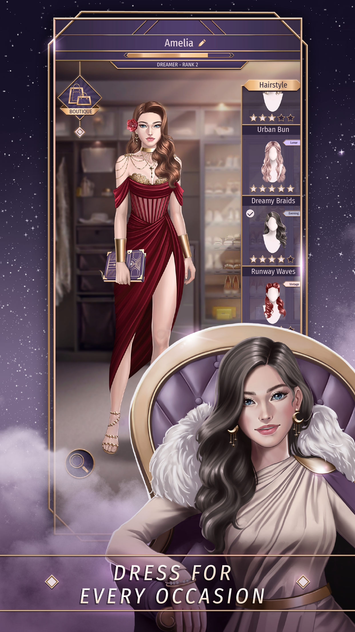 Your unique visual love story awaits! Dive into the most amazing choice game and go on an indescribable adventure while playing gripping interactive story games filled with secrets, excitement, roleplay, and danger. Live an unforgettable love fantasy and pick your virtual boyfriend in teen love story games inspired by dating sim games. Dress up for special occasions, earn fashion choice points and become a queen of Lunescape - Fantasy Love Story!