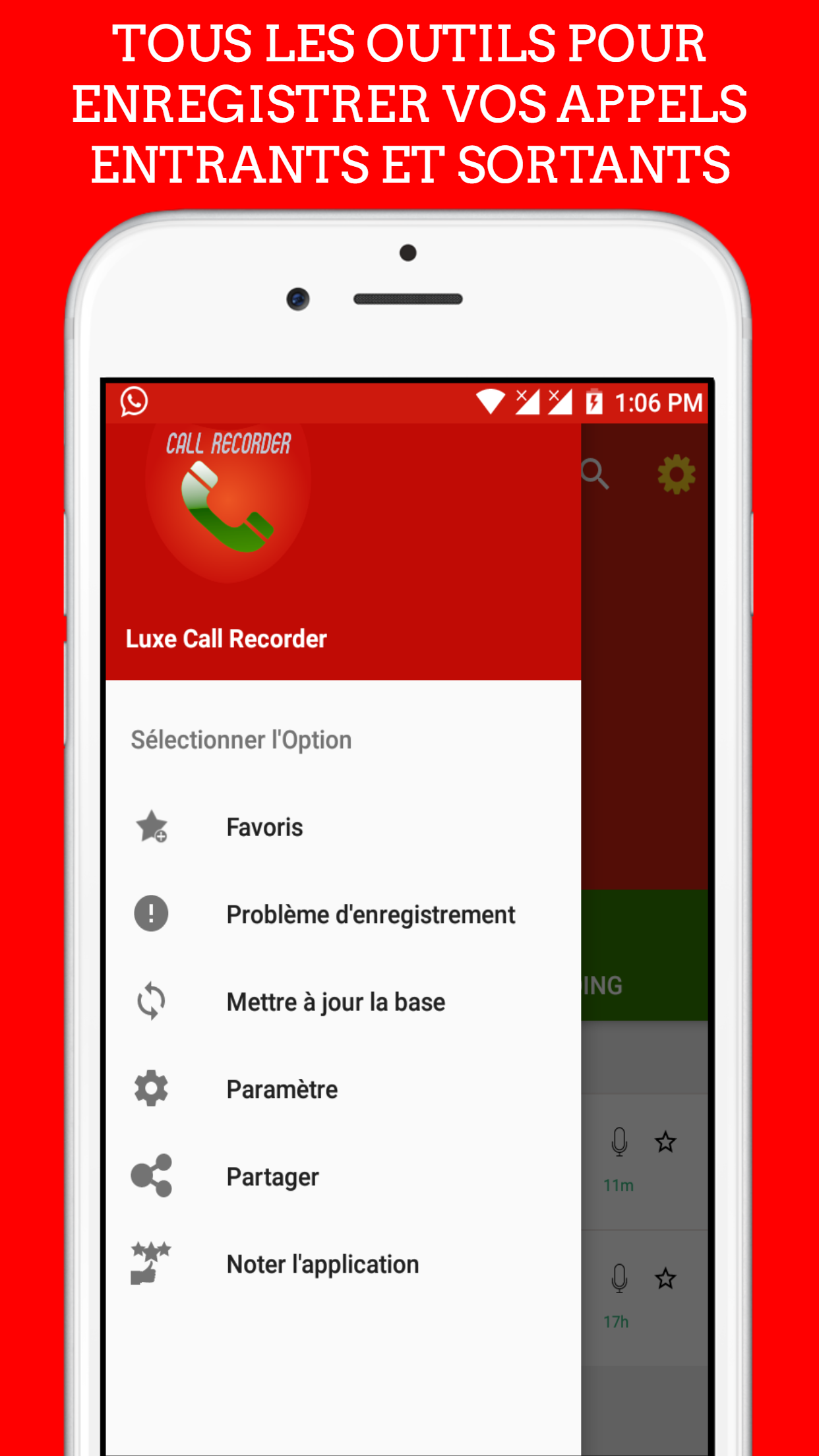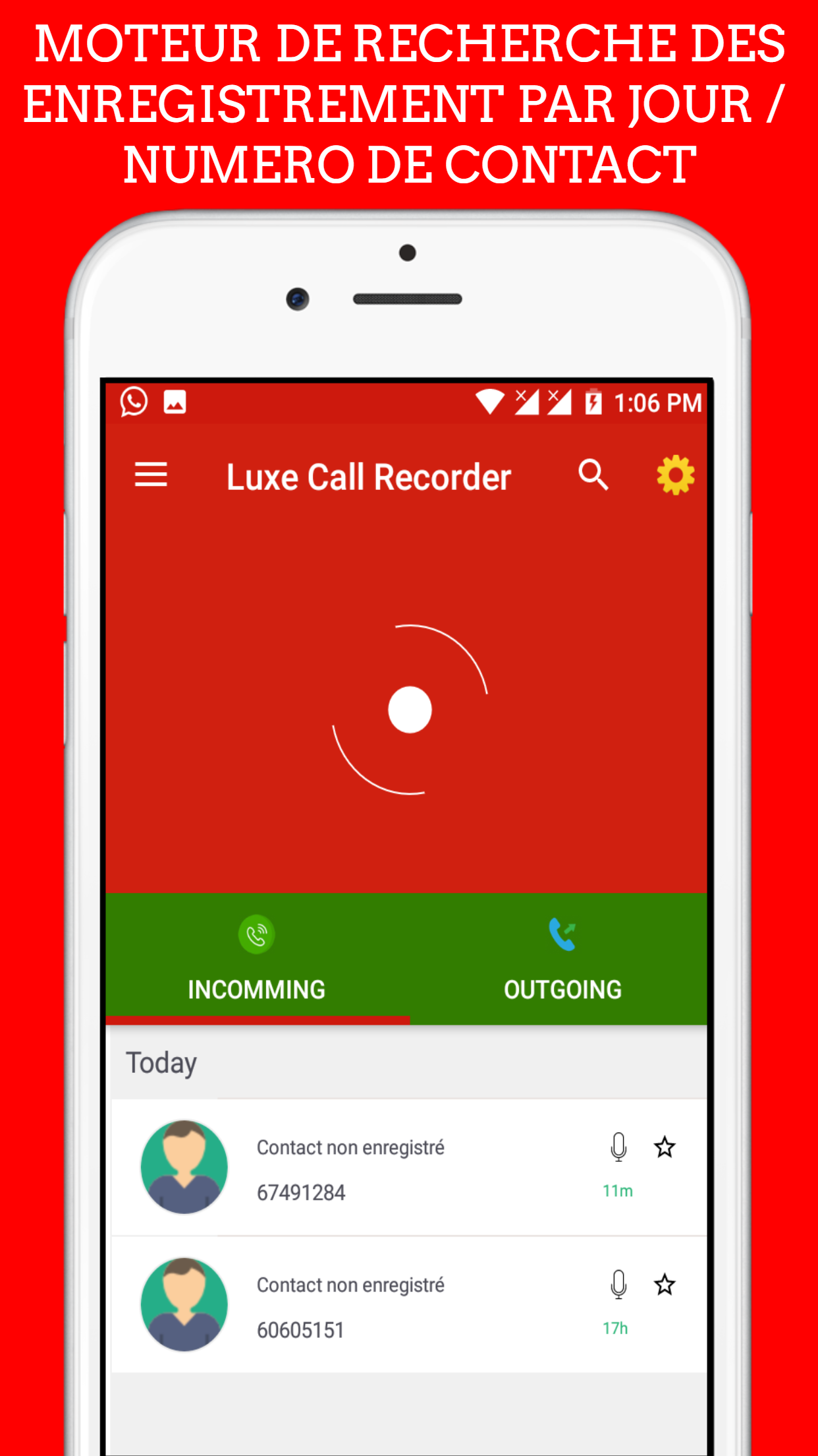 Luxe Call Recorder is an automatic voice call recording application in your phone. The application allows you to record incoming calls and outgoing calls in mp3 format in your phone. You can find all recorded calls directly in the list of recorded calls within a day, within a week, in the month for using its built-in search engine that allows you to search for recorded phone calls by date or by phone number. With its simplicity and fluidity, the "LUXE CALL RECORDER" phone call recording app guarantees you recordings in MP3 HD format. Call recording alone does not make you immune to everything. You must back up and guarantee the confidentiality of some calls that you have registered to use them without problems. So "LUXE CALL RECORDER" has thought of a system of locking recorded calls to allow you to guarantee their higher confidentiality. You can lock calls using two types of locks such as the PIN CODE or the schematic drawing on the screen. That's the confidentiality of calls that you registered is guaranteed without the use of another external application. If you are looking for an application to record voice calls, all phone calls if you search for an application to record your incoming calls LUXE CALL RECORDER is the best if you are looking for an app to record your outgoing calls LUXE CALL RECORDER is easy if you are looking for an app to record your calls and protect the recordings LUXE CALL RECORDER is the best. ALors LUXE CALL RECORDER is the best application you need to automatically record your phone calls.