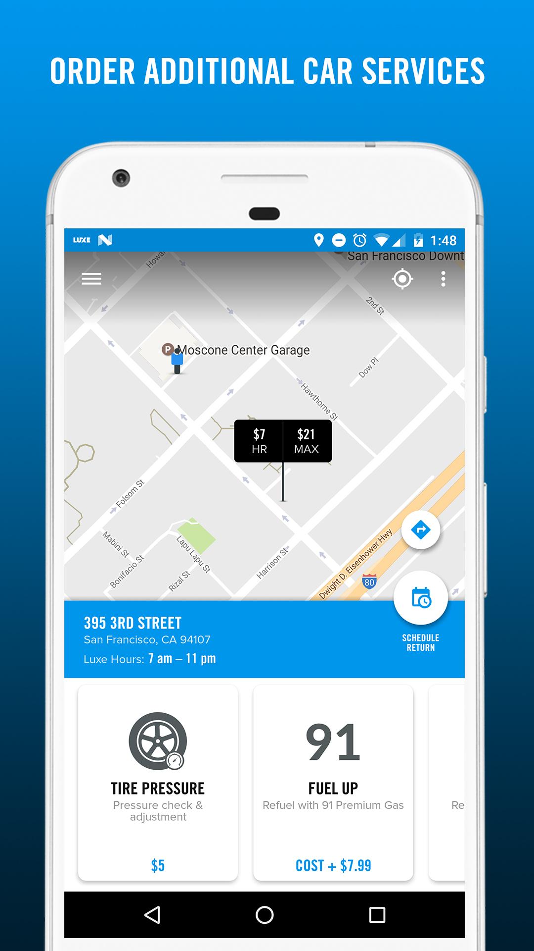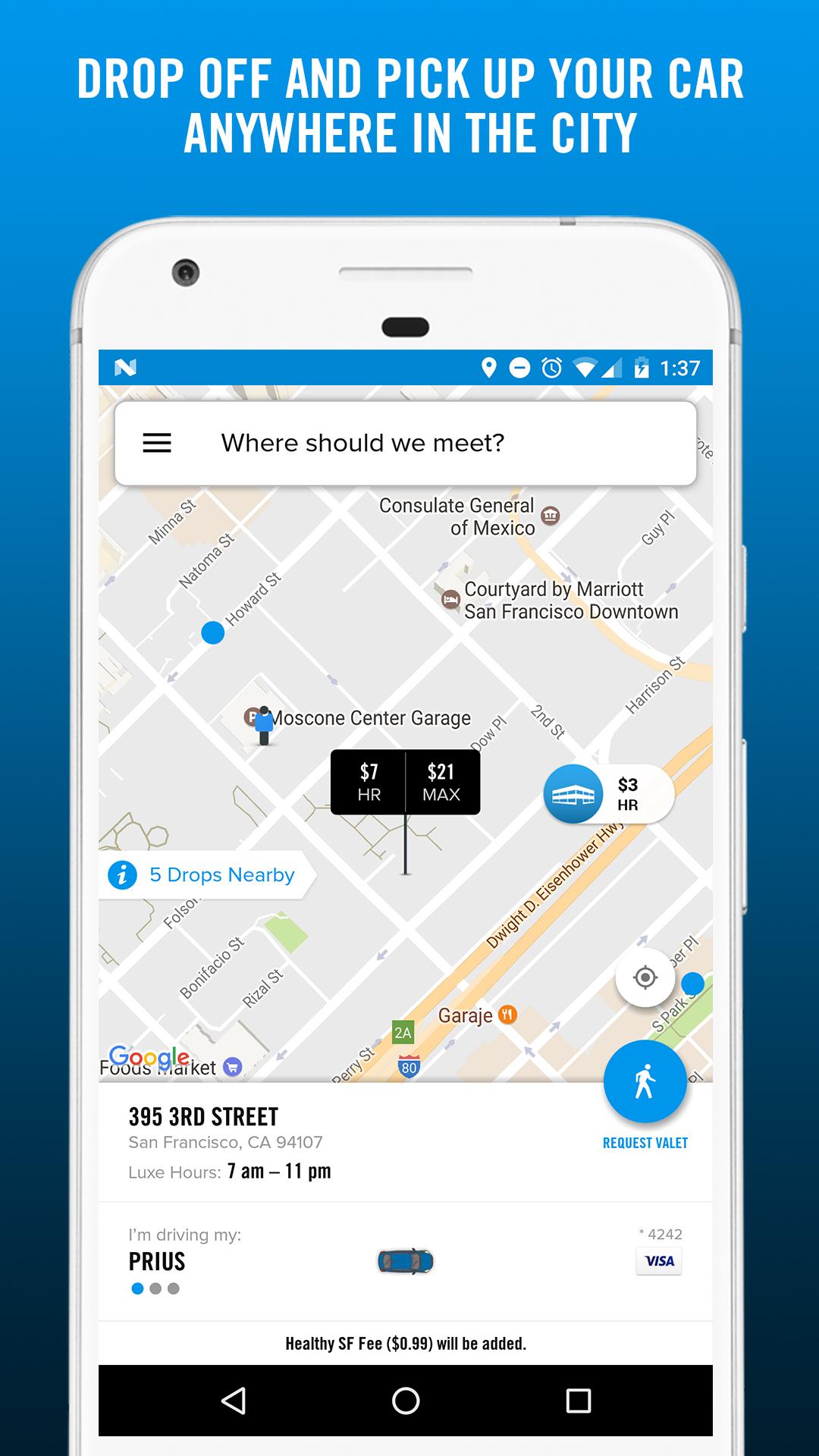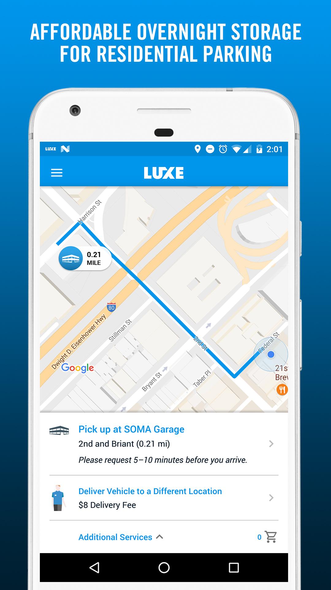 Luxe is an on-demand valet parking service that lets you request a valet to park your car for you, wherever you go. Parking meters, permit parking, and awkward commuter transit are a thing of the past with Luxe. Valet park your car in a secure lot or parking garage anywhere you go. Just let us know where you’ll be, and a Luxe Valet will find parking so you don’t have to worry! We’ll even visit the car wash, take your car in for an oil change, or refuel your car for an additional fee. Created by a team of former Google, Tesla, Zynga and Yahoo! leaders, Luxe is the fast and easy way to find the best parking spots on those long days or fun-filled nights. Never circle the block again! ____________________________ Luxe Features: HOW IT WORKS • Before you start driving, enter your destination in the Luxe app. • A Luxe Valet will meet you at your destination as you arrive and collect your car from you. • The Valet will park your car in one of our secure locations. • Our Valets will even fill your gas tank or get your car washed. • Once you’re ready to go, we return your car back to you, wherever you are! CAR SERVICES * Car wash, re-fuel, and oil change are just some of the other services that we offer, at your request. CAR SAFETY AND SECURITY * Luxe Valets are trained and vetted through comprehensive background checks. * Valet parking keeps your car safe in a covered parking garage or private lot. * Our $5M insurance policy protects you, your friends, and your vehicle. SAVE TIME AND MONEY * Forget parking meters and crowded lots. Let Luxe find parking anywhere you need to be. AVAILABLE IN: * San Francisco * New York * Chicago *NEW* Luxe Garages are now available in SF and Chicago. Experience a lower-priced, guaranteed way to park with Luxe! ____________________________ "My favorite service is Luxe. A marvel of the logistics only possible in a smartphone world, Luxe uses GPS to offer a personal parking valet. It’s magical." - The Wall Street Journal "Every few years, I come across a new tech service that completely upends how I navigate urban life...a new company that has instantly solved one of the most soul-destroying hardships of living or working in San Francisco: parking. The company is called Luxe Valet." - New York Times Stop circling the block. Download today and start parking with Luxe! Where do you want Luxe to go next? We're always looking for new cities to expand to and if this sounds like something you need in your city, we'd love to hear from you! http://luxe.com/request