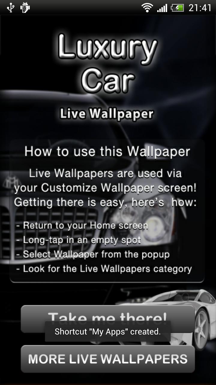 Luxury Car Live Wallpaper is a fantastic new live wallpaper for every boy and luxury car lover! There is no man or boy on the planet that wouldn't enjoy an expensive car! Several backgrounds with amazing car designs, most popular and cool, as well as futuristic car designs! Download Luxury Car Live Wallpaper now and see all those cars you love so much in one place! Fantastic app, great cars, great desings! Choose your favorite car and never take it off your phone screen! - Amazing 3D live wallpaper for your phone! - Interactive feature: Tap on the screen and headlights will light up immediately! - There is full support for landscape mode and home-screen switching! - This beautiful, free and enjoyable background is waiting for you! Installation instructions: Home -> Menu -> Wallpapers -> Live Wallpapers Mercedes, Audi, Alfa Romeo- just pick your favorite one! Luxury cars are expensive and come in all shapes: sedan, coupe or convertible. They offer all the comfort, luxury and performance but you will have to pay premium price. German cars like BMW or Mercedes are the first brand of cars that come to our mind but nowadays nearly all car makers offer nice and comfortable car models that enter in the luxury car category. Unlike sports cars, luxury cars place more emphasis on comfort and appealing design than on performance. Even so, the performance of a Mercedes or BMW is at enviable level. Furthermore, these kinds of automobiles usually offer more quality materials and modern technology. It's hard to define which car deserves the title of a luxury car, but there are certain requirements that need to be met, for instance, price, design, comfort and prestige. The least subjective of these features is of course price. Another thing which is basically unavoidable is leather seats and beautiful shape. The category of high-end kind of cars includes many vehicles of luxury brands such as the Mercedes S-Class. Currently, all vehicles priced between the range of $60k and $100k are a part of this exclusive club. The vehicles in this segment offer extremely high levels of quality and latest technological developments, as well as degrees of comfort at least equal to those found in mid-level luxury vehicles. There is no precise term in the UK; such a car would be simply called a luxury car. Vehicles in this category include some of the models from the flagship lines of luxury car brands, such as the Mercedes S-Class, BMW 7 Series, Audi A8, Jaguar XJ, and Lexus LS. The Volkswagen Phaeton is the only high-end luxury vehicle that is not sold under a luxury nameplate. Every man, woman, boy or girl has at least a few times in his or her life imagined how it would be to drive one of those so beautiful and expensive cars! Only a few are lucky enough. If you fall in the latter category, don't worry, now you can have your dream car on your live wallpaper anytime. It's not the same but it is something. Imagine driving your favorite car along a great highway, like in a car comercial. You'll feel cool and powerful. Have “Mercedes-Benz” or any other kind of Mercedes or Audi or whatever tickles your fancy. You pick and enjoy! Download Luxury Car Live Wallpaper now and be the man of the hour!