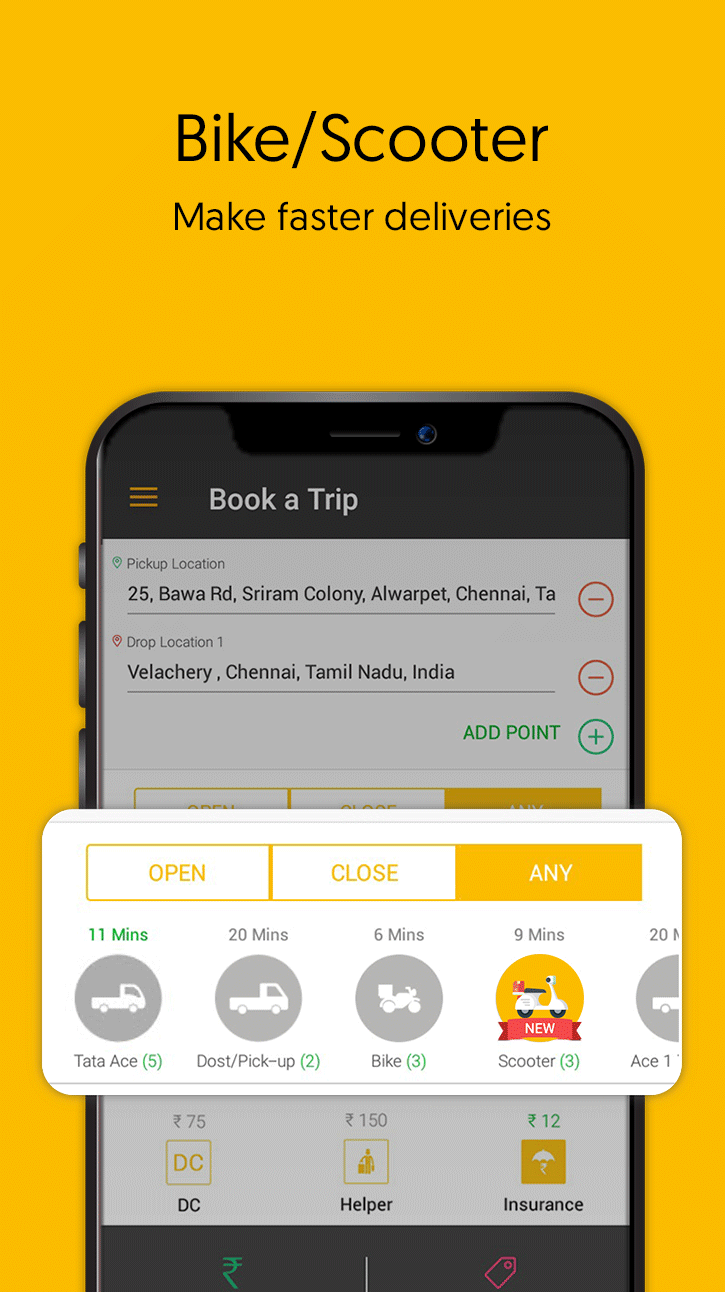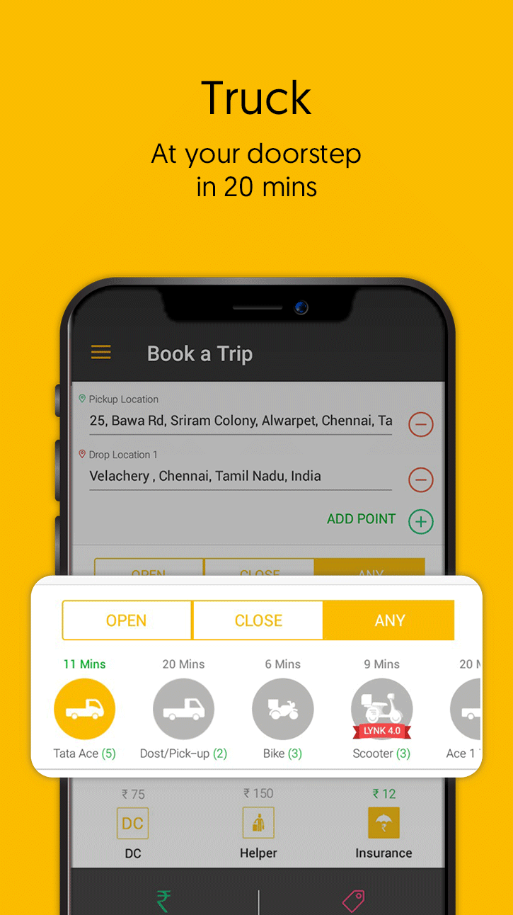 Tata Ace, Ape, Dost, Tata 407 and more. Our driver partners are less than 20 minutes away.