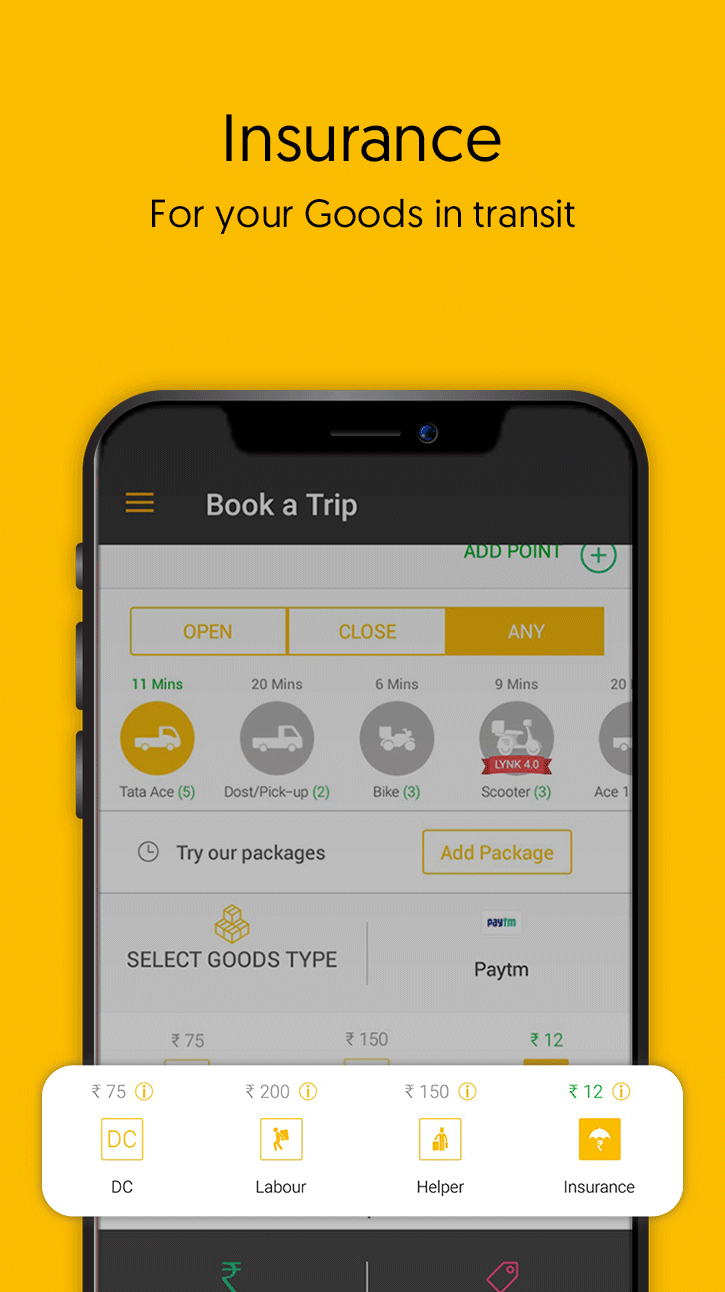 Insurance:We are the only logistics provider with insurance for goods transported on city trucks. For an insurance premium of just ₹12, you are protected against accident and other transit damages.