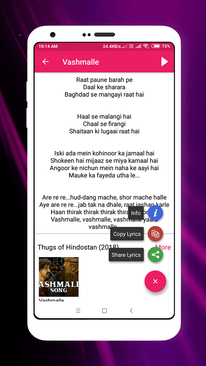 Song Lyrics (Package Name: com.bollywood.songlyrics) is developed by Social Tools App and the latest version of Lyrics - Bollywood Song Lyrics 2.1 was updated on February 13, 2021. Lyrics - Bollywood Song Lyrics is in the category of Music & Audio. You can check all apps from the developer of Lyrics - Bollywood Song Lyrics and find 10 alternative apps to Lyrics - Bollywood Song Lyrics on Android. Currently this app is for free. This app can be downloaded on Android 4.2+ on APKFab or Google Play. All APK/XAPK files on APKFab.com are original and 100% safe with fast download.