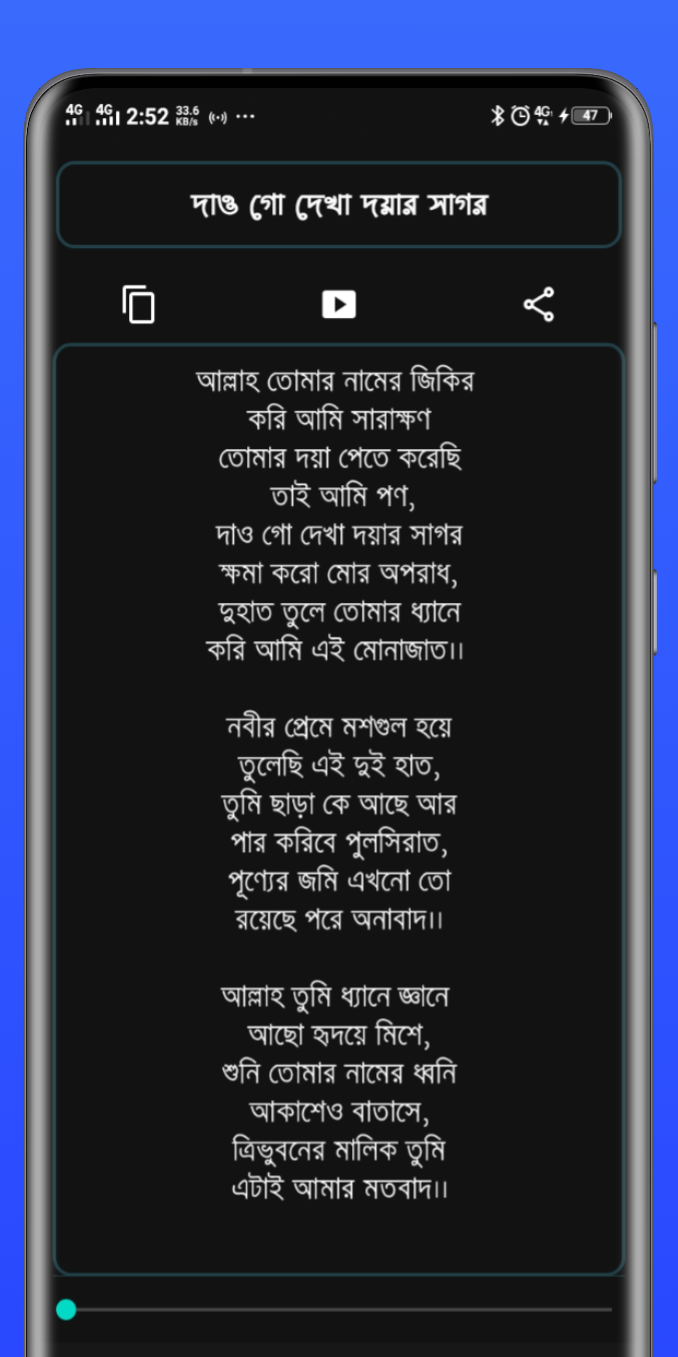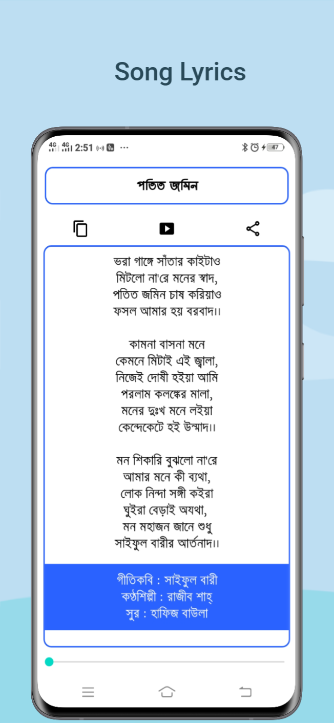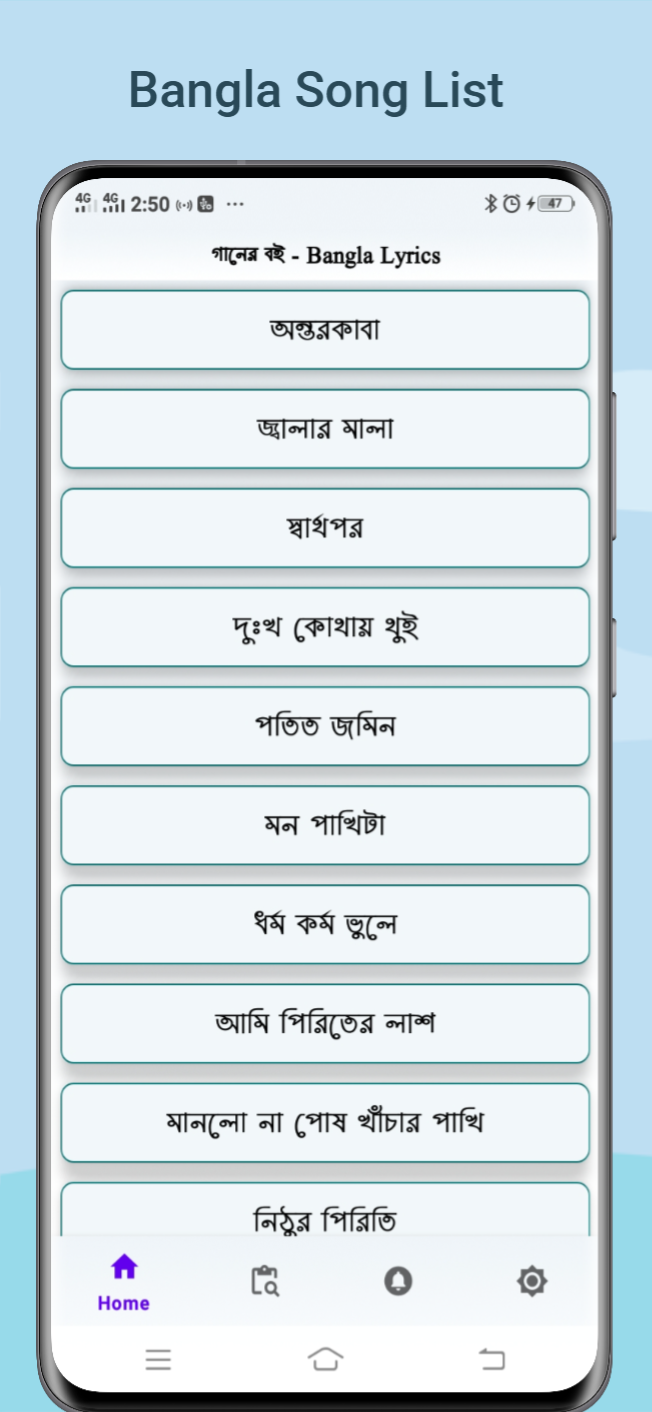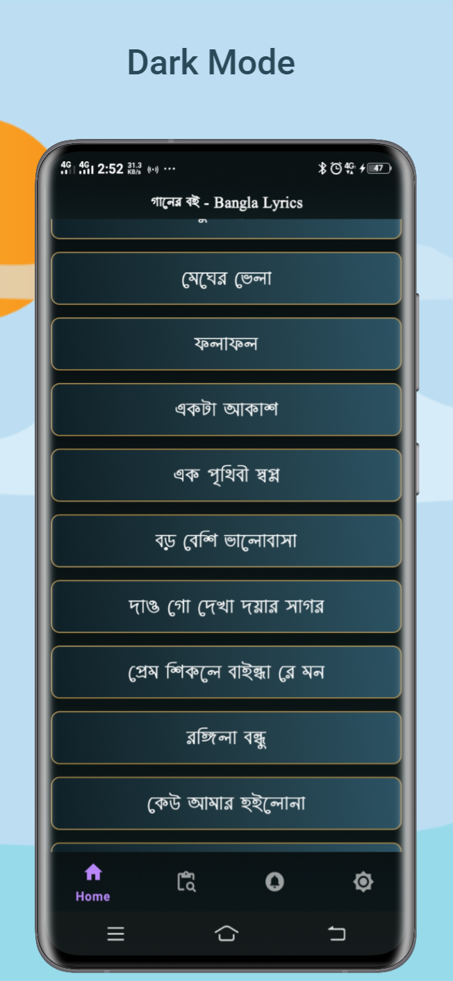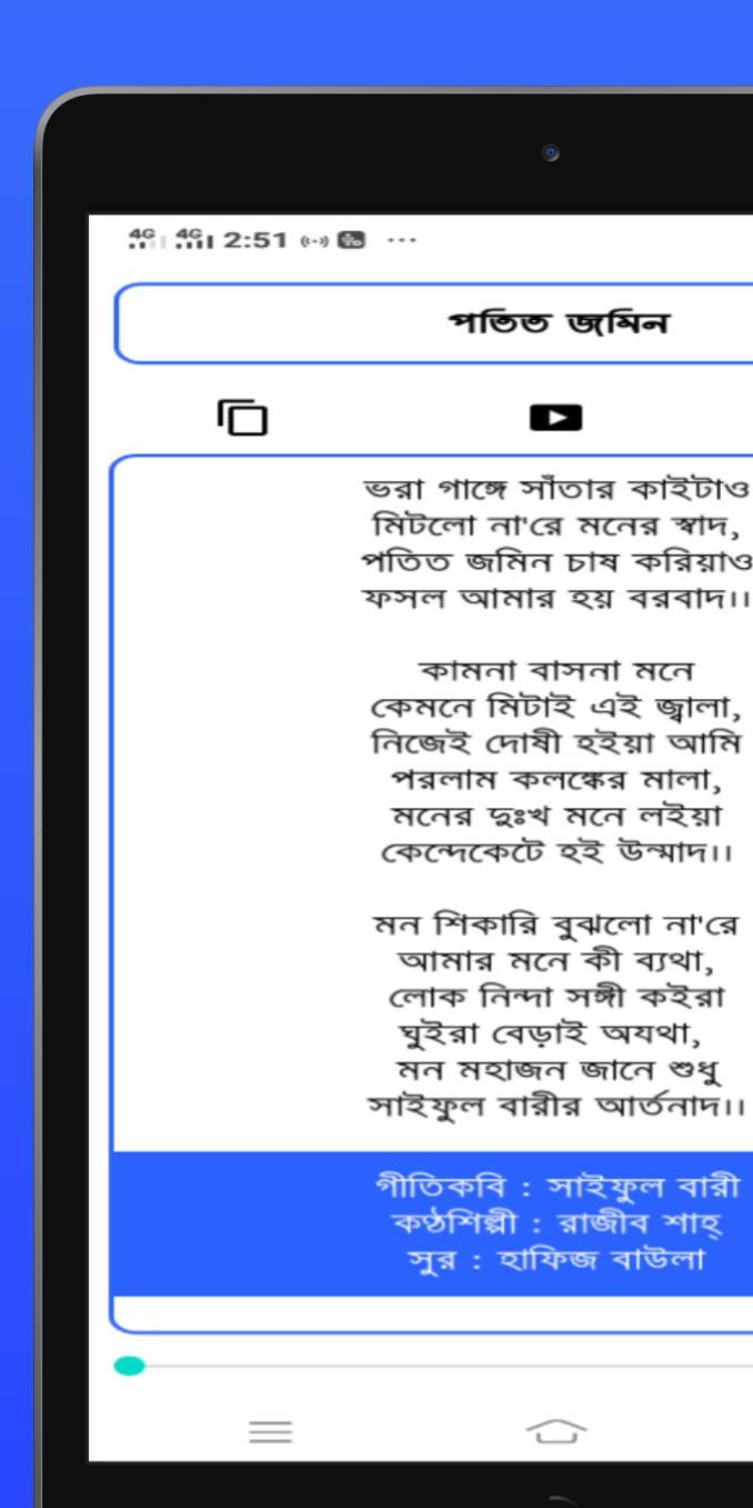 "গানের বই - Bangla Lyrics", written by lyricist Saiful Bari, is a unique collection featuring the lyrics of countless songs sung by popular and talented singers of Bangladesh. Saiful Bari, one of the promising lyric poets of the young generation, was born in Kantarpalli village of Sakhipur upazila, Tangail. He is the founder of Bari Labs. His songs have been performed by many renowned artists, including Shofi Mondol, Abu Bakar Siddique, Kazi Shuvo, Rinku, Laila, Rajib Shah, Fazlur Rahman Babu, Raju Mondol, Emon Khan, Parvez Khan, Kamruzzaman Rabbi, Purno Milon, Baul Akaid, Hafiz Baula, Emon Alif, Pushpita Mitra, and Shamsunnahar, among many others. In this app, you can both read the lyrics and listen to the songs written by Saiful Bari and sung by various artists. It’s a perfect collection for all Bengali music lovers. “গানের বই - Bangla Lyrics” — Discover the rhythm of your heart through Bangla songs. 🎶