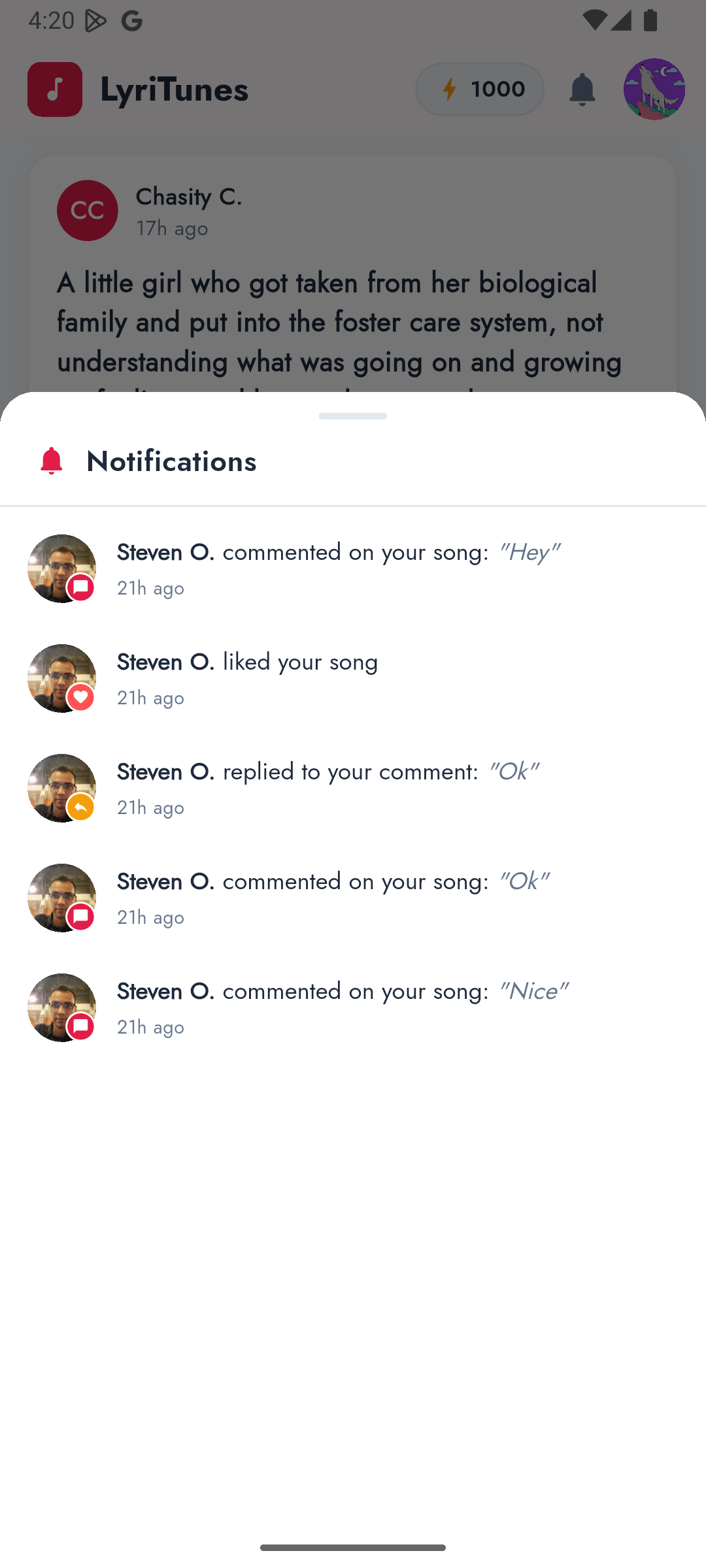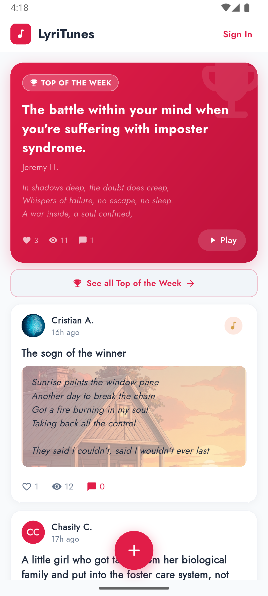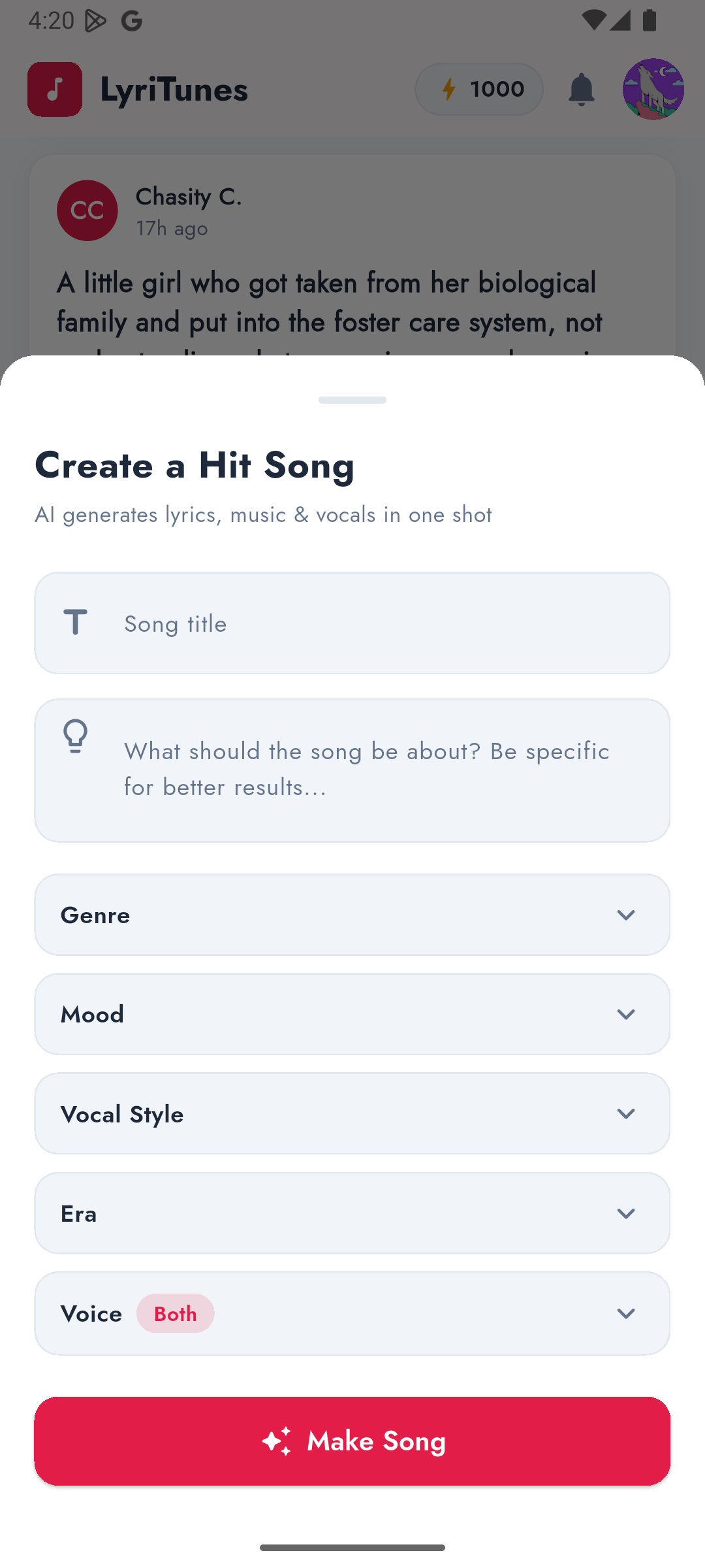 Post your songs to the LyriTunes feed and let the community hear what you made. Like, comment on, and share tracks from other creators. Climb the leaderboard and get featured as a Top Song of the Week.