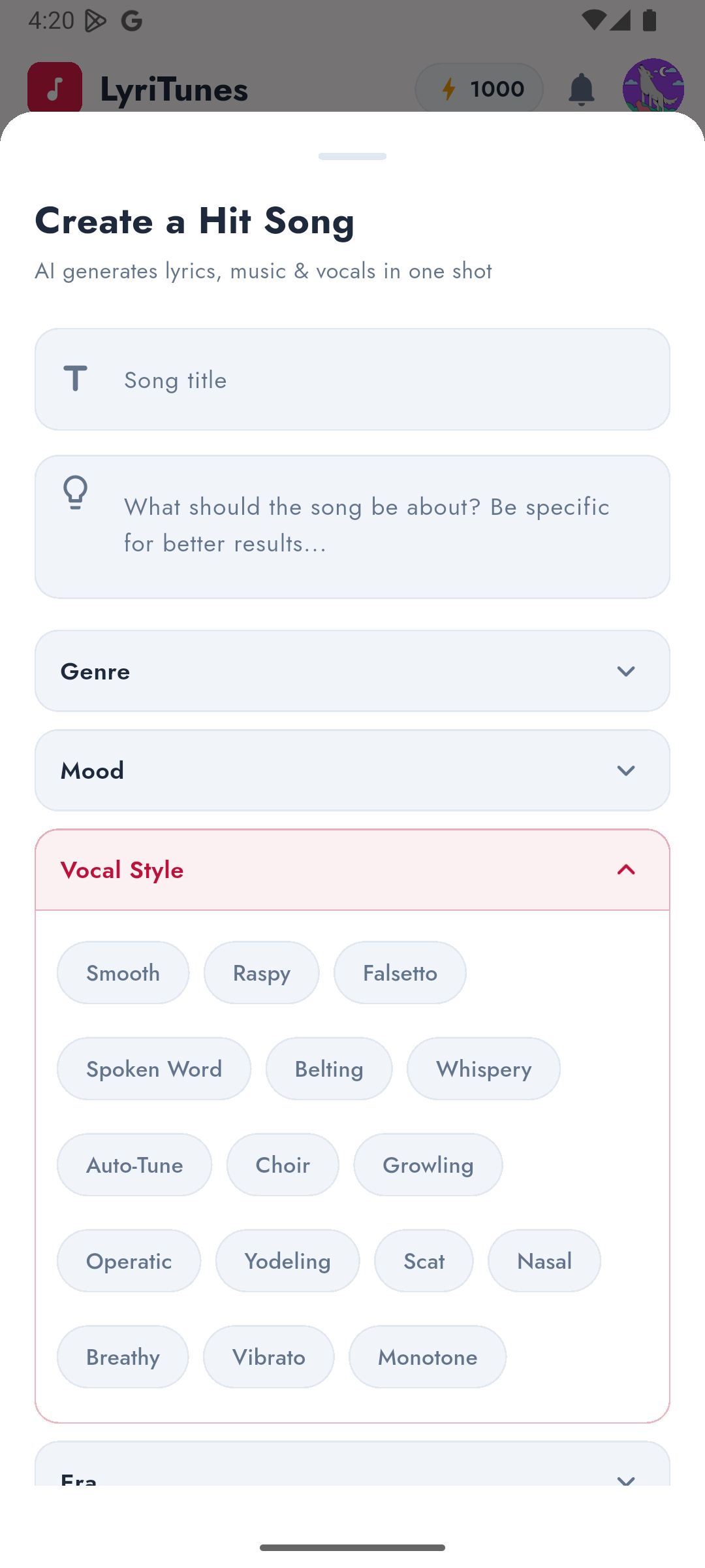 Make it yours. Choose from 30+ genres including Pop, Rap, Rock, R&B, Electronic, Latin, K-Pop, Lo-Fi, Jazz, Afrobeats, and more. Set the mood — Upbeat, Melancholic, Romantic, Dark, Chill, or Party. Pick a vocal style from Smooth to Raspy, Falsetto to Auto-Tune. Even choose an era: 60s Motown, 80s Synth, 90s Boom, or Modern 2020s.