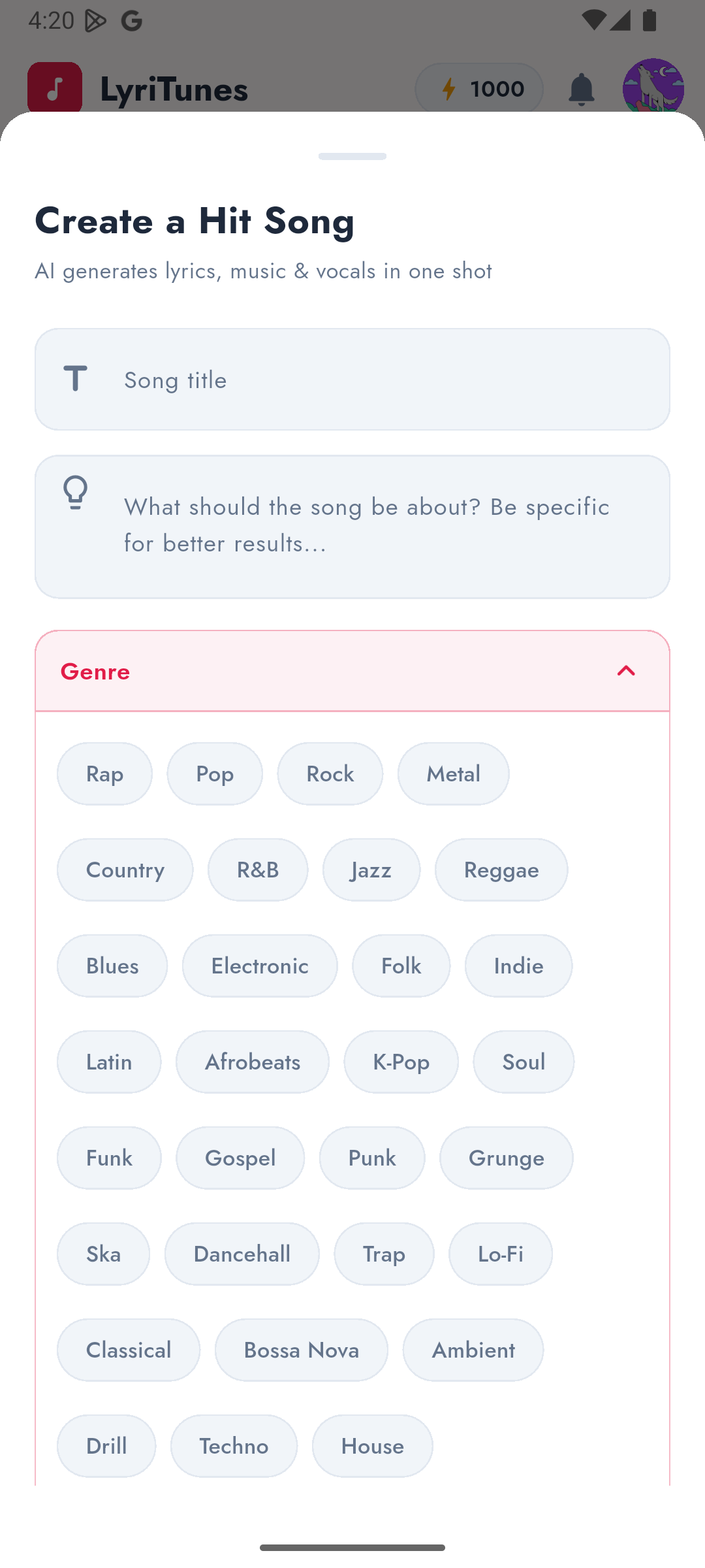 LyriTunes is the AI-powered music creation app that writes lyrics, composes music, and adds professional vocals all in one tap. Just type a title and a topic, pick your style, and watch your song come to life.