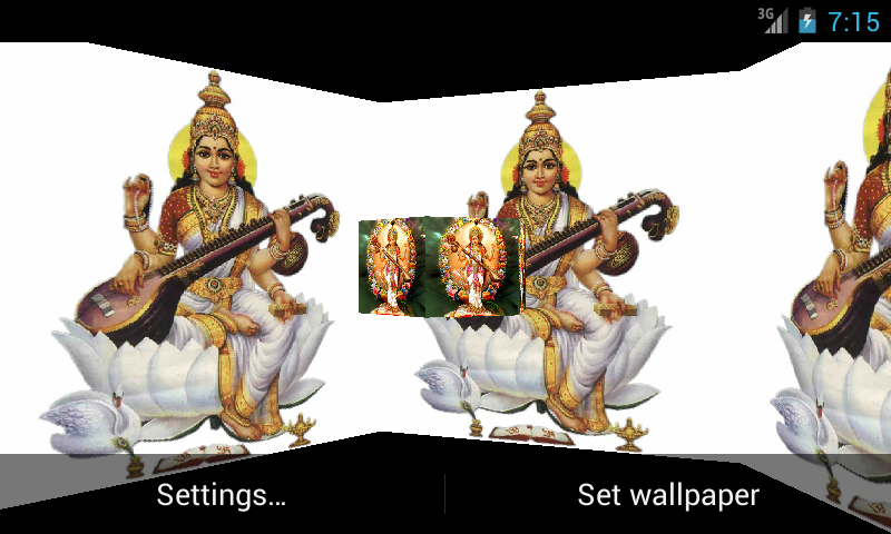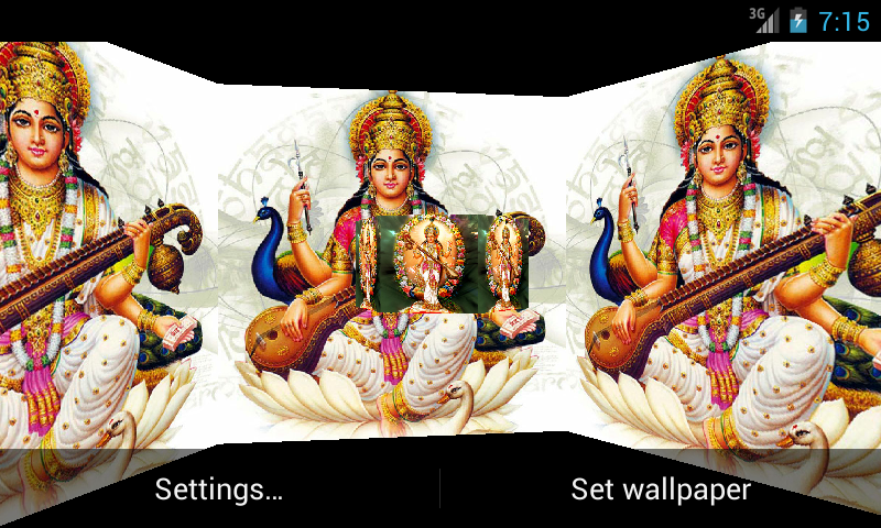 Maa Sarswati 3D Live Wallpaper with selected images and Great Animations. Saraswati (Sanskrit: सरस्वती, Sarasvatī ?) is the Hindu goddess of knowledge, music, arts and science. She is a part of the trinity of Saraswati, Lakshmi and Parvati. All the three forms help the trinity of Brahma, Vishnu and Shiva in the creation, maintenance and destruction of the Universe. Thanks.