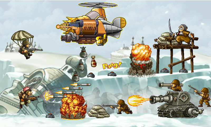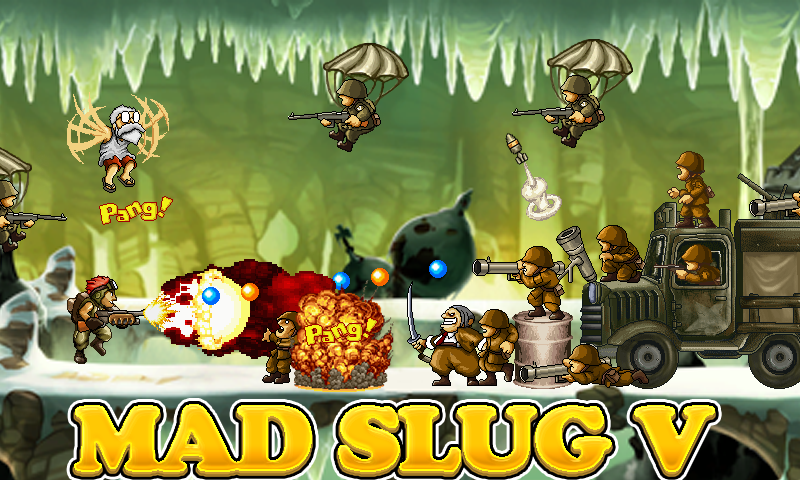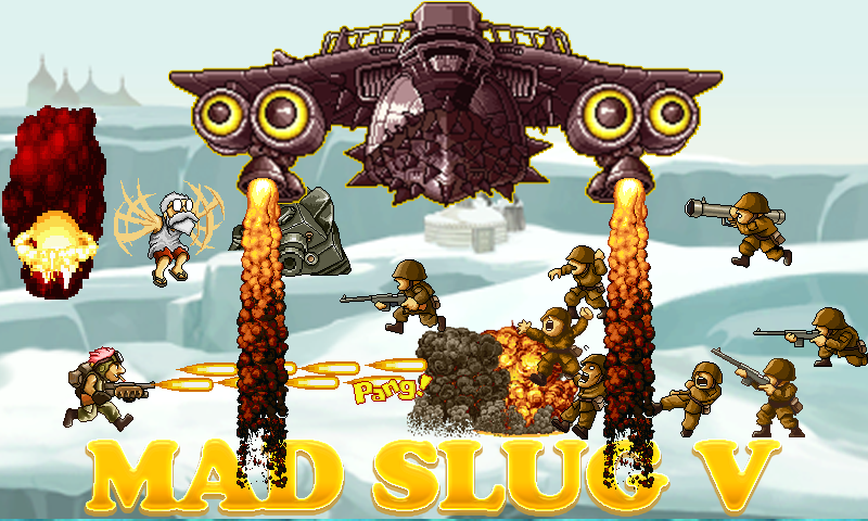 Mad Slug 5: Victory Storm, Classical 2D gun shooting arcade game! totally free!! Mad Slug 5: Victory Storm , the legendary classical 2D gun shooting action game at Arcade, revived with new game plot !! The classic, long-run gun shooting game from the 90s has been perfectly remade for android device. fascinate many fans of worldwide for its intricate dot-pixel graphics, and simple and intuitive game controls! In Mad Slug 5: Victory Storm, The evil Boss Hydra and his rebel army has launched a coup d'état on the world's governments, and all attempts by the armies of the various countries to curtail his growing power fail. His most recent attack has given him access to a new form of all-terrain combat Super Aircraft : Victory Storm. In a last effort to stop evil Hydra, Ace Captain Steven is sent to locate and eliminate his powerbase, as well as reclaim or destroy any evil weapon they can find so as to keep the technology out of Hydra’s hands. After battling their way through hordes of Hydra's soldiers, the duo eventually face off against Hydra himself, in a heavily armored helicopter. After defeating the helicopter and killing Hydra, they destroy his base of operations. The player must shoot constantly at a continual stream of enemies in order to reach the end of each level. At this point, the player confronts a boss, who is usually considerably larger and tougher than regular enemies. On the way through each level, the player can find numerous weapon upgrades, In addition to shooting, the player can also perform melee attacks by using a pan. The player does not die simply by coming into contact with enemies, and correspondingly, many of the enemy troops also have melee attacks. Much of the game's scenery is also destructible, and occasionally, this reveals extra items or power-ups, although most of the time it simply results in collateral damage. During the course of a level, the player also encounters POWs, who, if freed, offer the player bonuses in the form of random items or weapons. At the end of each level, the player receives a scoring bonus based on the number of freed POWs. If the player dies before the end of the level, the tally of freed POWs reverts to zero. In Mad Slug 5 , There are a total of three stages, in locations such as river, mountain valleys, and military bases. The vast majority of enemies are soldiers equipped with weaponry befitting their specific role. There are also several mechanized enemies, such as tanks, mobile artillery, aircraft, armored personnel carriers and technicals. Much of the game's humor comes from how the enemies are depicted; the player often encounters them as they are sunbathing, roasting food over a fire, or simply conversing amongst themselves. They also tend to scream loudly if they see the player, and often try to run away.