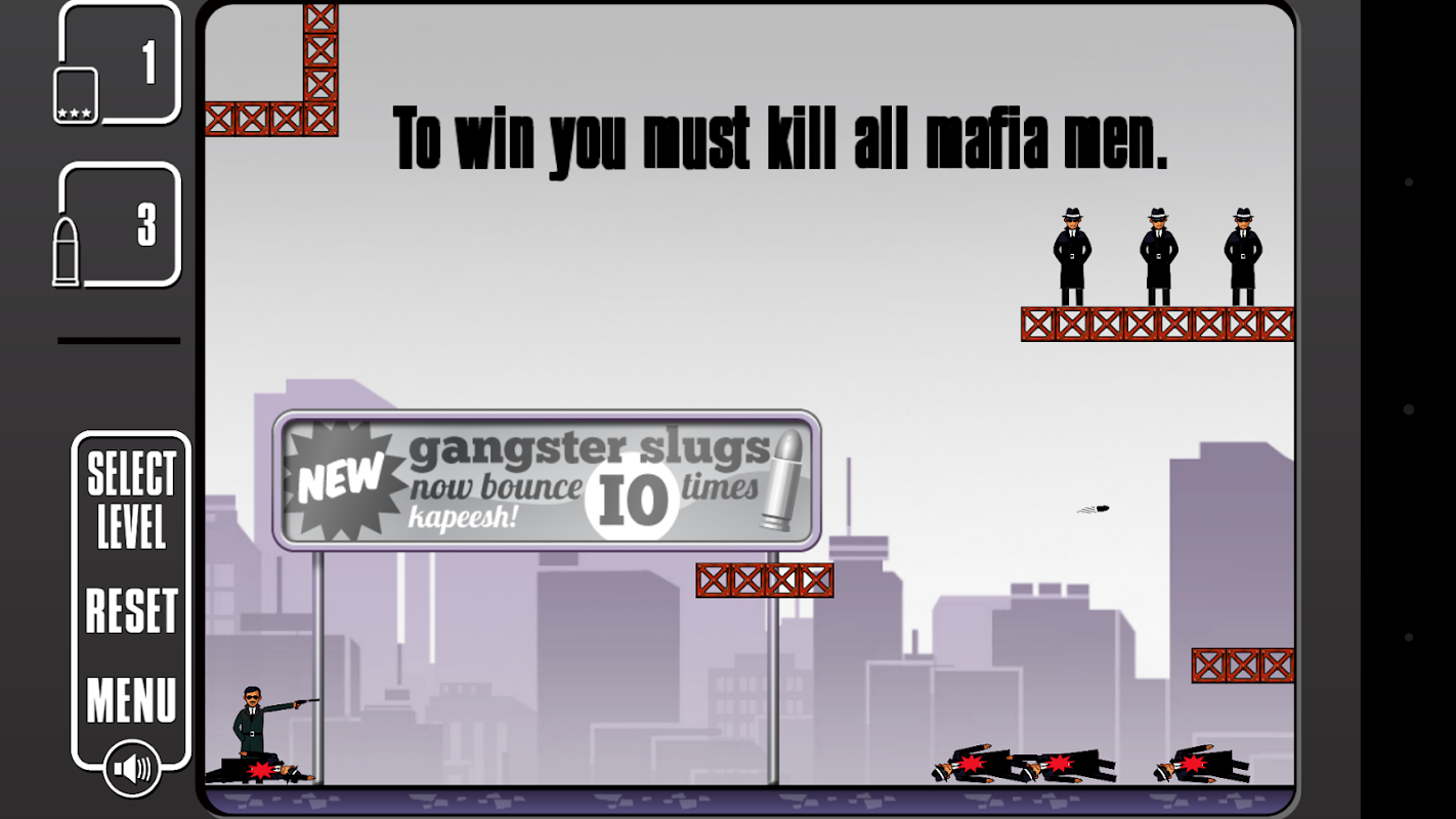 Mafia Kills is a physics-based 2D shooting game where you fire super-bouncy bullets to eliminate all the bad Mafia guys in each level. You have limited number of bullets in each round so, try to kill as many Mafiosos as possible with each single bullet to score maximum points. Please remember that you will lose level if your bullet runs out. There are 25 Levels to complete.