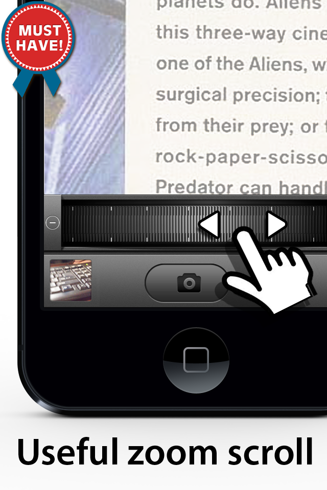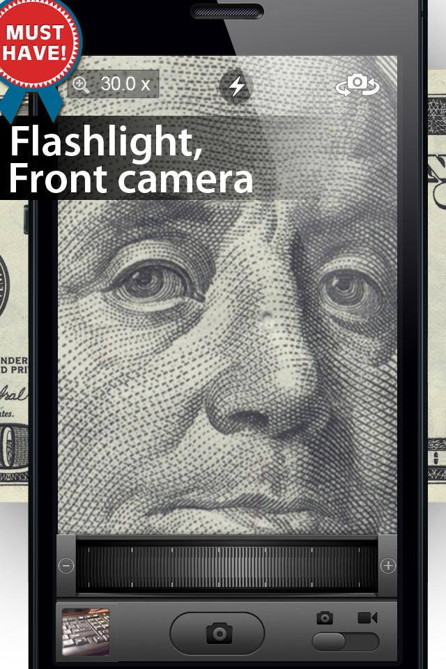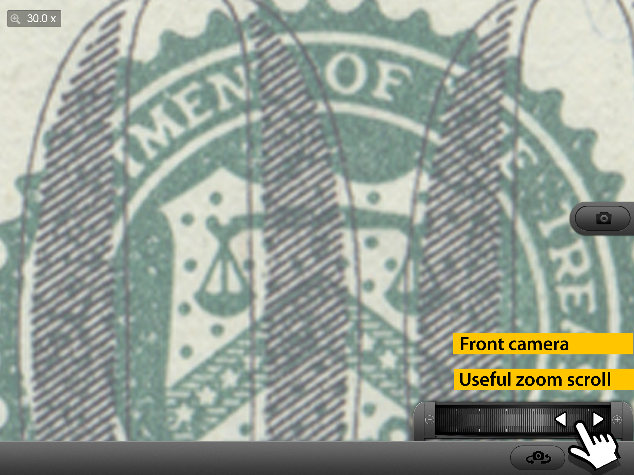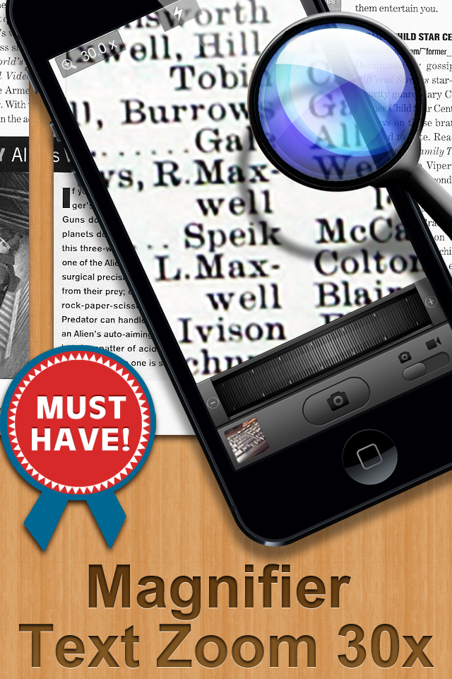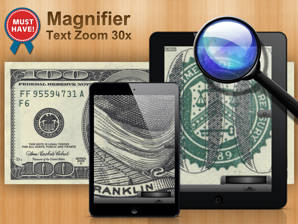 Digital Magnifier 30x zoom application with handy zoom scroller simple and easy to use ! Digital Magnifier is an advanced screen magnification program that enlarges and enhances everything on the phone screen, making your device easier to see and use. • Photo Camera • Front and rear camera • Zoom scroll • Flashlight • Manual focus and continuous autofocus • White balance selector Recommended for cameras higher than 8 Megapixels