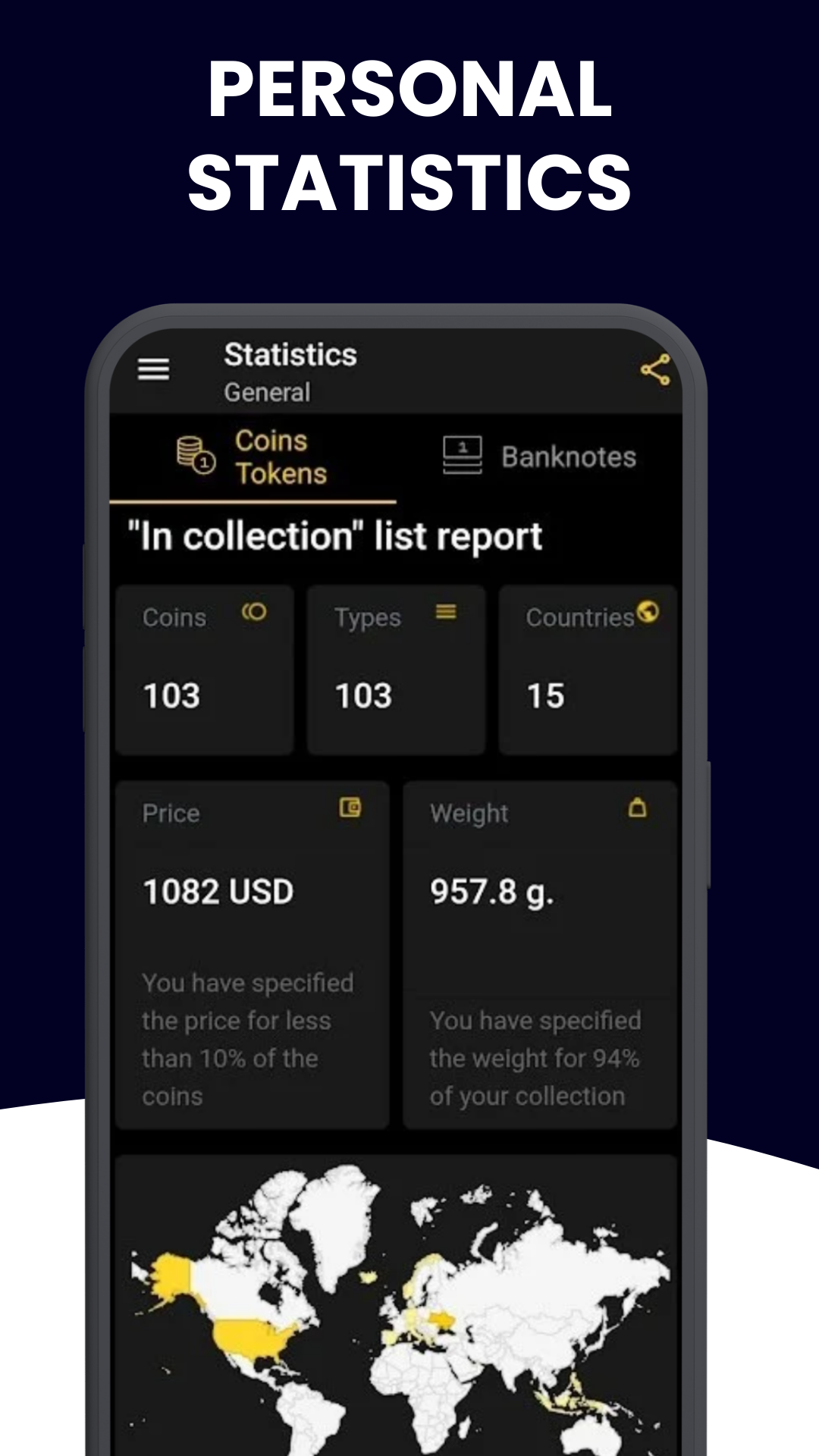 - Visual infographics on a world map show you which countries your coins and banknotes come from