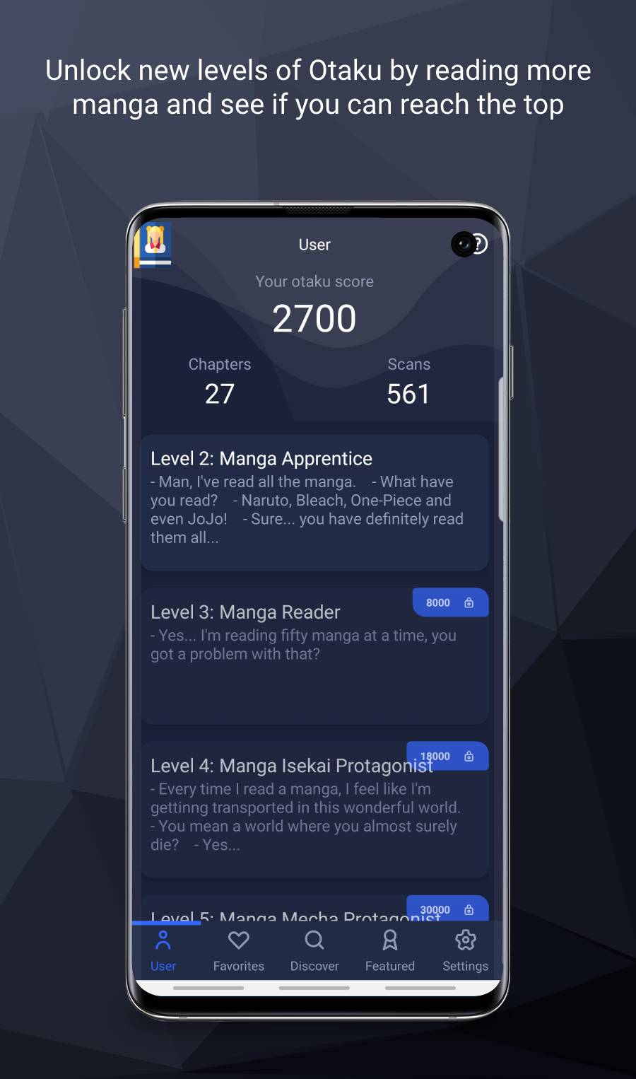 - Otaku level: earn points and new levels by reading manga! our unique function