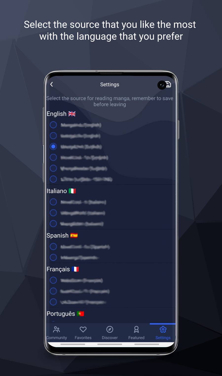 Select the source and start reading your favorite manga, all manga and all Manhwa from the selected source are available and the chapters are always updated automatically, no delays and no need to ask us.