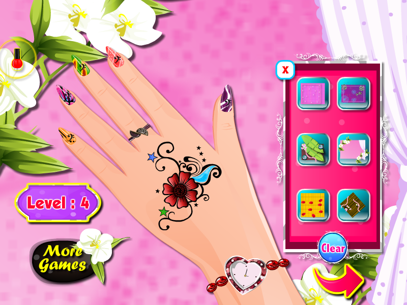 Hello, girls want to look great, they are careful how they dress, how they makeup, how they looks and even how they behave with others people. For a girl to look flawless she needs special care, to get adequate attention girls go to the salon, there they receive some pampering. At the salon they can do many things that can help them be more beautiful, for example, they can get a perfect manicure. If you like to have the most beautiful and healthy nails, then this game for girls is perfect. You will have the opportunity to work in a virtual salon. You will have to do manicure to our young client, be careful to keep in mind and her desires. If she is hurt, please treat her wounds. It is important to follow all instructions and thus the client will be very pleased and will return to your salon. 1) First put ice on the wounds on the hands, apply a special ointment for wounds, disinfect the wounds, take off the thorns with a pair of pliers, apply a cream for scratches, then apply ointment to treat the open wounds, for the wounds left you have to apply three patches and use a spray moisturizes for hands; 2) After you have treated wounds on hands, you must do the manicure. Apply an exfoliating cream, then rinse with warm water, wipe with a towel, cut nails that are broken; 4) Now it is time to give the nail polish, remove old nail polish, the new nail polish you have to apply very nicely and then choose a model perfect for a summer day; 5) After you have taken care of the nails is the time to choose some accessories for hands. You can choose a tattoo. Thank you for choosing this game and invite you to choose and other manicure games, nail games and games for girls to put your skills to the test.