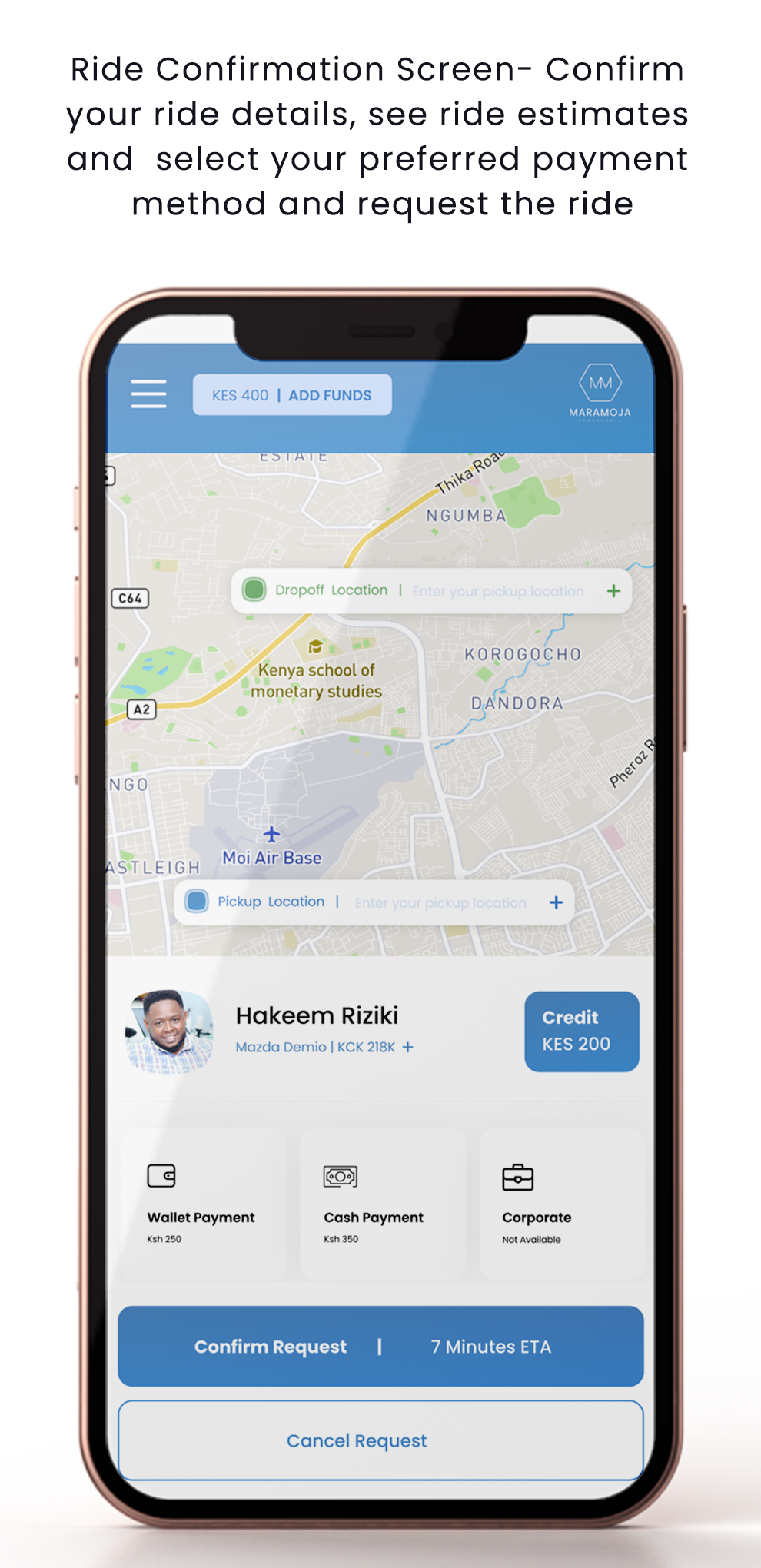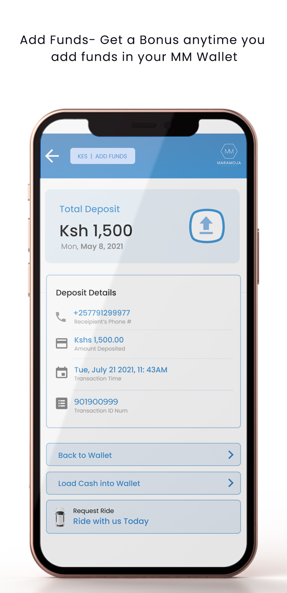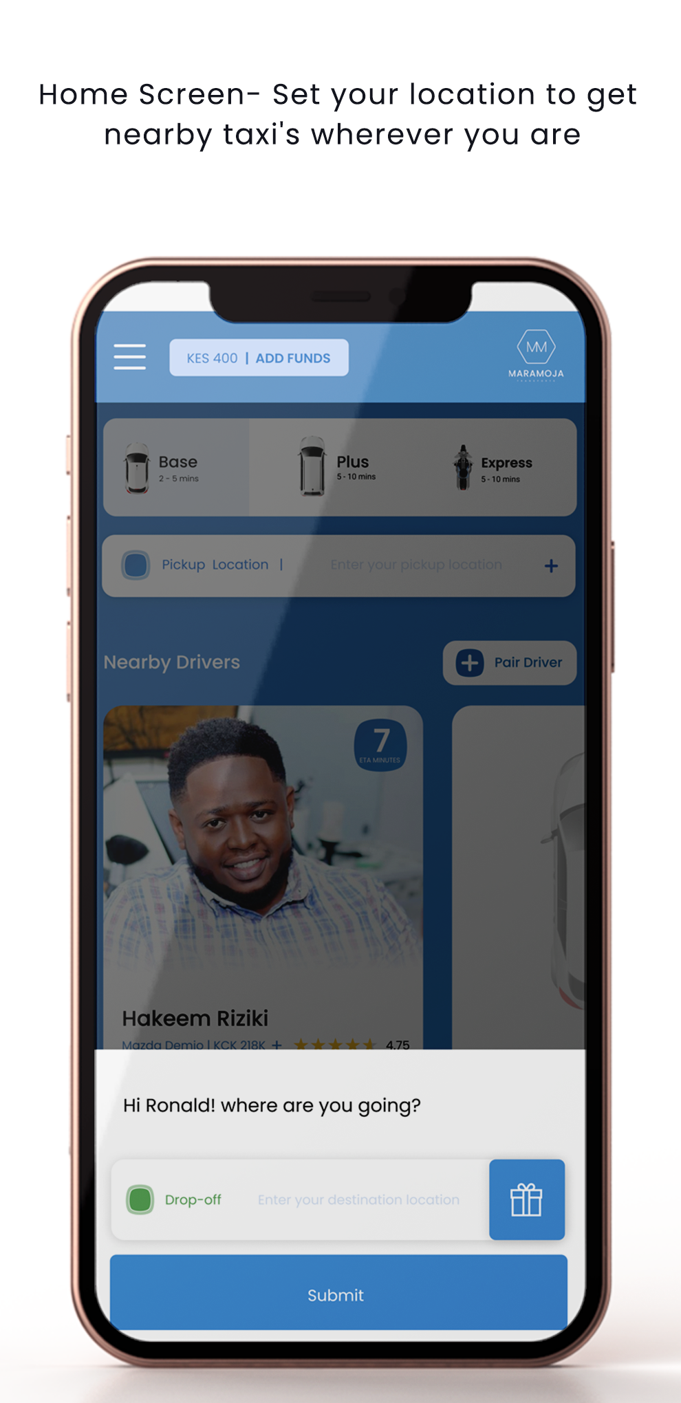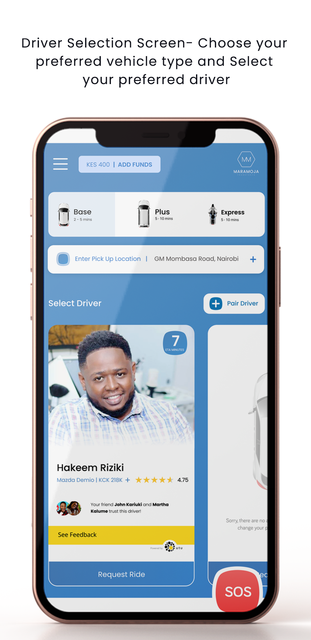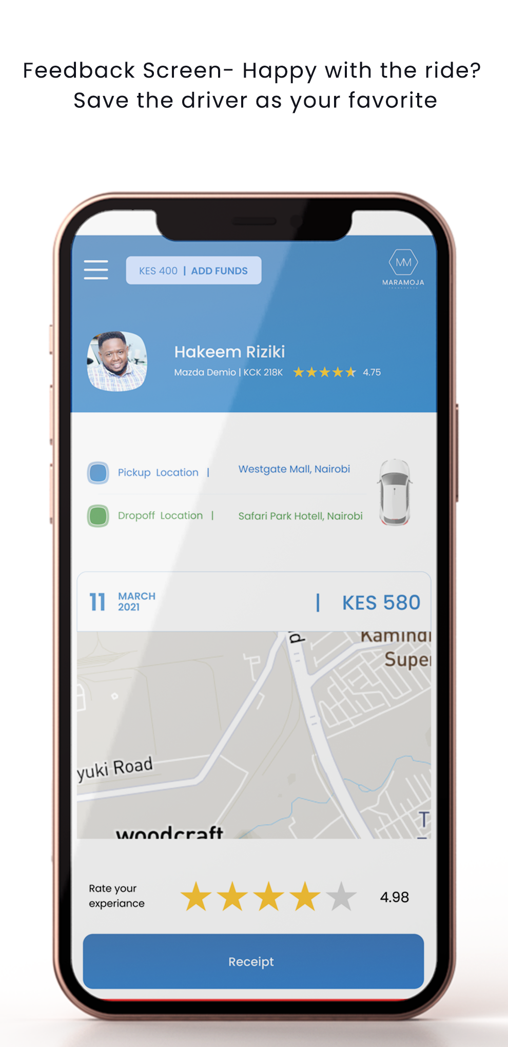 MARAMOJA transport is Kenya’s own and the world’s only socially powered taxi app, built from the ground up to tackle Nairobi’s specific transportation challenges. Our app is deeply rooted in Nairobi’s unique taxi culture - values such as trust, relationships, referrals, and loyalty. We provide you access to your most trusted drivers all around Nairobi based on your existing network of trusted taxis and friends, as well as their real-time location, availability. MARAMOJA - the transport you need, through the people you trust. BENEFITS INCLUDE: [✔] Safe & Secure. We deliver you a completely personalized fleet of vetted drivers, based on your existing taxi preferences. [✔] Reliable & Predictable. Don’t wonder where your driver is anymore, see his location in real-time, and pay consistent fair prices regardless of conditions and time. No more price gouging or worrying if drivers will show up! [✔] Free & Easy. No charges to download or use. The app determines your locations, finds available drivers, lets you know when they arrive, and securely manages payment. [✔] Fixed prices and flexible payment. Never argue with another taxi driver over prices; pay the same amount, day or night, rain or shine. We accept mobile money, credit, cash, and corporate invoicing directly. HOW TO USE: Tap the “Request Ride” button at the bottom of your screen. Enter your destination and phone number, choose the vehicle type you want, and then tap “Request Ride.” Review your trip details. Select your preferred driver and tap “Confirm”. Watch as your driver comes to you. Receive an alert when he arrives. Pay quickly and safely by credit card, mobile money, e-invoice, or cash. Share MARAMOJA transport with your friends and watch the money pile up in your account.