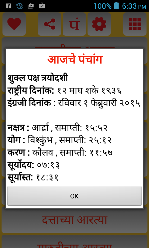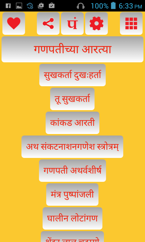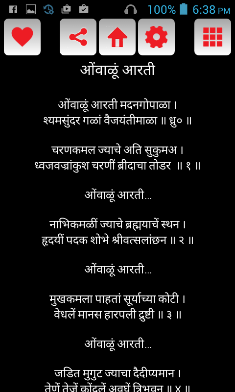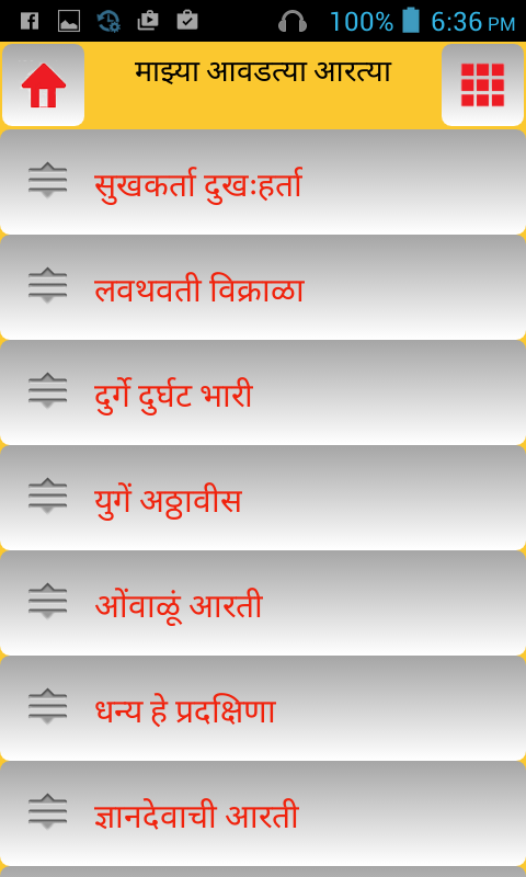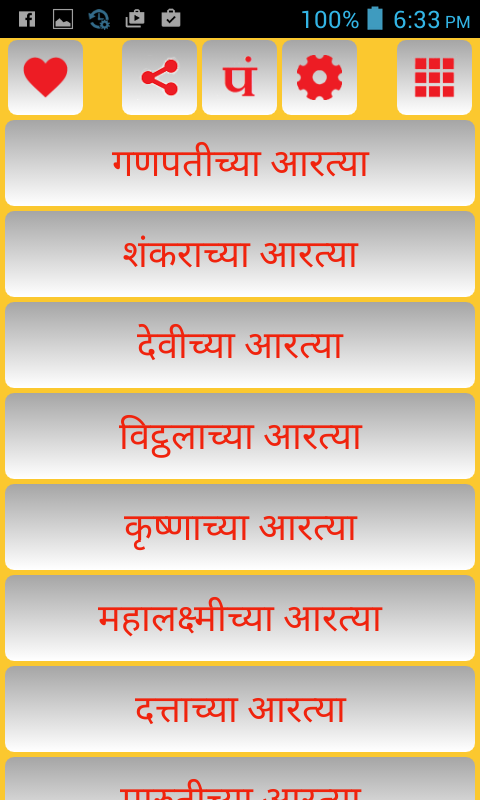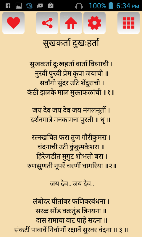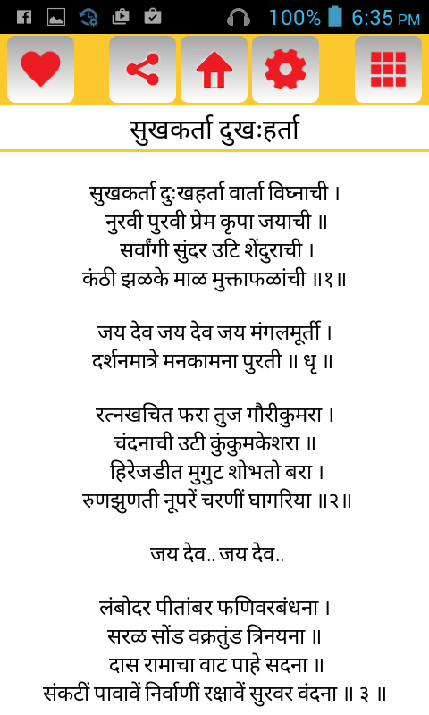 A very well designed and developed Marathi Aarti Collection application. The application contains number of aartis of various deities of Hindu religion. Work in progress to increase Aarti collection. If you wish to provide any suggestions or report any issue please mail to [email protected]. NOTE : You can use this app only if your device supports Devnagri font.