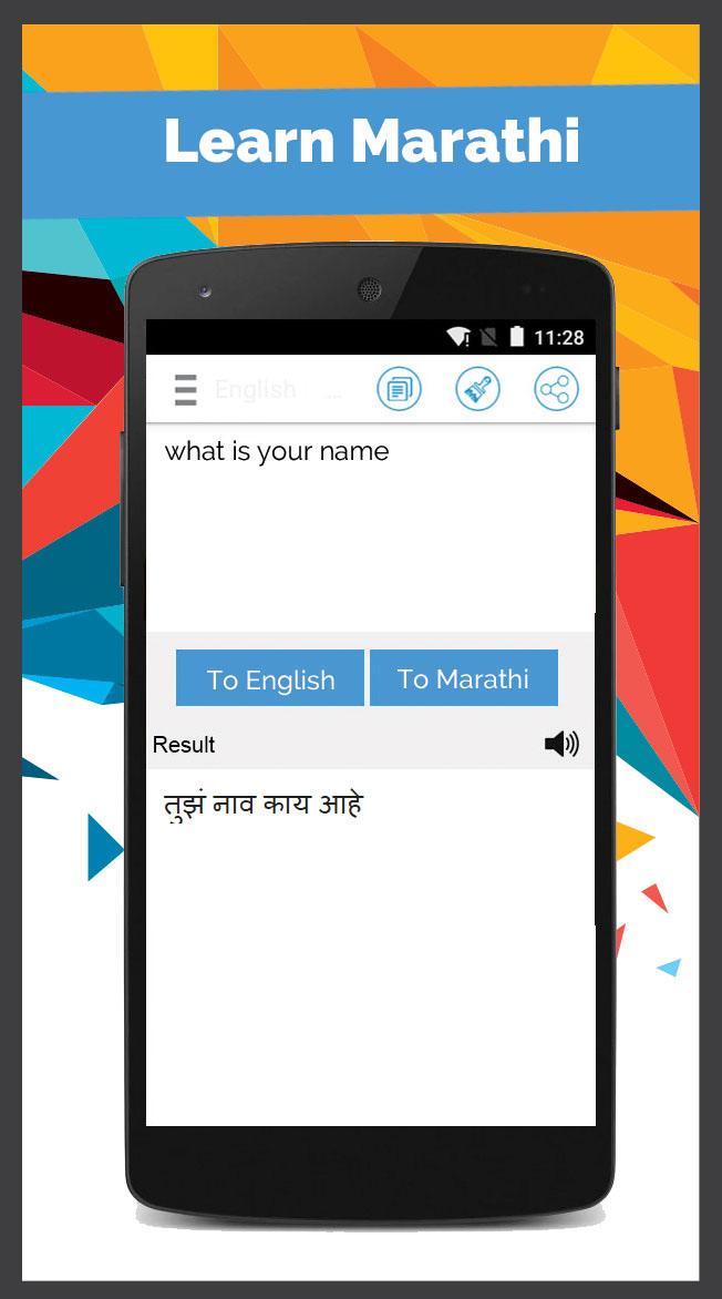Marathi English Translator (Package Name: sba.english.marathi) is developed by DictionaryAndTranslation and the latest version of Marathi English Translator Best Translator was updated on September 27, 2018. Marathi English Translator is in the category of Books & Reference. You can check all apps from the developer of Marathi English Translator and find 7 alternative apps to Marathi English Translator on Android. Currently this app is for free. This app can be downloaded on Android 2.3.2+ on APKFab or Google Play. All APK/XAPK files on APKFab.com are original and 100% safe with fast download.
