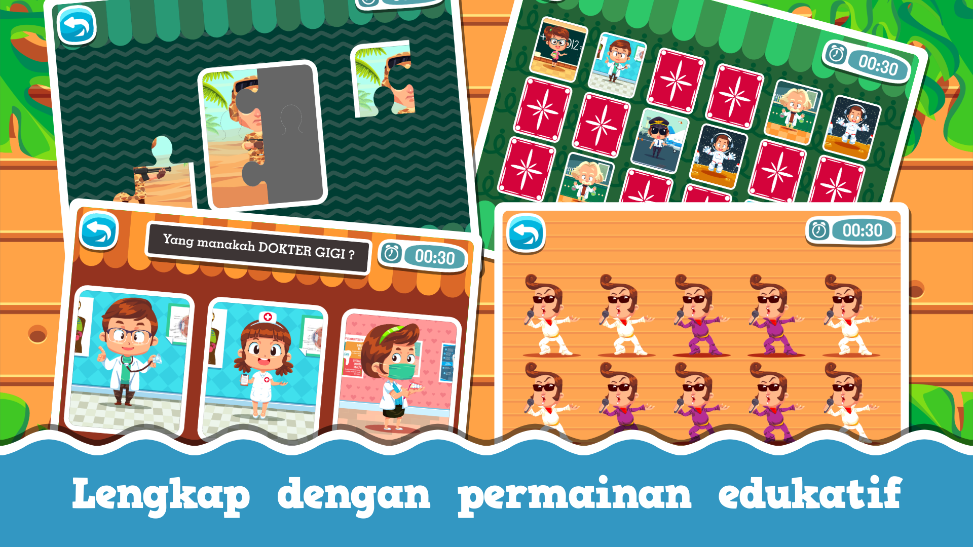 Complete! Children can learn more than 15 types of professions that are around. Equipped with animation and voice narration so that children can understand each explanation well!