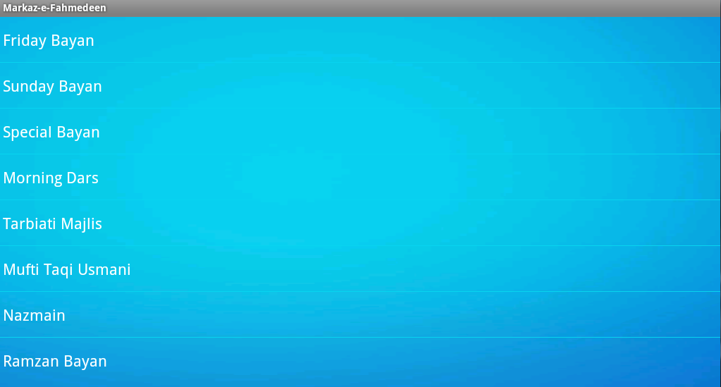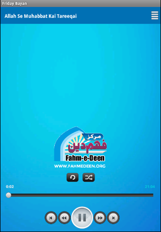 Our website www.fahmedeen.org offers a service of regularly updated audio bayans which include Juma Bayans, Islahi Majlis Held on Sunday at Masjid Bait us Salam, (Defence, Phase IV, Karachi) and other bayans of Maulana Abdus Sattar (Imam and Khateeb Masjid Bait us Salam) and special bayans by other eminent religious scholars like Shaikh ul Islam Mufti Taqi Usmani Sahab. The site also provides access to the Ramdhan Bayans by Maulana Abdus Sattar and offers a beautiful collection of Nazams.