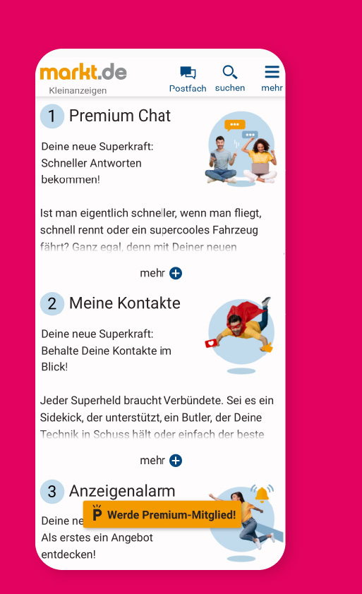 With the markt.de classifieds app, you have access to over 2000 categories and can find used or new items.