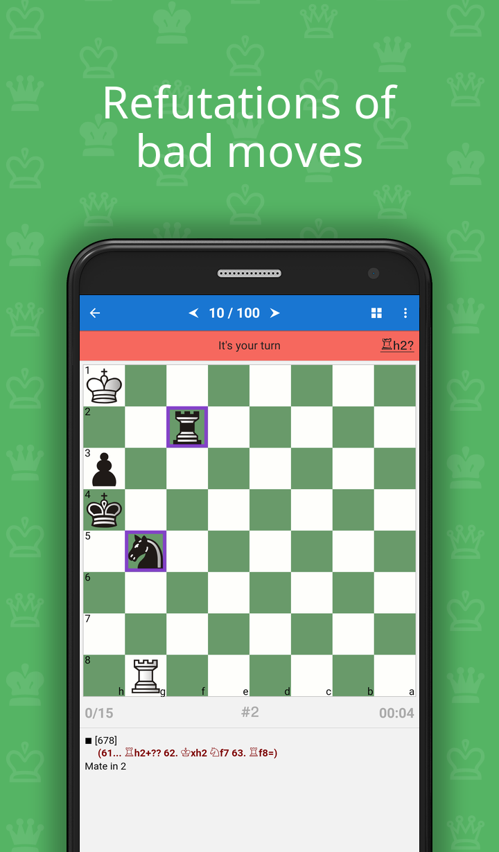 The best way to improve your game is to train yourself on your device in solving problems from practical games. If you a beginner but already know how to mate in 1 move, you have to move on and learn how to attack a king and give mate in 2 moves! This course includes 19 000 exercises from masters games. In every exercise you will have to find a best continuation for an attack against the king. All the exercises are taken from practical games and arranged according to the names of pieces and difficulty levels. A great number of exercises makes the course an excellent tool for quick training both beginners and club players. This course is in the series Chess King Learn (https://learn.chessking.com/), which is an unprecedented chess teaching method. In the series are included courses in tactics, strategy, openings, middlegame, and endgame, split by levels from beginners to experienced players, and even professional players. With the help of this course, you can improve your chess knowledge, learn new tactical tricks and combinations, and consolidate the acquired knowledge into practice. The program acts as a coach who gives tasks to solve and helps to solve them if you get stuck. It will give you hints, explanations and show you even striking refutation of the mistakes you might make. Advantages of the program: ♔ High quality examples, all double-checked for correctness ♔ You need to enter all key moves, required by the teacher ♔ Different levels of complexity of the tasks ♔ Various goals, which need to be reached in the problems ♔ The program gives hint if an error is made ♔ For typical mistaken moves, the refutation is shown ♔ You can play out any position of the tasks against the computer ♔ Structured table of contents ♔ The program monitors the change in the rating (ELO) of the player during the learning process ♔ Test mode with flexible settings ♔ Possibility to bookmark favorite exercises ♔ The application is adapted to the bigger screen of a tablet ♔ The application does not require an internet connection ♔ You can link the app to a free Chess King account and solve one course from several devices on Android, iOS and Web at the same time The course includes a free part, in which you can test the program. Lessons offered in the free version are fully functional. They allow you to test the application in real world conditions before releasing the following topics: 1. King + queen 2. King + rook 3. King + bishop 4. King + knight 5. King + pawn 6. Queen 7. Queen + rook 8. Queen + bishop 9. Queen + knight 10. Queen + pawn 11. Rook 12. Rook + bishop 13. Rook + knight 14. Rook + pawn 15. Bishop 16. Bishop + knight 17. Bishop + pawn 18. Knight 19. Knight + pawn 20. Pawn 21. Any piece checkmates