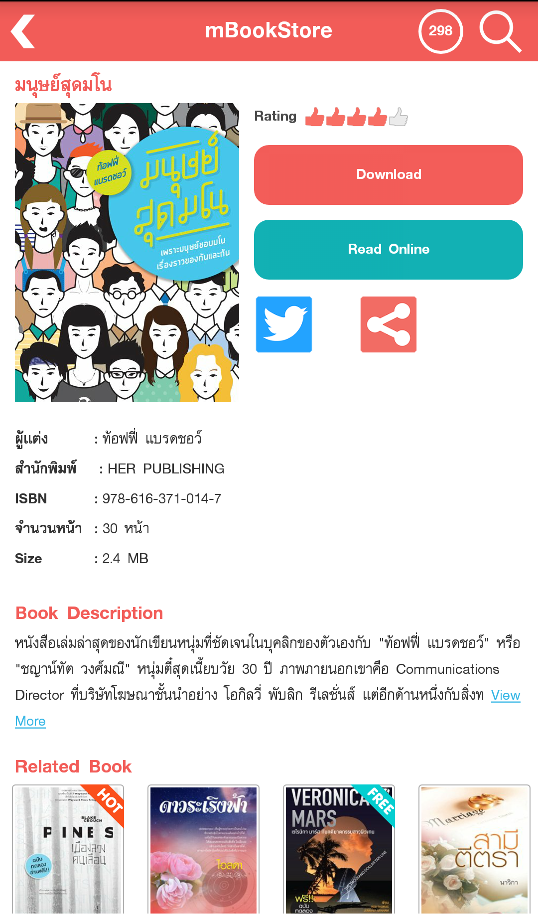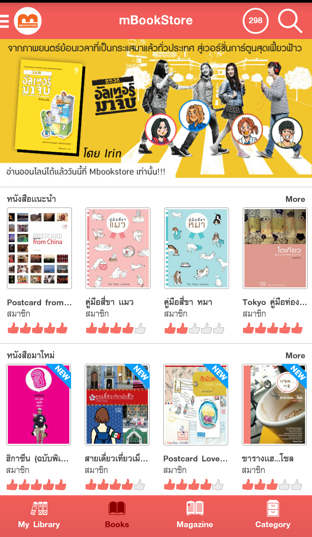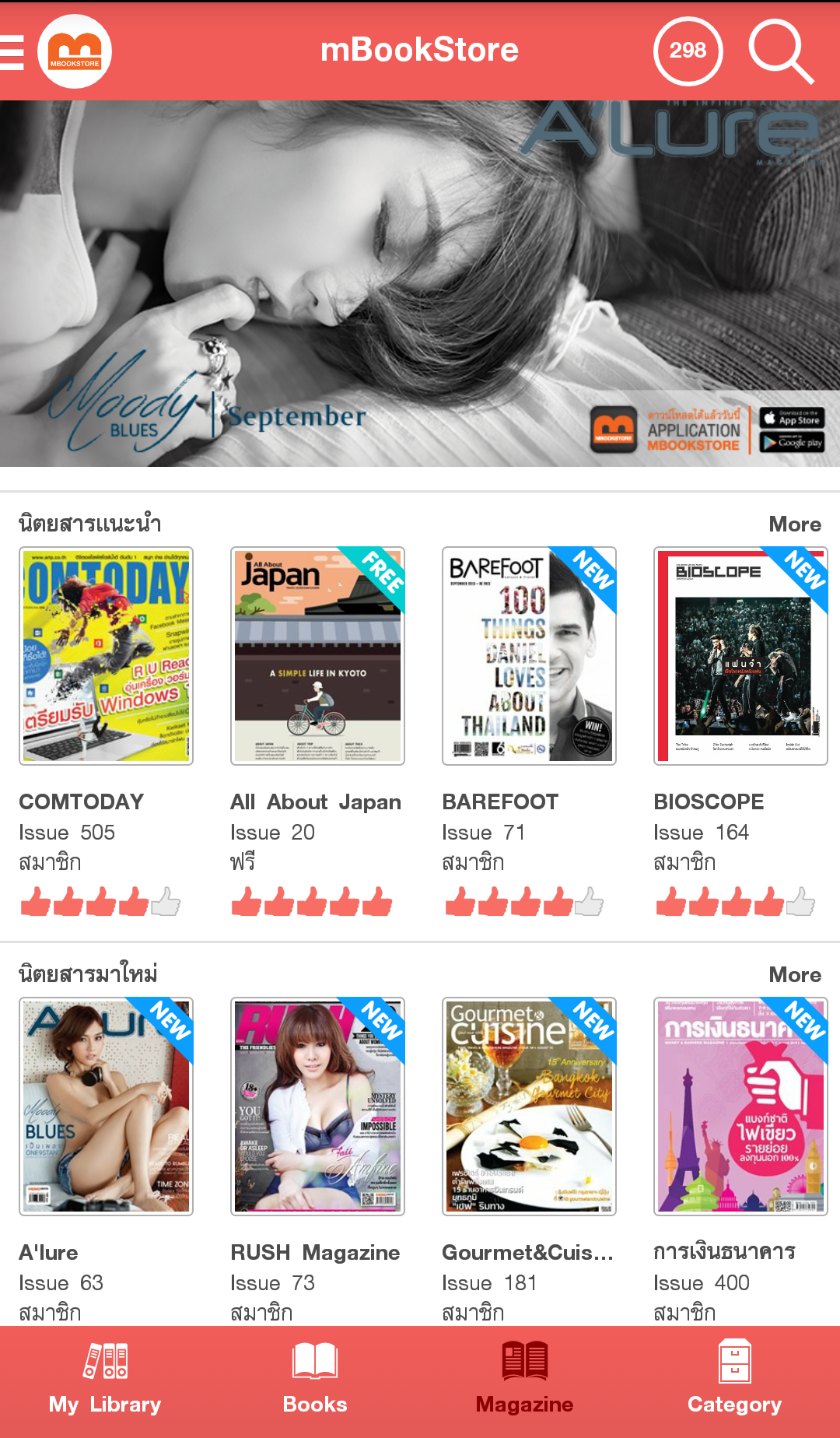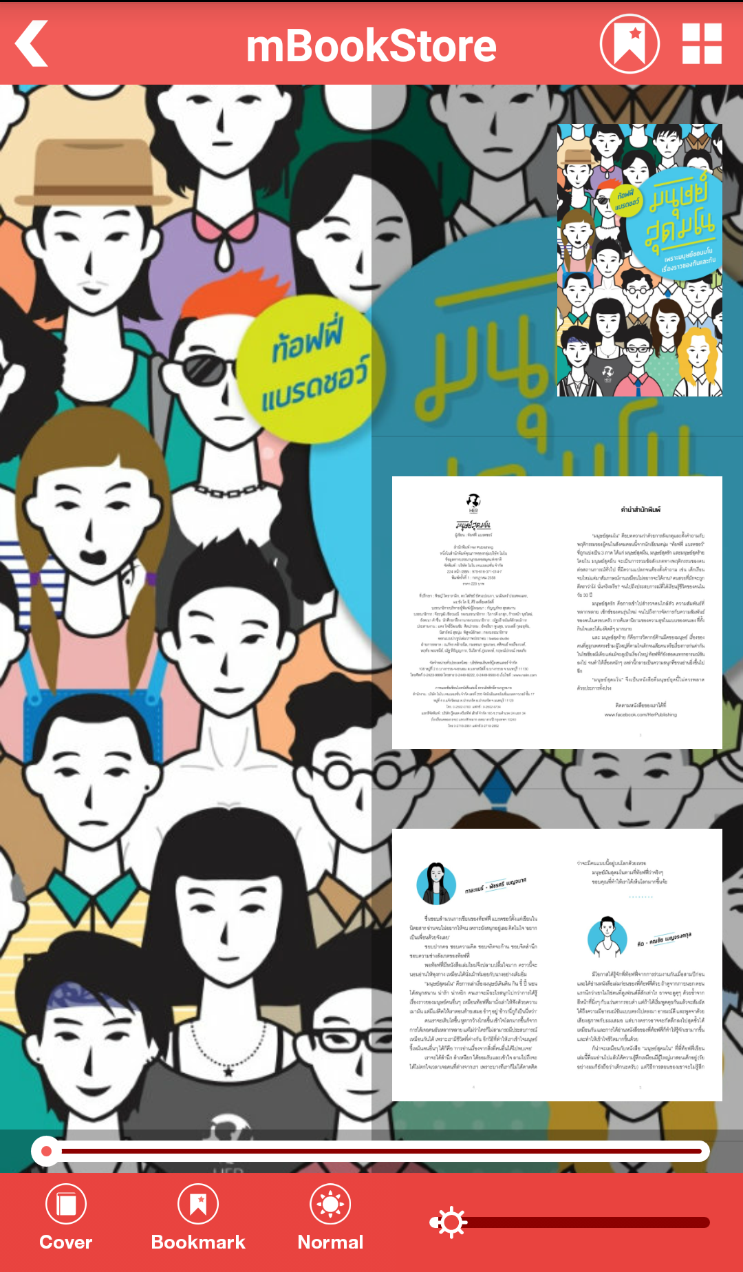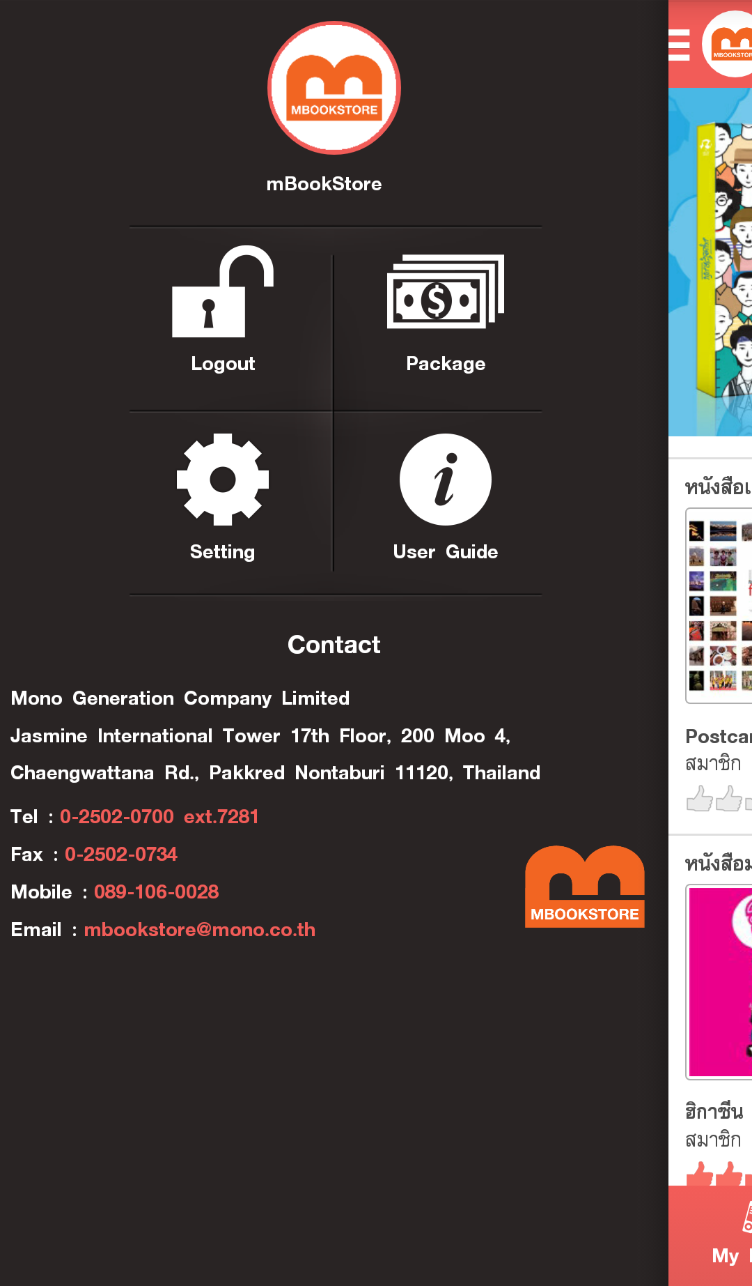mBookStore คืออะไร เราตั้งใจมุ่งมั่นให้ mBookStore เป็นแหล่งรวบรวมหนังสือหลากแบบ หลายสไตล์ เพื่อสนับสนุนให้เกิดชุมชนรักการอ่าน เป็นคลังหนังสือออนไลน์ อ่านได้ทุกที่ทุกเวลา และเพื่อเพิ่มอรรถรสในการอ่านหนังสือออนไลน์ กับ mbookstore.com ด้วยราคาเบาๆ เริ่มต้นที่ 6 บาท ต่อ วัน หรือ 199 บาท ต่อเดือน มีระบบสมาชิกเพื่อรองรับการอ่านแบบ Exclusive ได้แบบไม่จำกัด ซึ่ง Account เดียว สามารถอ่านได้จากทั้งทาง เว็บ www.mbookstore.com และ Andriod Application , iOS Application (mBookStore) mBookStore มีนิตยสารชั้นนำ ให้อ่านชนแผง เช่น เที่ยวรอบโลก, BAREFOOT, @Kitchen. Gourmet&Cuisine, Gossip Star, A’lure, Digital Age, Bioscope, Formular, Life and Home, การเงินการธนาคาร, T3 GADGET Magazine, ComToDay, a day BULLETIN, a day BULLETIN LIFE, All about Japan, Hoon Inside, Campus Star, Look Around, Snap [keywords] "mbook" "book" "books" "bookstore" "ebook" "book online" "online book" "onlinebook" "magazine" "free copy" "read" "free" "หนังสือ" "อ่านหนังสือ" "นิตยสาร" "บุ๊ค" "อ่านหนังสือออนไลน์" "หนังสือออนไลน์"