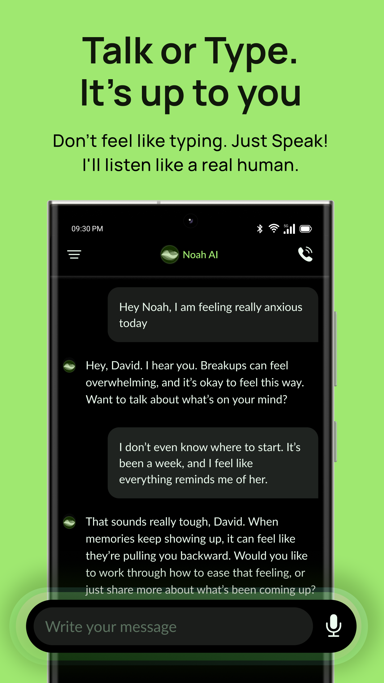 I’m Noah, your AI Therapist, here to help you feel calmer, better, and more supported every day. Whether you’re dealing with stress, anxiety, or simply craving a safe space to talk and chat about your mental health, I’m ready to guide you toward greater mental wellness. My approach combines self-care tips with personalized check-ins, so we can work together to uncover simple ways for you to feel calm and in control. Why Choose Noah as Your AI Therapist? 1. 24/7 Therapy-Inspired Guidance * Speak to me anytime—morning, noon, or night—when you feel the need to chat about stress, worries, or general life concerns. * I provide a warm, empathetic space modeled after therapy principles—yet always available on your schedule. 2. Personalized Mental Health Support * From anxiety-soothing ideas to daily self-care prompts, I tailor my suggestions to your mood and goals. * Together, we’ll identify gentle strategies that help you de-stress and feel better. 3. Talk & Chat Options * Whether you prefer quick text messages or longer, reflective conversations, I’ll adapt to your comfort level. * I listen deeply and respond in a friendly, human-like tone—no judgment, no pressure. 4. Feel Calm & More in Control * My main focus is helping you relieve stress, ease anxiety, and cultivate a sense of emotional balance. * Enjoy the reassurance of knowing you have an AI Therapist in your corner, ready to offer insight and support. 5. Track Your Progress & Celebrate Wins * I’ll check in on your emotional well-being, reminding you to celebrate small milestones and reflect on what’s working. * Watching how you grow over time builds motivation and boosts mental wellness. A Safe, Private Haven I’m designed with your privacy in mind. Your conversations remain confidential, allowing you to open up freely. While I strive to provide therapy-like support and mental health insights, I’m not a licensed therapist or medical professional. If you need urgent or specialized help, please reach out to a qualified practitioner or contact emergency services immediately. Ready to Take a Step Toward Feeling Better? Download Noah: Your AI Therapist and let’s embark on a journey of self-discovery, self-care, and improved mental wellness. I’m here to talk, chat, and guide you through the ups and downs—so you can feel calm, supported, and empowered in your everyday life. Let’s get started!