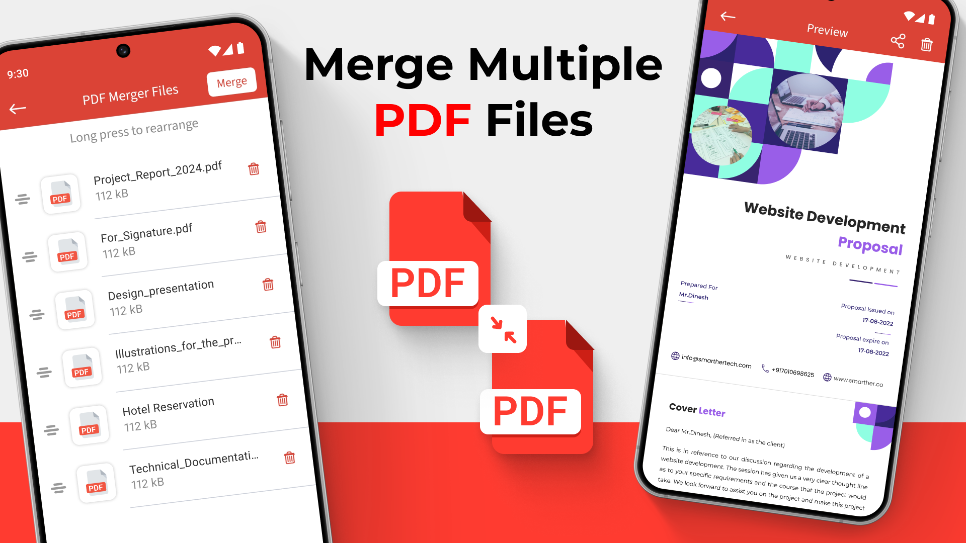 PDF Merger App: Merge PDF Files with One Touch!Now it is easy to Merge Multiple PDF Files into one! Our PDF Merger App combines several documents at the same time with just one click. No longer will you waste time merging and documenting files. It's the perfect software utility for anyone needing document merging – be it work, school or personal use! Easily combine PDF files into one with just a few clicks. 🗄️PDF Merger And Splitter - Key Features :🗄️ 📄 Combine different content in one document – PDF Merger App; 📄 Tool allows merging and splitting files with easy drag and drop feature; 📄 Combine files and folders with simple and easy user interface; 📄 PDF Combiner feature makes sure no quality is lost from the original files; 📄 Digital folders make it easy to find and organize combined and split files; 📄 Never lose important documents! Files stay on device for secure processing. PDF Merger App: Easy to Combine PDF in Few Steps!Combining files has never been easier! Our File Merger App allows you to Merge Multiple PDF Files and merge them into one in simply a few steps! With the use of the PDF joiner tool, you can rearrange documents to your liking before combining them into one. You can smoothly and reliably combine numerous documents for your notes, reports or even presentations and this tool makes the entire process easy. Save time and stay organized—combine PDF files into one today! 🗄️How to Use This PDF Joiner Tool:🗄️ 1️⃣ Install the PDF Merger App and click on Choose PDF; 2️⃣ Pick the documents you wish to merge from your mobile device; 3️⃣ Organize the files in the preferred order with the help of drag-and-drop; 4️⃣ Click Merge which will allow you to Merge PDF Files into one document; 5️⃣ Save the merged document as now it can be accessed anytime! Powerful PDF Merger And Splitter:🗃️ This PDF splitter and merger not only enables you to Merge PDF Files but it also lets you separate big size PDF's into individual documents making document management easier. It doesn’t matter if you are looking for a PDF combiner to merge documents, reports or a file merger app to split large documents, this tool can do it all. Combine PDF files into one and simplify your document workflow. Organize Your PDFs Like a Pro:📁 Utilize this PDF joiner tool efficiently to manage and organize all your documents in one place. With the help of PDF combiner, your files will be easily accessible and well structured. Tired of keeping abreast with various unorganized files. Don’t fret because we got a solution for you. Try this file merger app. Merge reports, invoices, or forms—combine PDF files into one seamless document. Merge Multiple PDF Files with Ease!All your issues of separately structured pdf files are over once you download and install the PDF merger app. Enjoy the pleasure of merging innumerable pdf files into one and avoid spending endless hours trying to grasp the messy organization of documents. Whether you’re at work or school, this file merging app has the ability to simplify everything. Try our free tool to combine PDF files into one instantly. Join the millions of satisfied users and get PDF Merger And Splitter today.