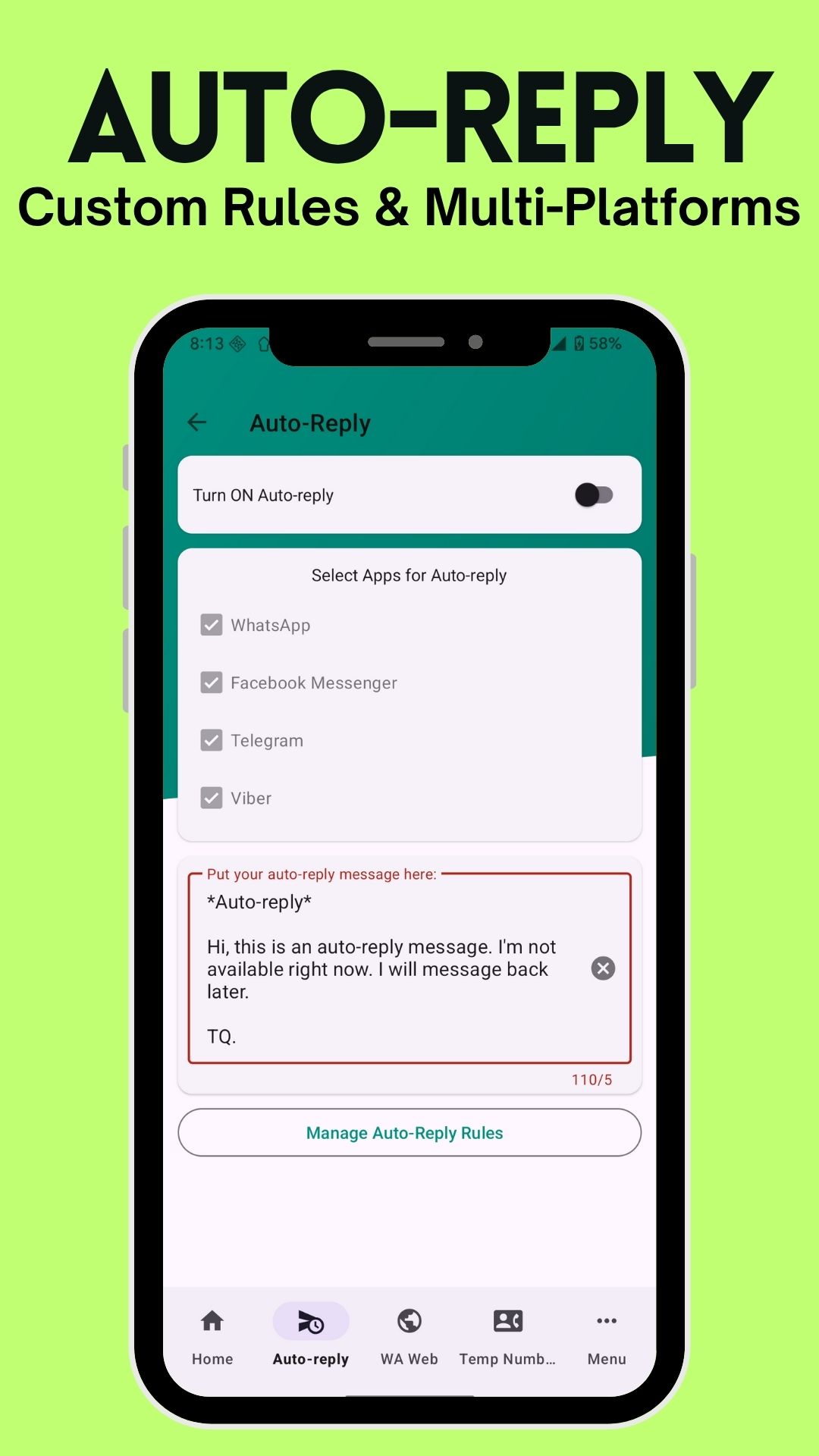 ✅ Smart Auto-Reply: Set custom rules to answer frequently asked questions, send welcome messages, or handle inquiries when you're offline.