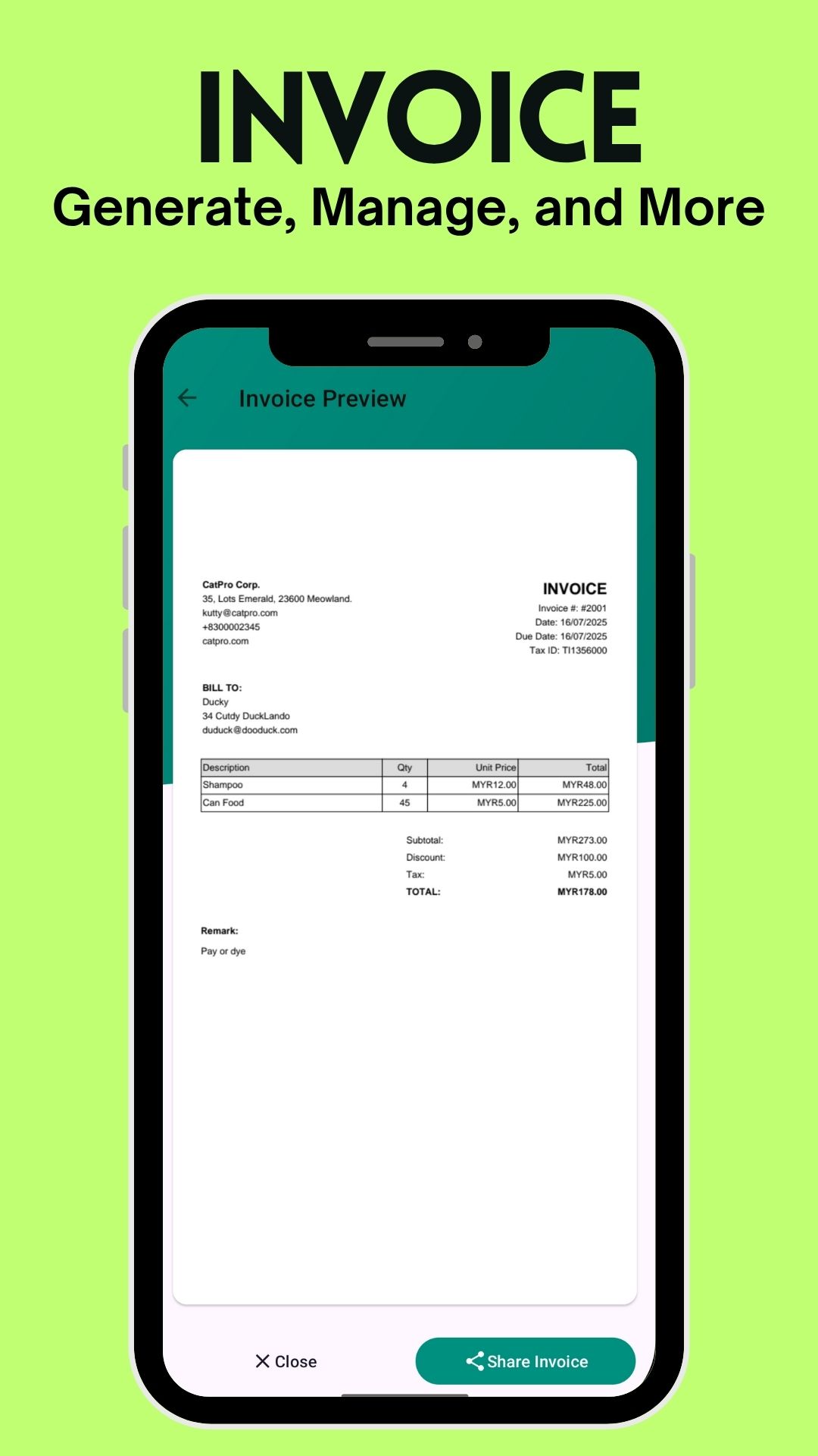 ✅ Professional Invoicing: Create, manage, and send invoices in seconds. Add your business details, manage your item list, and get paid faster—all without leaving the app.