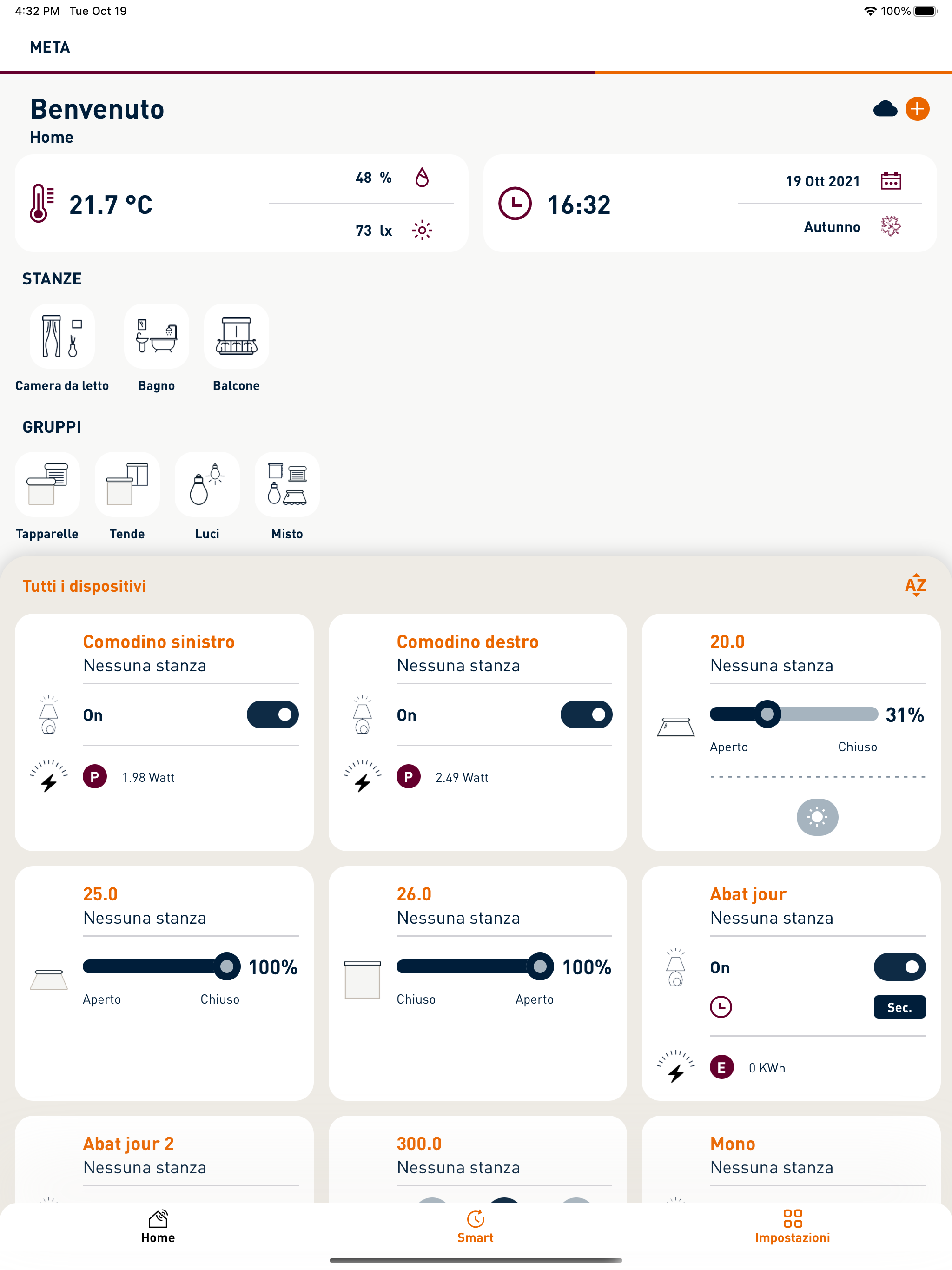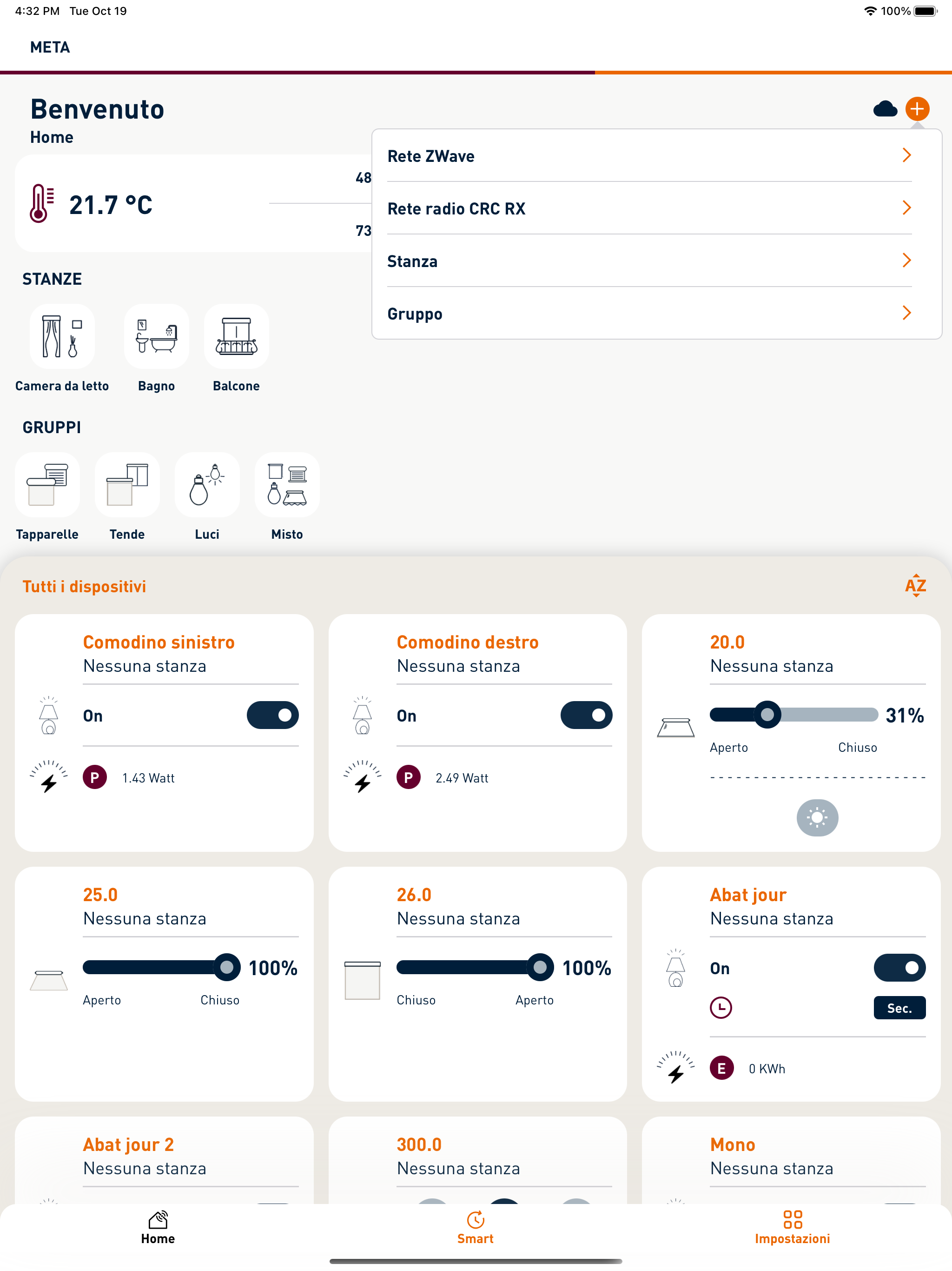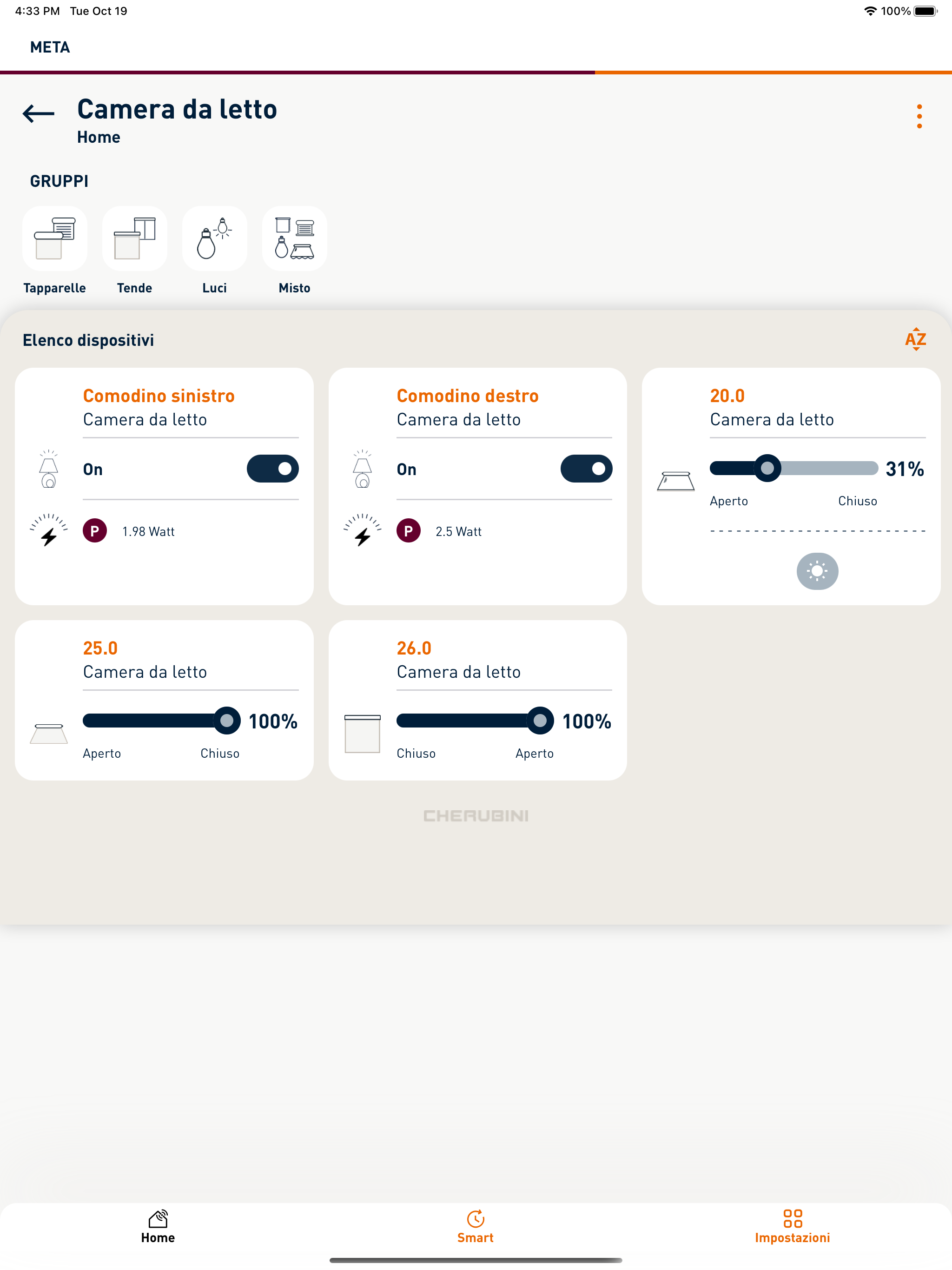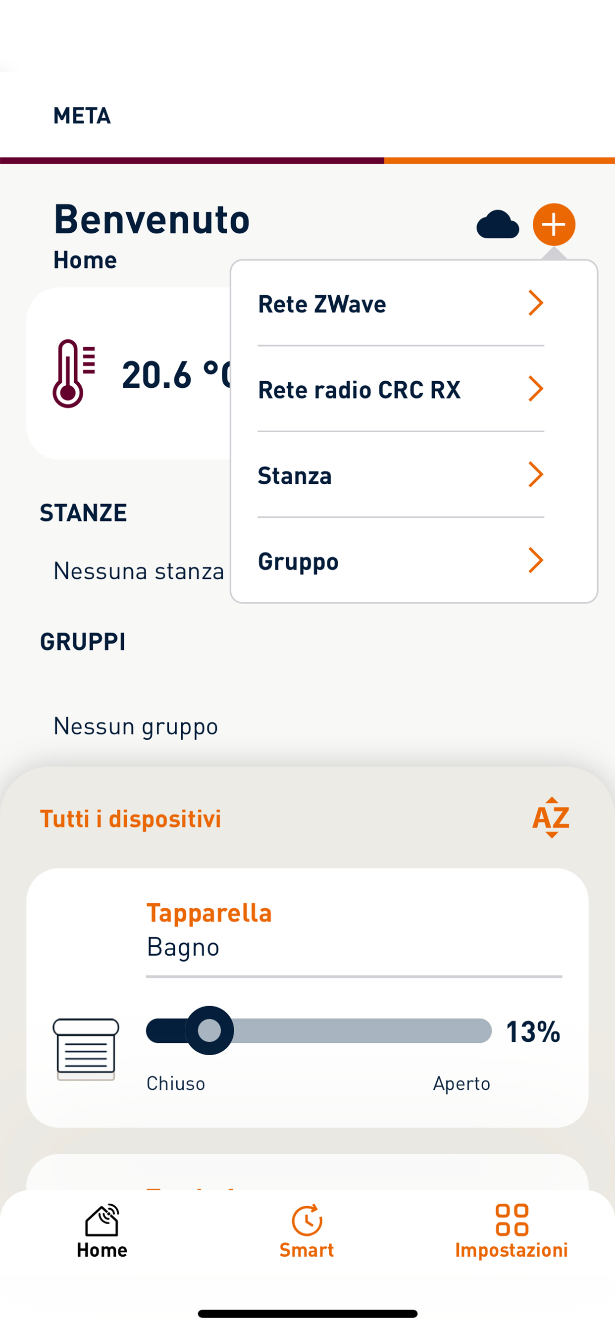 META Cherubini is the app for managing your smart home. Thanks to its simple and intuitive interface, you can control devices connected to the METAHome gateway, such as roller shutters, awnings, screens, lights, appliances, gates, and garage doors. With META Cherubini, you can control all Z-Wave-certified devices and Cherubini CRC RX radio products: create and configure a system, set up and manage rooms and events, and schedule the activation of a series of functions. META Cherubini offers a wide range of configurations and settings to create the best scenarios for your home life. Furthermore, quick and easy commands allow you to manage devices connected to the network in real time, even remotely.