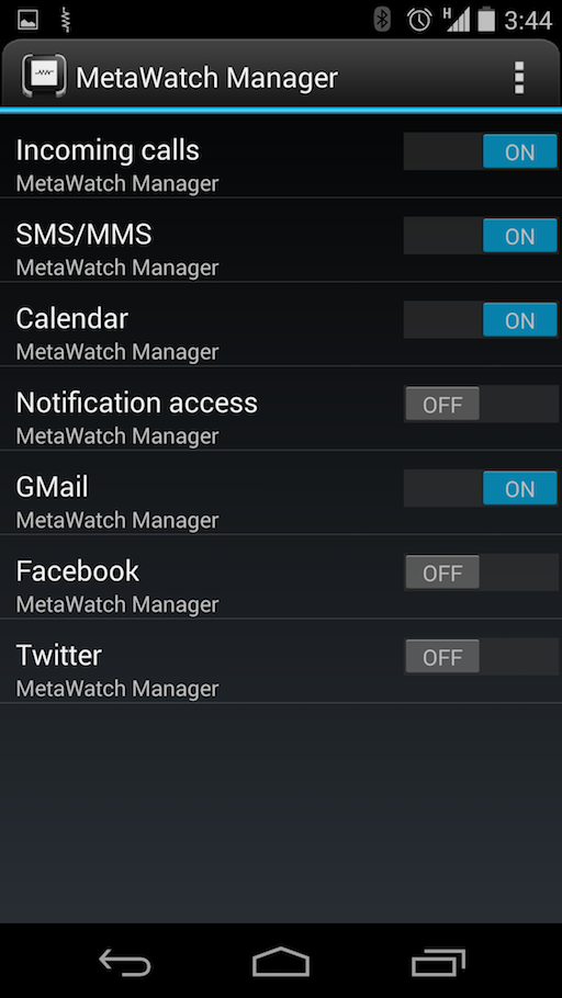 The MWM app in conjunction with your MetaWatch smartwatch, enables you to see a variety of notifications on your watch such as Caller-ID and SMS. The always-on, sunlight readable display of your MetaWatch can be configured on the fly via the MWM with clocks and widgets that give you additional information at every glance.