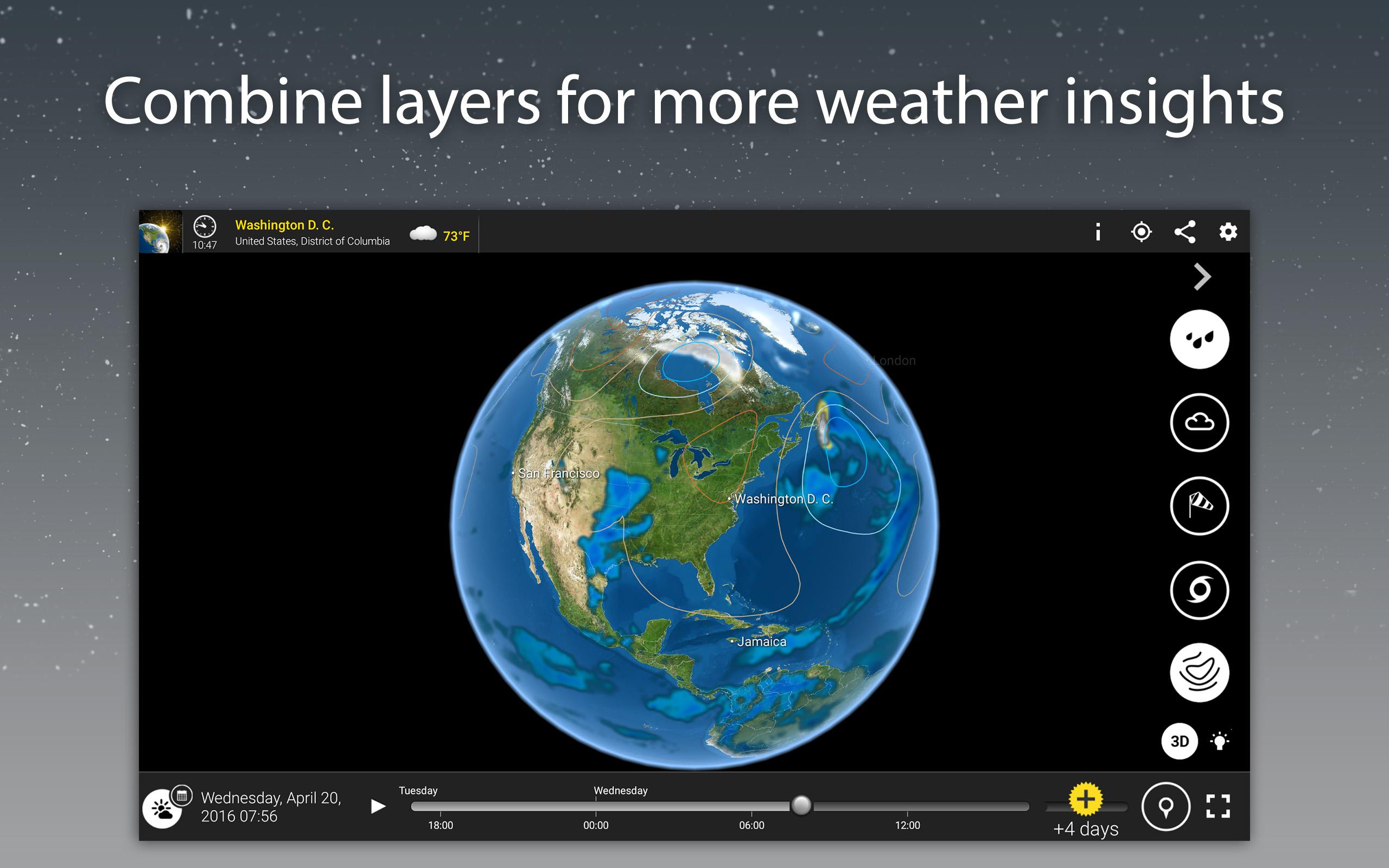 • Choose and combine multiple weather layers to display cloud cover, precipitation, wind, pressure, etc.