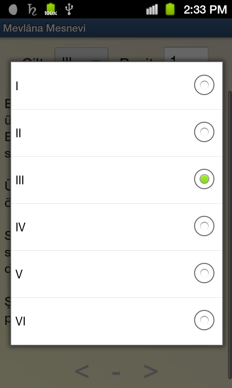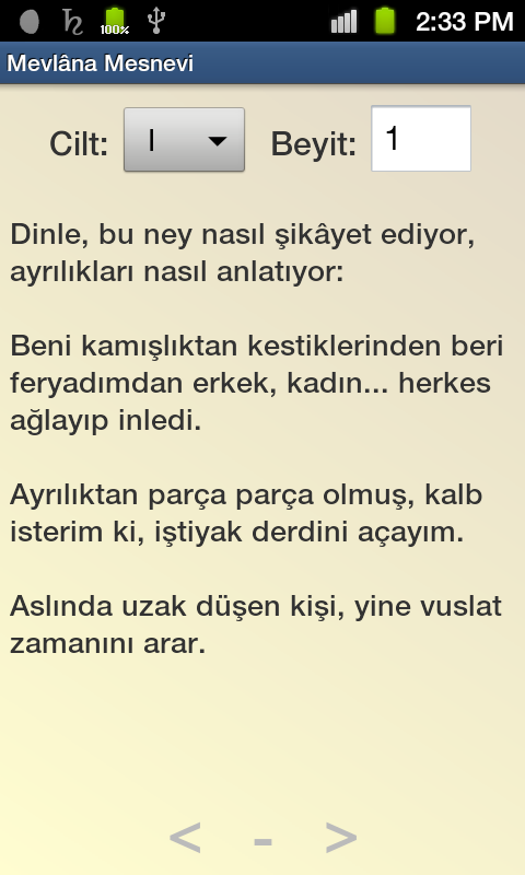 Selam üzerimize olsun. Ekranda her seferinde beş(*) beyitin çevirisi görüntülenir. Sayfa değiştirip, sonraki yada önceki beş beyiti görmek için ekranın altında ok işaretlerinin bulunduğu yerde parmağınızı sağa ya da sola doğru kaydırın. Ayrıca doğrudan cilt ve beyit numarası da seçebilirsiniz. Uygulama her seferinde daha önce kaldığınız sayfayı açar. Beyitleri paylaşmak için yazının üzerine basılı tutun. *Beyit numarası açısından arada ileriye ya da geriye doğru kaymalar olabilmekle birlikte, metnin bütünlüğü korunmuştur. Not: Metin semazen.net adresinden alınmıştır. Veled Çelebi (İzbudak) çevirisidir. (Only available in Turkish)