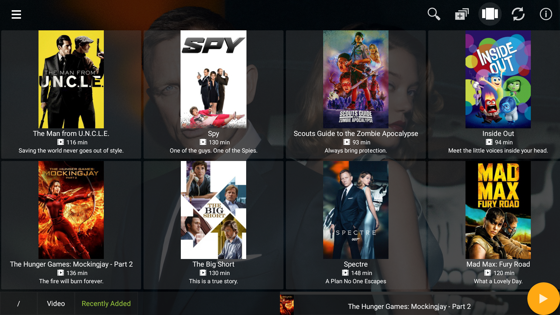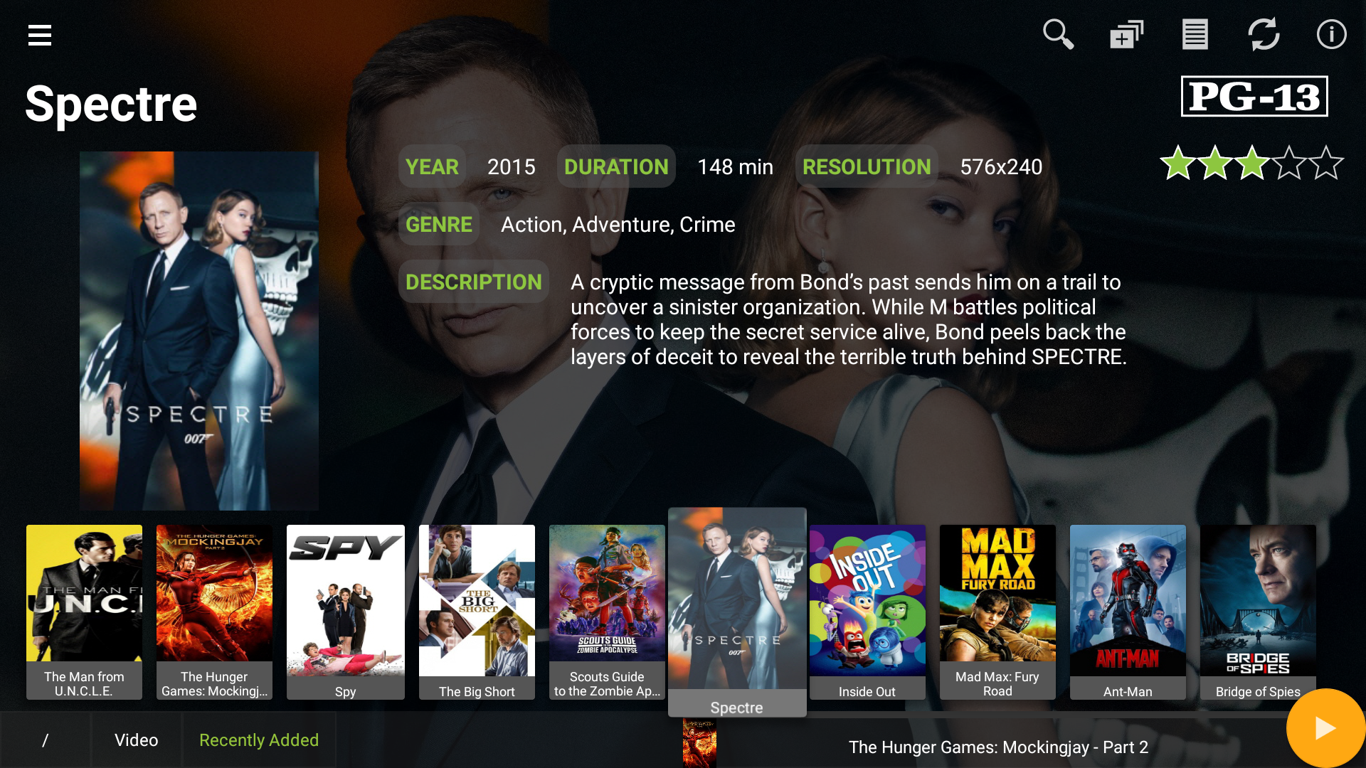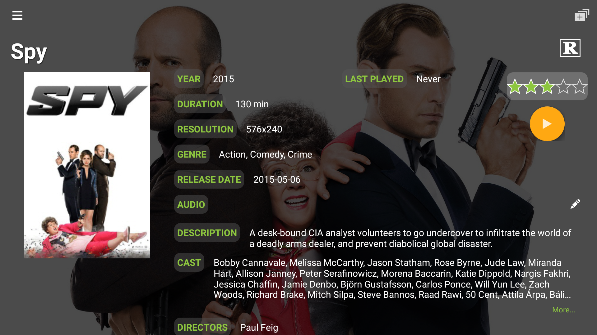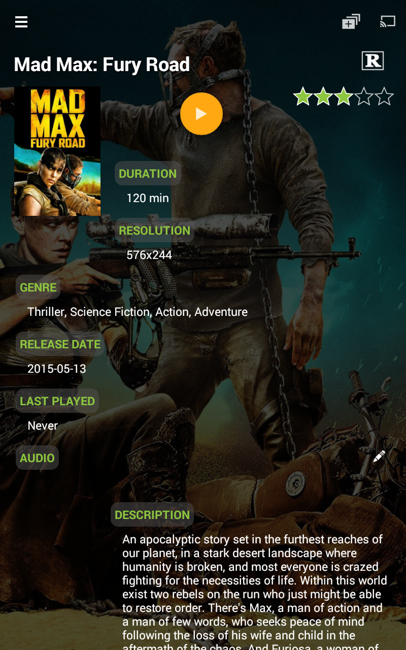 • Full details displayed for movies and TV shows, including title, poster, backdrop, plot, tagline, content rating, user rating, actors, directors, writers, producers, production company (when using with Mezzmo media server).