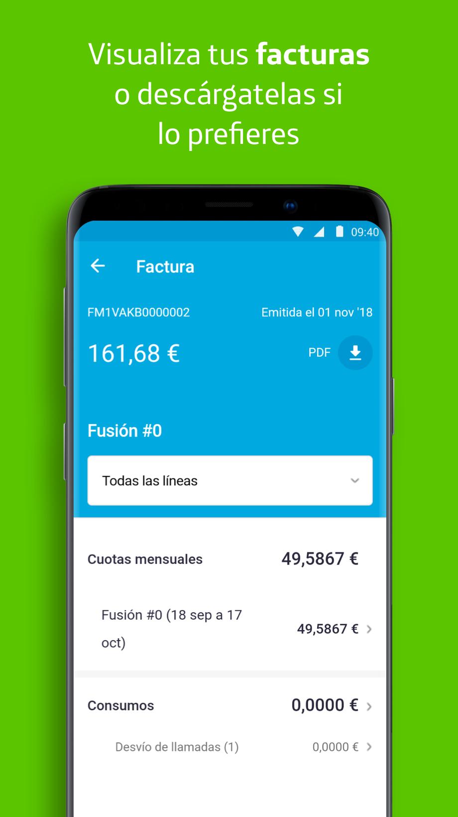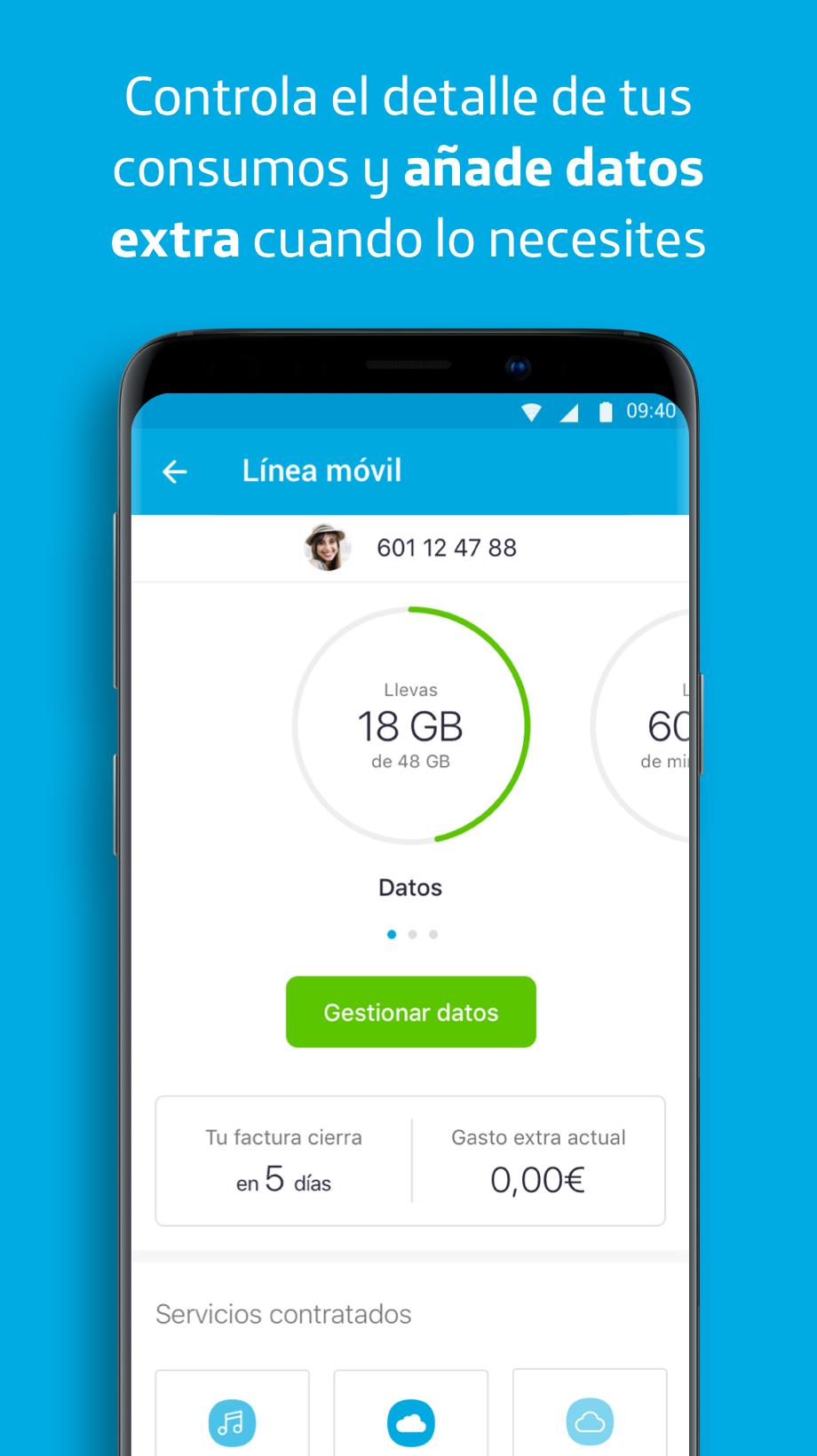 - Gestiona tu línea en tiempo real. Consulta al momento tu consumo de datos y llamadas, tanto de tu línea móvil como línea fija, y la velocidad contratada de Fibra o ADSL Internet. Además, activa el ‘widget’ de consumo para el escritorio de tu móvil y ten siempre a mano esta información sin necesidad de abrir la app.