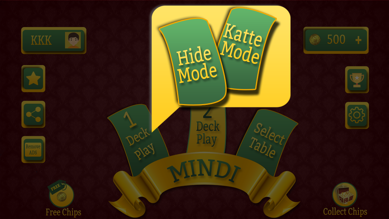 1) Hide Mode- The player to the dealer’s right selects a card placing it to table face down which will be declared as trump suit for that play.