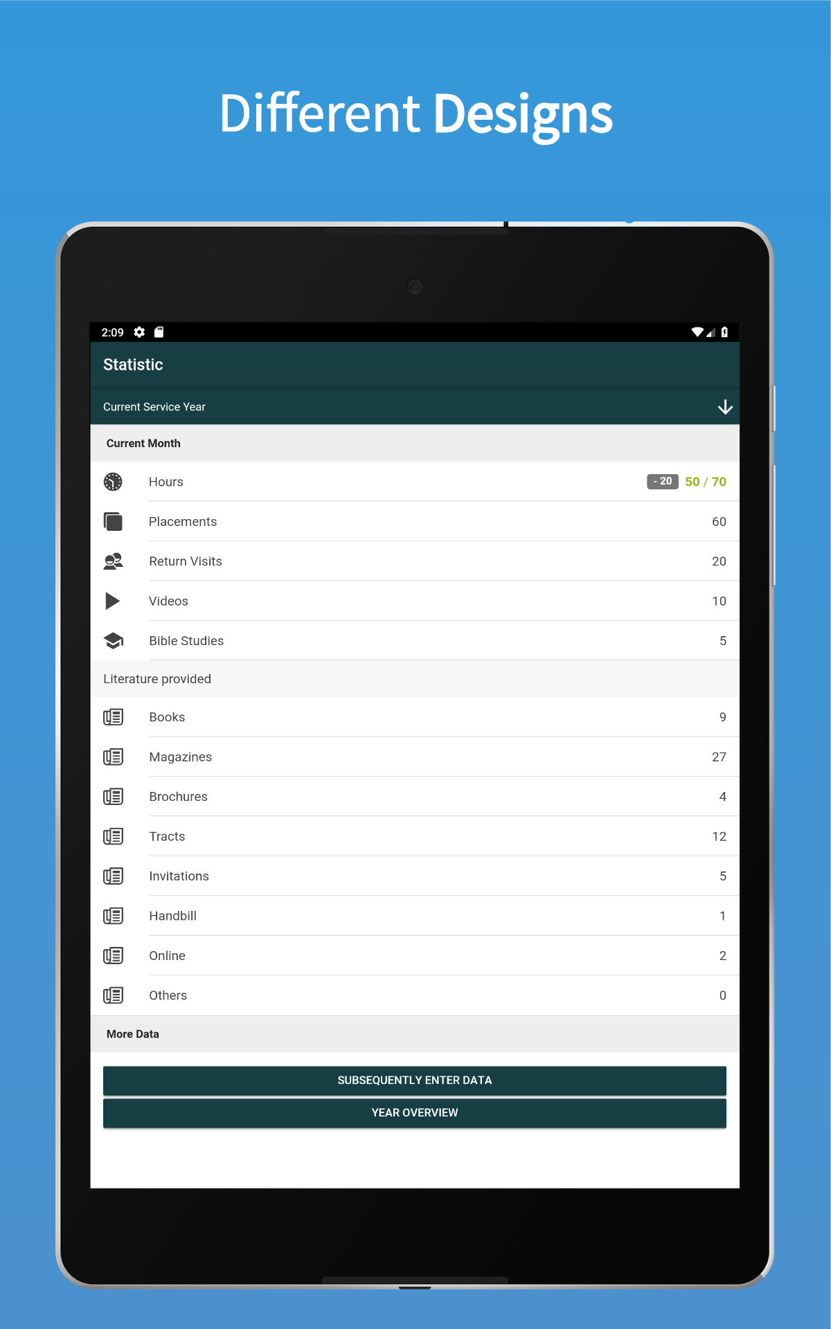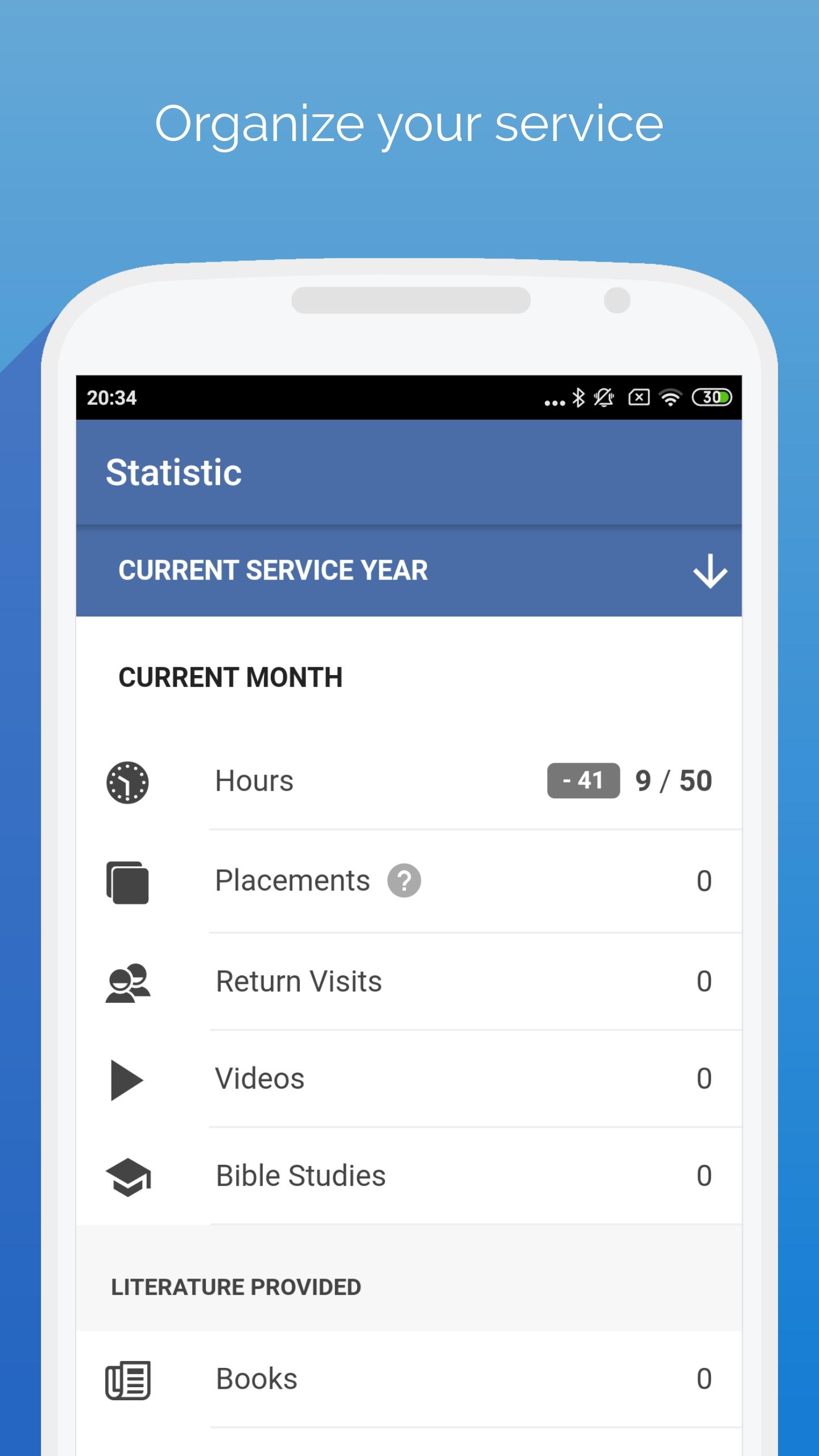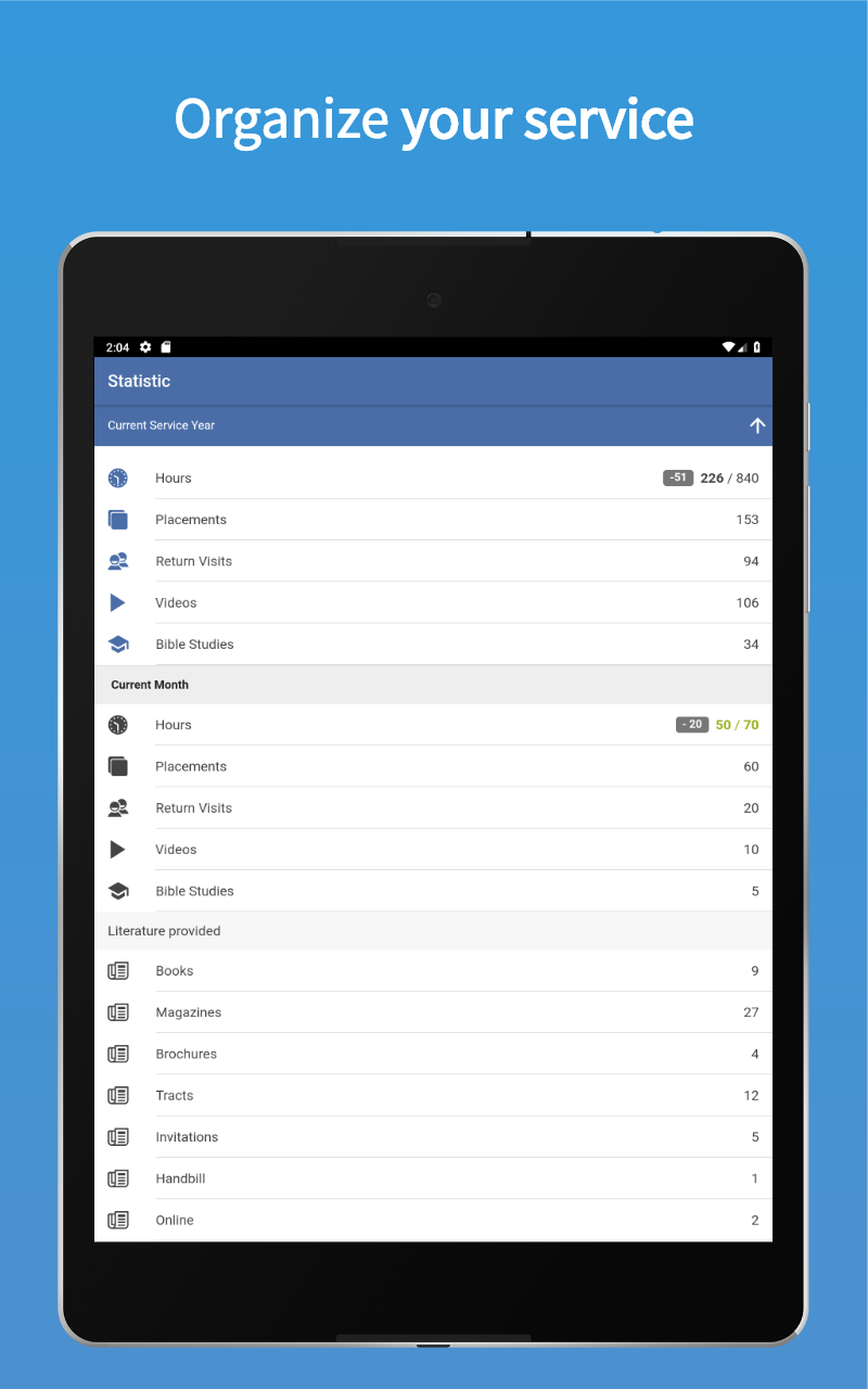 - Clear monthly and annual statistics on hours, fees, return visits, videos and studies