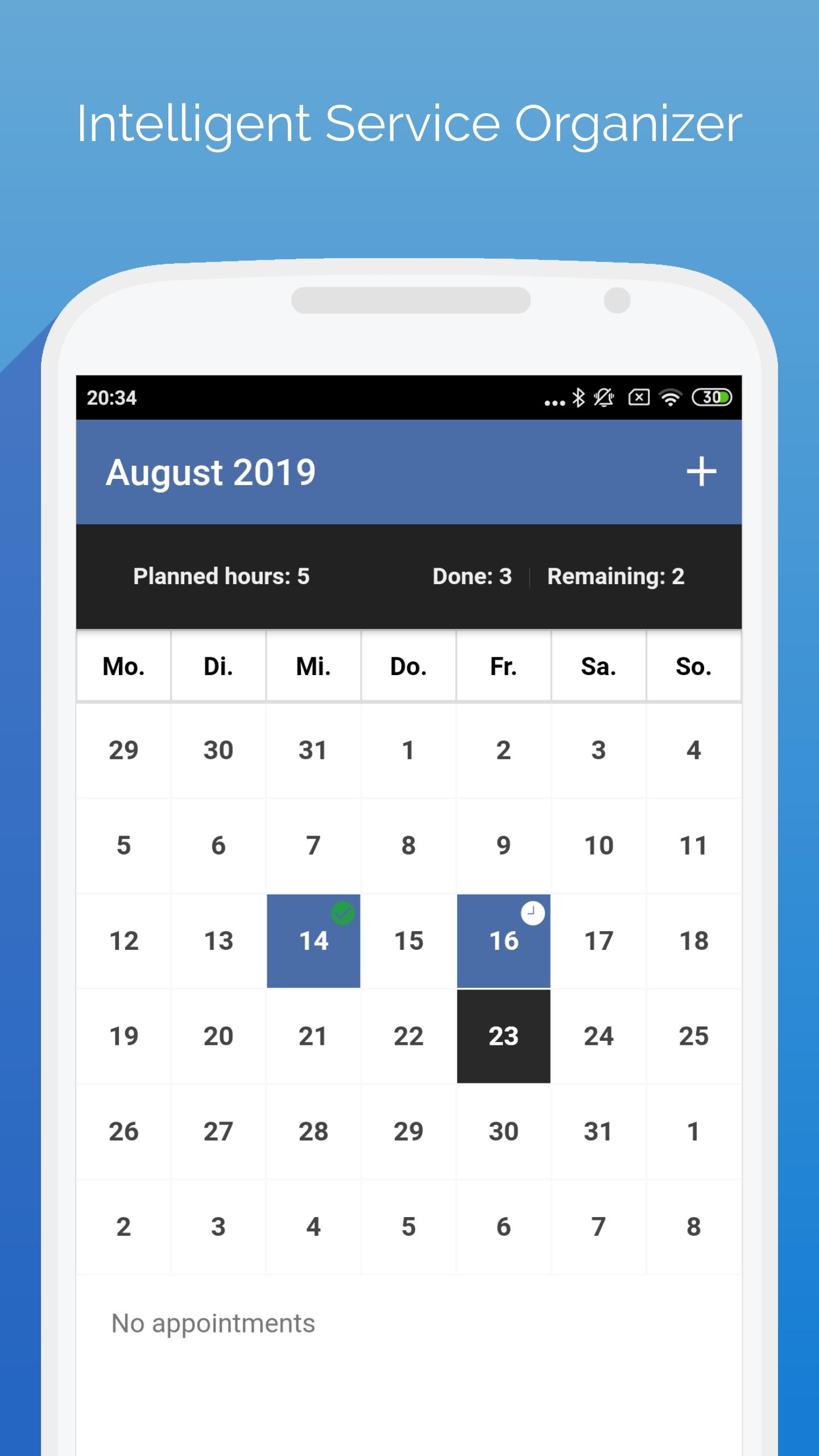 - Intelligent calendar to plan service hours, return visits, studies and service appointments