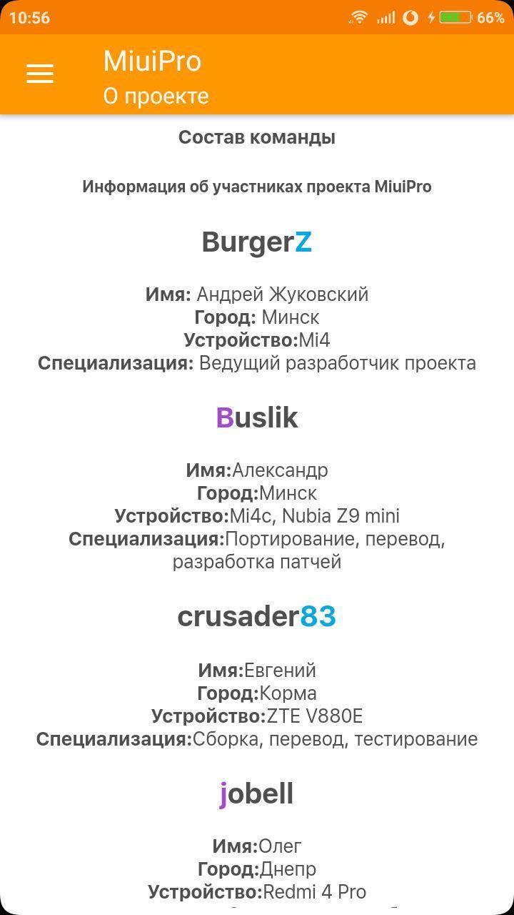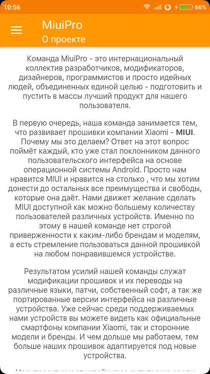 Команда MiuiPro - это интернациональный коллектив разработчиков, модификаторов, дизайнеров, программистов и просто идейных людей, объединенных единой целью - подготовить и пустить в массы лучший продукт для нашего пользователя. В первую очередь, наша команда занимается тем, что развивает прошивки компании Xiaomi - MIUI. Почему мы это делаем? Ответ на этот вопрос поймёт каждый, кто уже стал поклонником данного пользовательского интерфейса на основе операционной системы Android. Просто нам нравится MIUI и нравится на столько , что мы хотим донести до остальных все преимущества и свободы, которые она даёт. Нами движет желание сделать MIUI доступной как можно большему количеству пользователей различных устройств. Именно по этому в нашей команде нет строгой приверженности к каким-либо брендам и моделям, а есть стремление пользоваться данной прошивкой на любом понравившемся устройстве. Результатом усилий нашей команды служат модификации прошивок и их переводы на различные языки, патчи, собственный софт, а так же портированные версии интерфейса на различные устройства. Уже сейчас среди поддерживаемых нами устройств вы можете видеть как официальные смартфоны компании Xiaomi, так и сторонние модели и бренды. И чем дольше мы работаем, тем больше наших прошивок адаптируется под новые устройства. Наш проект имеет устойчивую аудиторию среди пользователей как на сайте, так и на форуме. Число приверженцев MiuiPro неуклонно растёт. И это позволяет нам быть уверенными в том, что результаты труда всей команды нашли своё признание среди широких масс. Мы полны идей и планов о том, как можно улучшить пользовательский интерфейс и комфорт от использования нашего продукта. Кроме того, в команду MiuiPro входят лучшие тестеры и портировщики, которые объединены одной целью - выпустить в свет совершенный продукт, не имеющий себе равных. Большинство наших модификаций, патчей и доработок являются уникальным трудом наших разработчиков и не имеют аналогов. И это только та часть проделанной работы, которая является видимой при использовании устройства. Кроме этого, прошивки от MiuiPro дополняются собственными кодами, оптимизирующими общую работу устройства, плавность интерфейса, экономию энергопотребления и многое другое. Оставайтесь с нами и мы гарантируем Вам удобство и комфорт, уникальные функции и модификации, удовольствие и хорошее настроение от использование прошивок MiuiPro