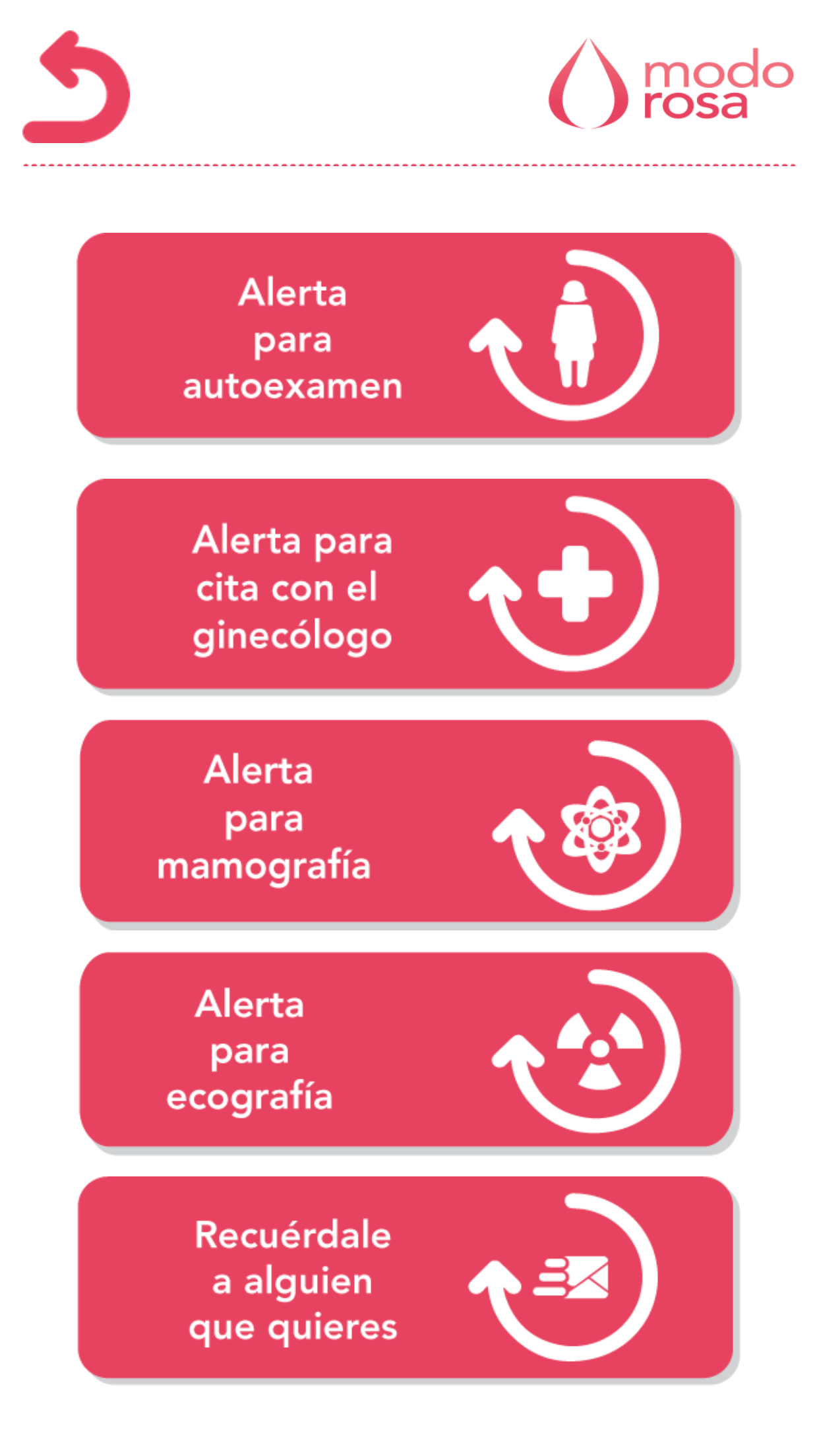 La Aplicación Modo Rosa se creó como una herramienta para asesorar a las mujeres, lograr la detección temprana y la lucha contra el cáncer de mama. Cada mes, este sistema te recordará cuándo realizarte el autoexamen de seno. Al detectarlo a tiempo se pueden salvar vidas, dado que una de cada ocho mujeres puede contraerlo, siendo el autoexamen la mejor manera preventiva que les sirve a las mujeres como señal de alarma para acudir donde el médico. Esta Aplicación cuenta con un sistema de alertas, el cual cada mes, 8 días después del período menstrual, te recordará la fecha para examinarte; de igual forma a las mujeres mayores les permitirá escoger una fecha específica para realizarlo. Para facilitar el proceso, contamos con un método de aprendizaje que te enseña el paso a paso con imágenes y un vídeo ilustrativo que te guiarán cómo examinarte. Recuerdas ¿cuándo fue la última visita al ginecólogo? o ¿cuándo te realizaste la última malograría y/o ecografía? El sistema de alarmas te permite también activar una alerta y así nunca olvidarás pedir tus citas de control.