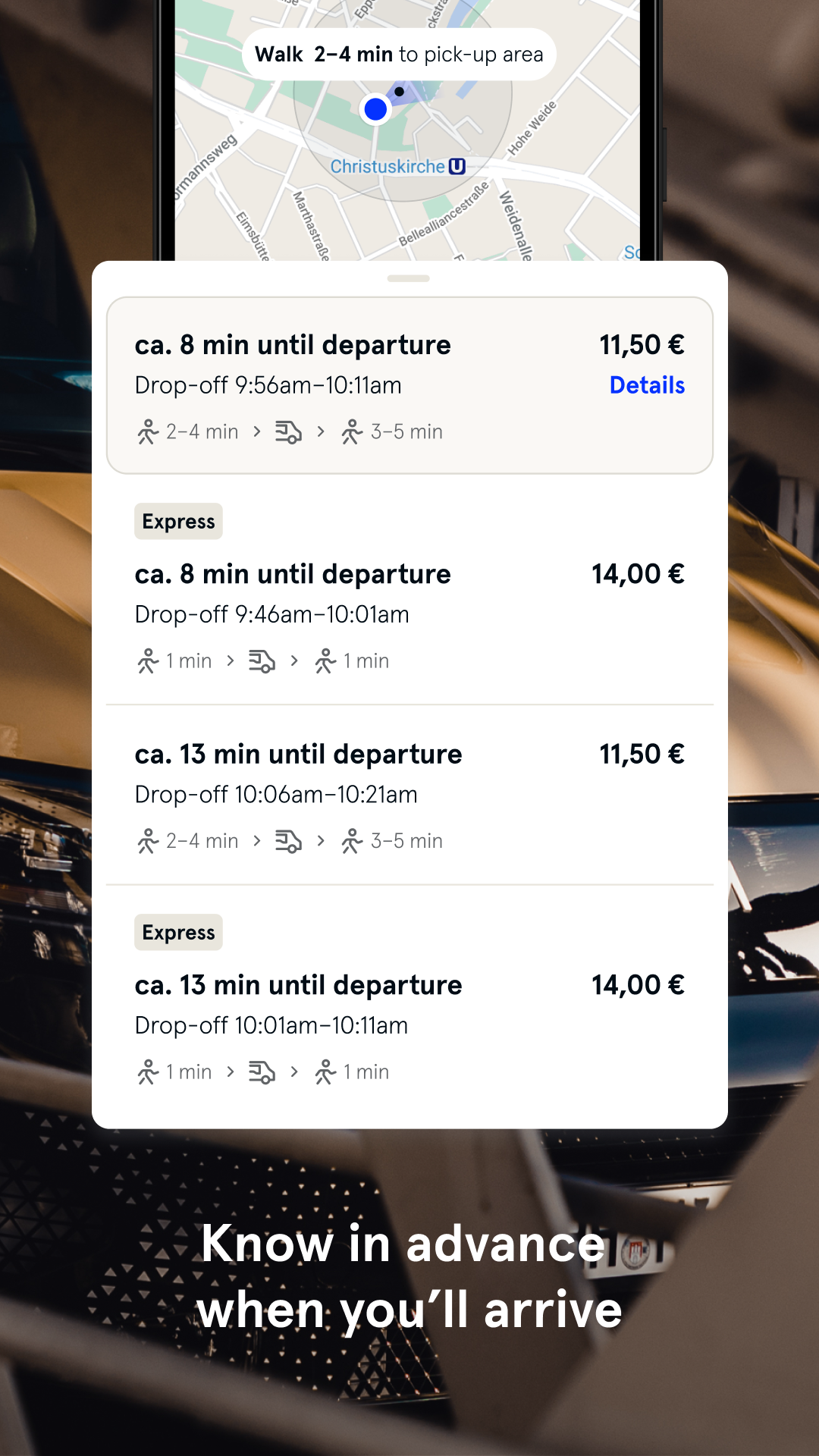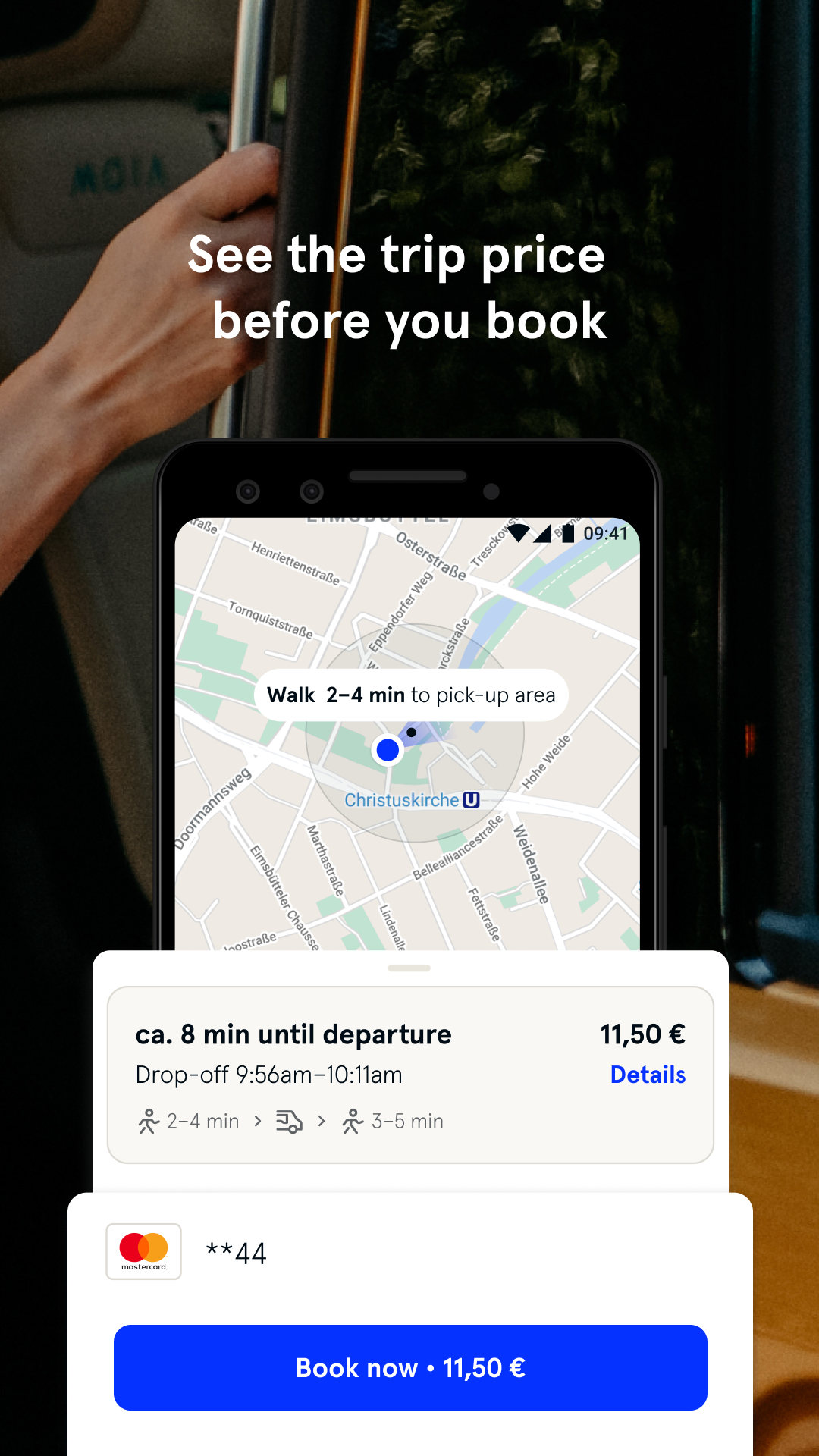 Leave your car behind, book your ride in the app, and pay by credit card,