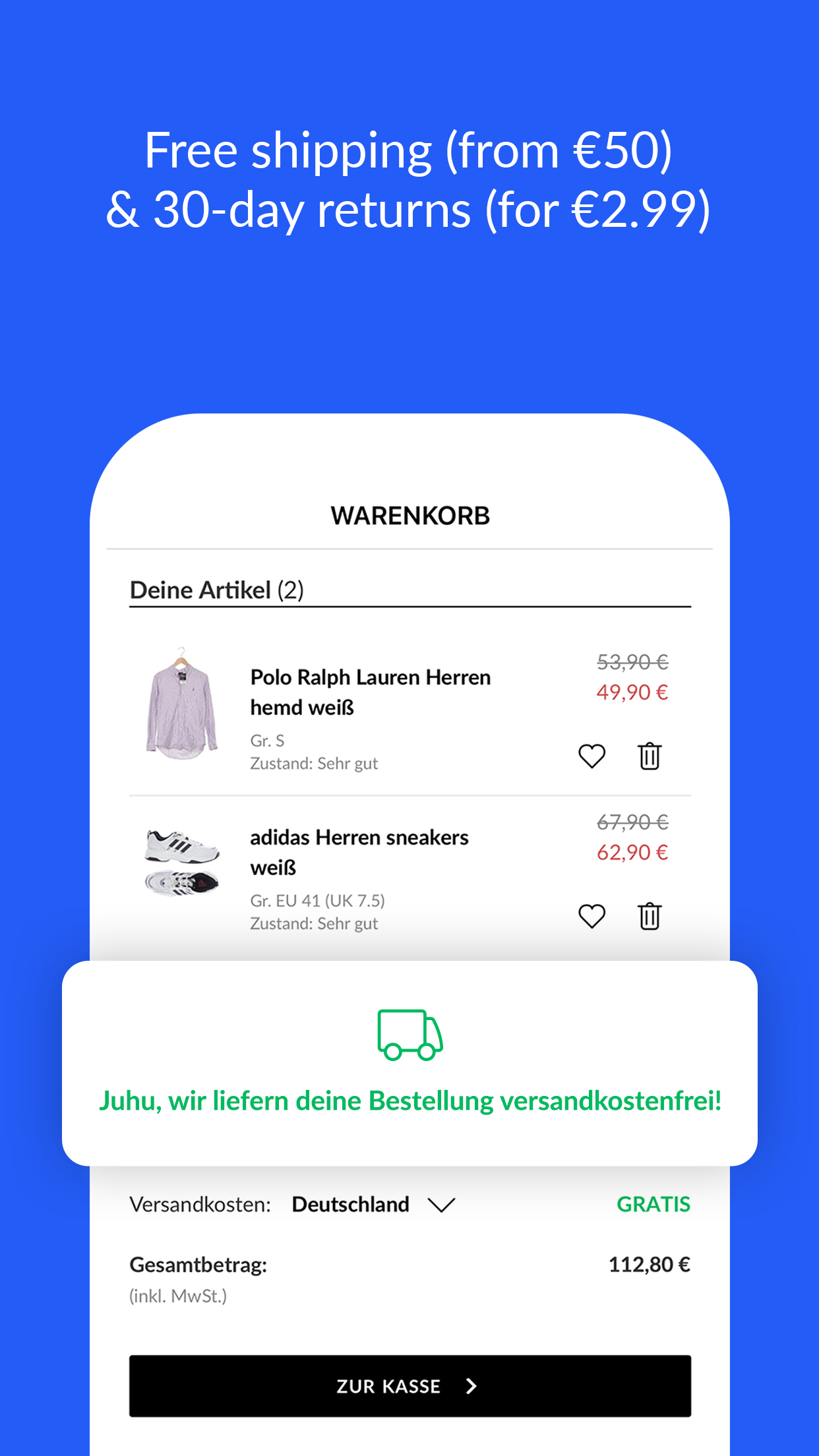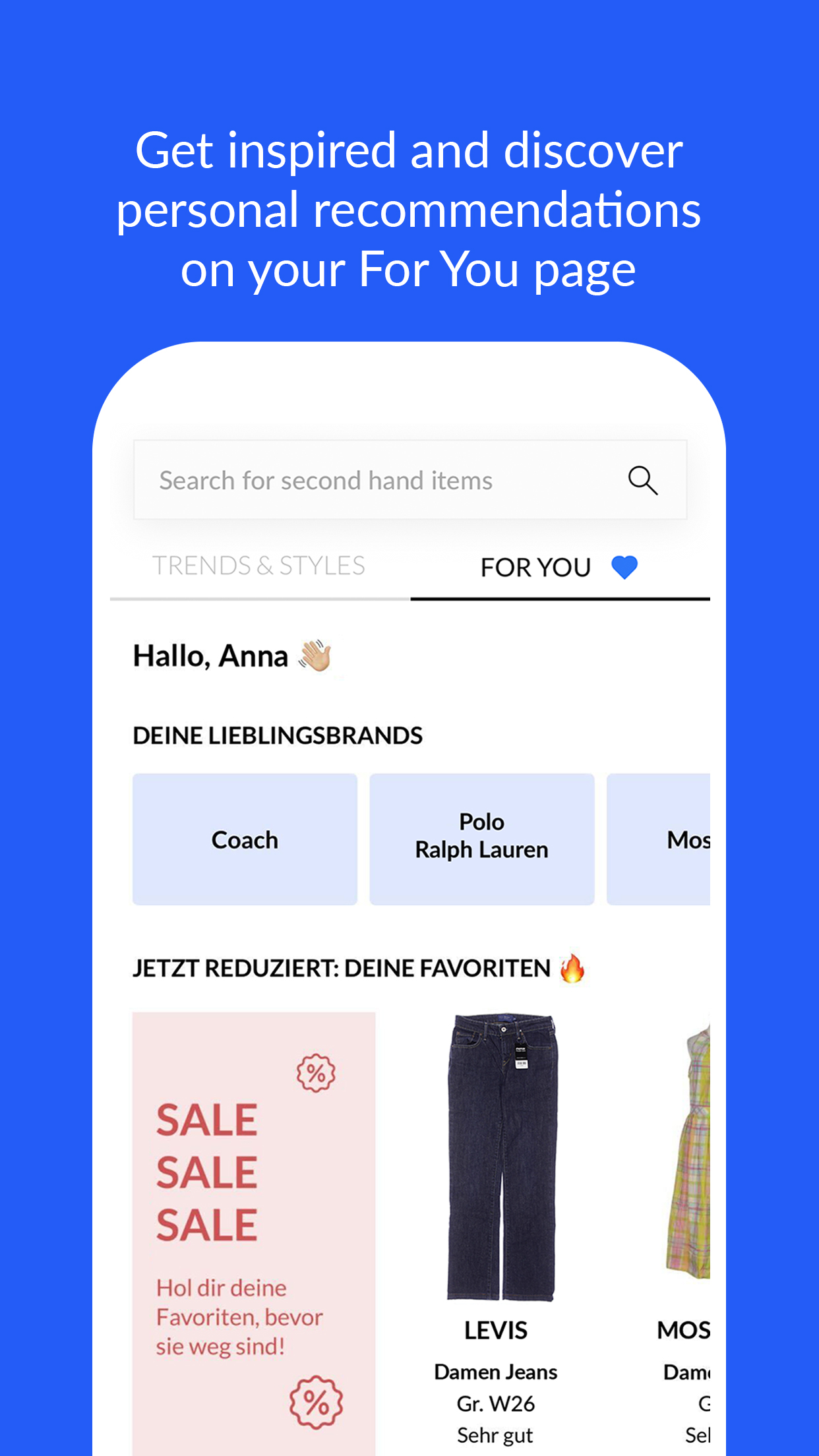 Enjoy momox fashion - your store for high quality second hand fashion 👚 With the momox fashion app you can buy pre-loved clothes & shoes for every taste in the best quality without any stress. In the app you can easily browse through all the sections that a good online store has to offer. Look forward to a huge selection of pre-owned clothes. The store offers you the latest trends and classics in the categories children's fashion, women's fashion and men's fashion. Whether vintage, lounge, maternity or oversized - discover fashion in all shapes and styles for winter and summer. The filter functions allow you to search specifically for brands, sizes and more. You get all this at a significantly lower price than when purchasing new items. It makes shopping fun! ▶ Choose from a large selection of second hand fashion ▶ Find clothing shoes and accessories for men, women and kids 👟💼🧥 ▶ Over 1,000,000 available pieces that are updated daily ▶ More than 2,000 brands ▶ Careful manual checks on the quality and authenticity of all pieces ▶ Free shipping from 25 € 📦 ▶ Free return shipping 📦 ▶ Payment by invoice or PayPal 🛒 ▶ €20 voucher for new customers Out of love for the environment. Out of love for fashion 🌍🌱 We think that sustainability doesn't have to be a burden, but rather a joy. That's why we combine our love for nature with our love for fashion and pass on high-quality fashion to your closet. This is how you contribute to sustainability with every purchase at momox fashion. Where do the clothes from momox fashion come from? You can sell well-preserved clothing to us quickly and easily on momox.com. A quality control team checks all sent pieces by hand for quality and originality. Our goal: You love each piece of pre-owned clothing just as much as you would love a new one. We follow a strict selection process. If it meets our quality standards, you will find the unique piece in the momox fashion store. How does shopping at momox fashion work? 📱 At the flea market the hunt for cheap clothes is often associated with stress. Buying on online platforms is more relaxed, but doesn't always offer the required security. With the intelligent filter function of momox fashion you can find what you are looking for immediately in a fast and safe way. You pay conveniently by invoice or PayPal and benefit from free shipping. Do you want the fashion of ELLE, VOGUE and Co? No matter which designer combination captured your heart in the latest magazine: momox fashion offers you all unique pieces for every combination and every budget. With the app you can find the latest trends from fashion bloggers, timeless blazer from Polo Ralph Lauren, blouses from Zara and trendy coats from Massimo Dutti. In the mood for a natural look? Use the filter functions to find everything that your fashion heart desires. Stylish looks for sporty combinations are offered by Abercrombie & Fitch and matching accessories such as bags, backpacks, fanny packs, scarves and wallets are offered by Liebeskind Berlin and many other brands. Hugo Boss offers a cool suit for the next business trip and elegant basics for the office. Whether outdoor activities on the weekend or sporty hours at home: The North Face or Levi's are reliable labels for jeans, jackets, coats, sweaters and T-shirts. Eye catching footwear is offered by Dr. Martens. Also plenty of street style sneakers and elegant shoes are available in the online store. More to love? Choose your size and find what you are looking for. In addition to fashion from H&M, other brands also have great individual pieces in plus sizes. If you love elegance, take a look at Madeleine, for more sustainable fashion you can check out Armedangels. If you like it more playful, you will find something suitable at Blutsgeschwister or Qiero. Kids will find what they are looking for at Jako-o and other brands!