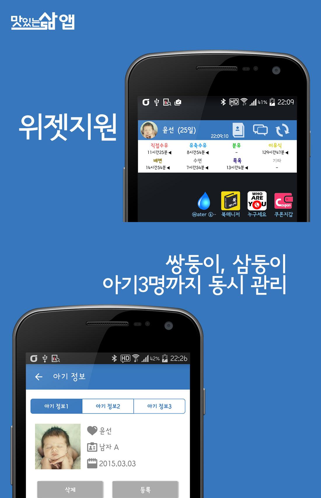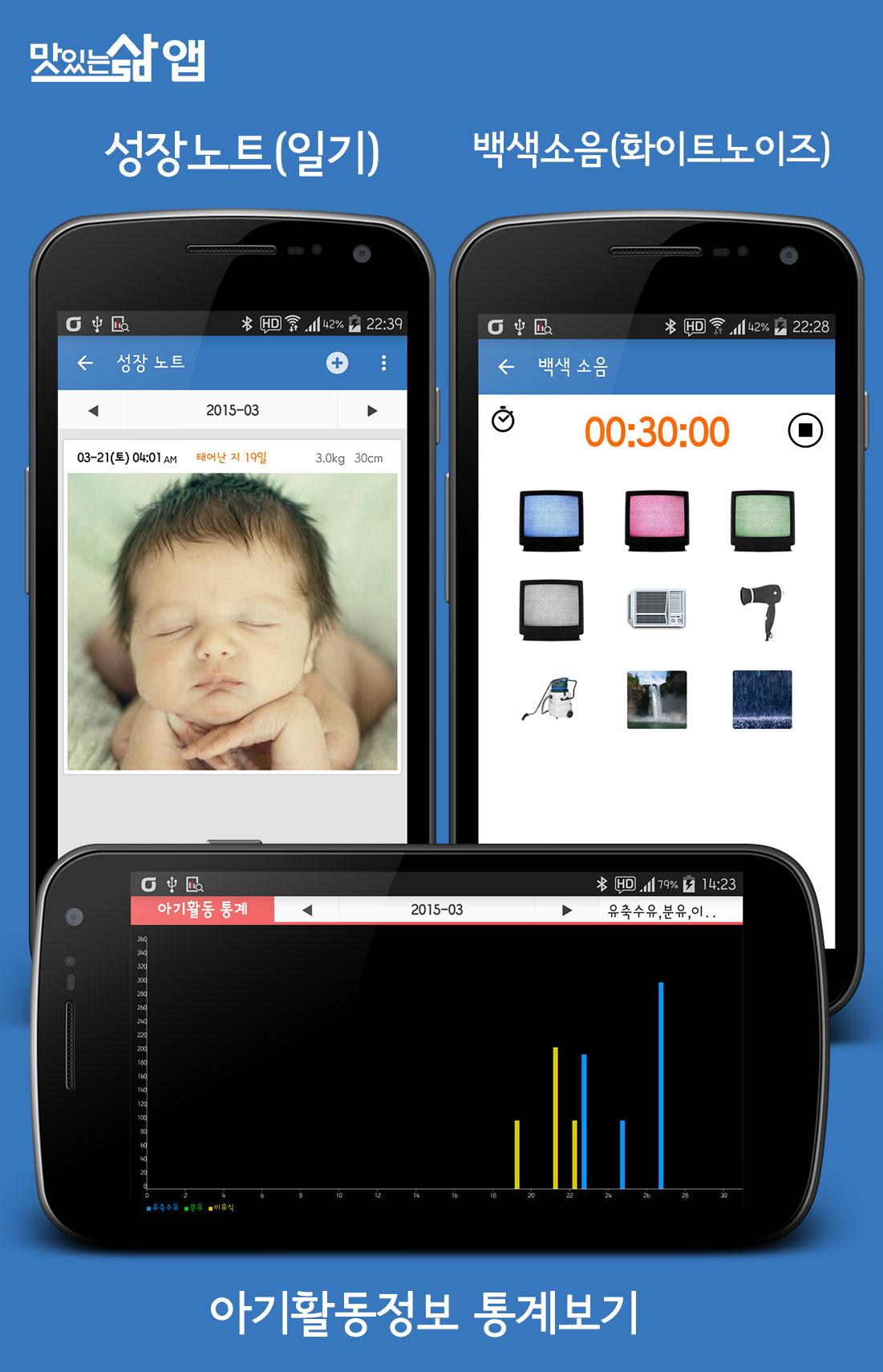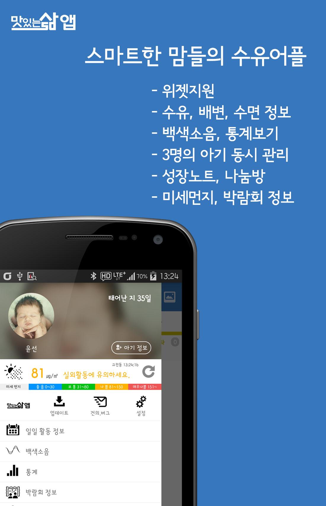 ※ Key Features - Widget support - Record the various activities ◎ feeding - breastfeeding, breast pump, dry milk, baby food ◎ defecation - pee, poo, pee and poo ◎ sleep ◎ other - body temperature, bath, other - Time display (the last time, total, time-Term) - Data management (backup, restore, automatic backups, data cleanup, and initialization) - White Noise - Supports baby up to 3 - Statistical Information (day-to-day activities, activity statistics, weight, and key statistics) - Growth Notes (weight, key growth information entered and notes, published) - Password protection