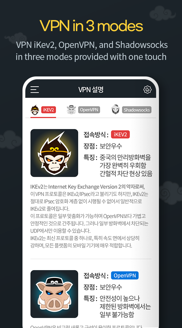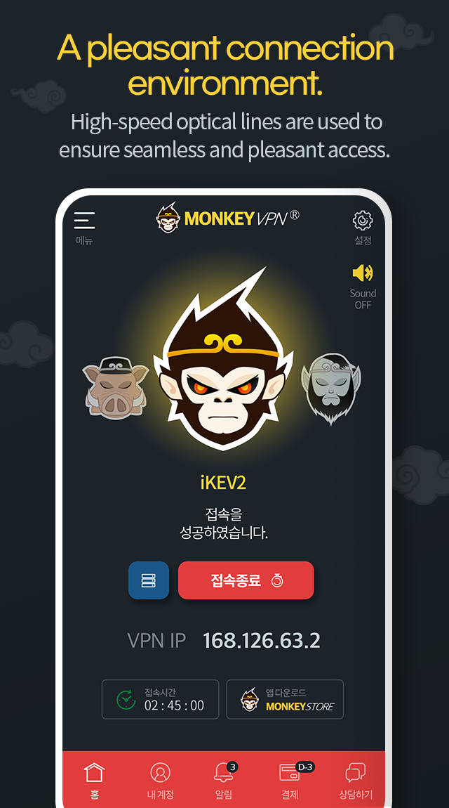MonkeyVPN is the only solution that guarantees high-speed Internet access even in China or countries with Internet control. IKEv2, Shadowsocks, and OpenVPN provide all types of connections. [Monkey VPN Features - One-click Access, High-Speed Access, Security 100%] 1. Use various connection methods. - Monkey VPN has three different ways of connecting: Sonogong, Jeopalgye, and Saojeong. : It supports IKEv2, OpenVPN, and ShadowSocks connection methods. - You can access it in one second without complicated settings. - Protect your personal information and your device. - Monkey VPN protects the connection of the device while connected to public Wi-Fi hotspots, cellular data networks, and other public places. Encryption, personal data, and web search records are secured and protected from hacker attacks. 2. High Speed High Speed VPN - Monkey VPN is very fast! Automatically connect to the fastest server. - Due to the automatic connection, your VPN connection can use 90 percent or more 10 times faster than other VPNs. 3. Customer support - MonkeyVPN responds to your problem whenever needed. To receive the best free customer support of your class, please leave a message on the Monkey VPN Monkey VPN app or on the official website and we will respond as soon as possible on the sales base date. 4. Available on Windows, Android, iPhone, and iPad. - One ID can be used on both iPhone and iPad through device change. It can also be used on all platforms such as laptops and desktops. 5. Thousands of server IP support - You can use fast VPN through various servers. - The list of countries and servers is extensive and will continue to be added! Purchase in-app: You can become a premium user through subscription.